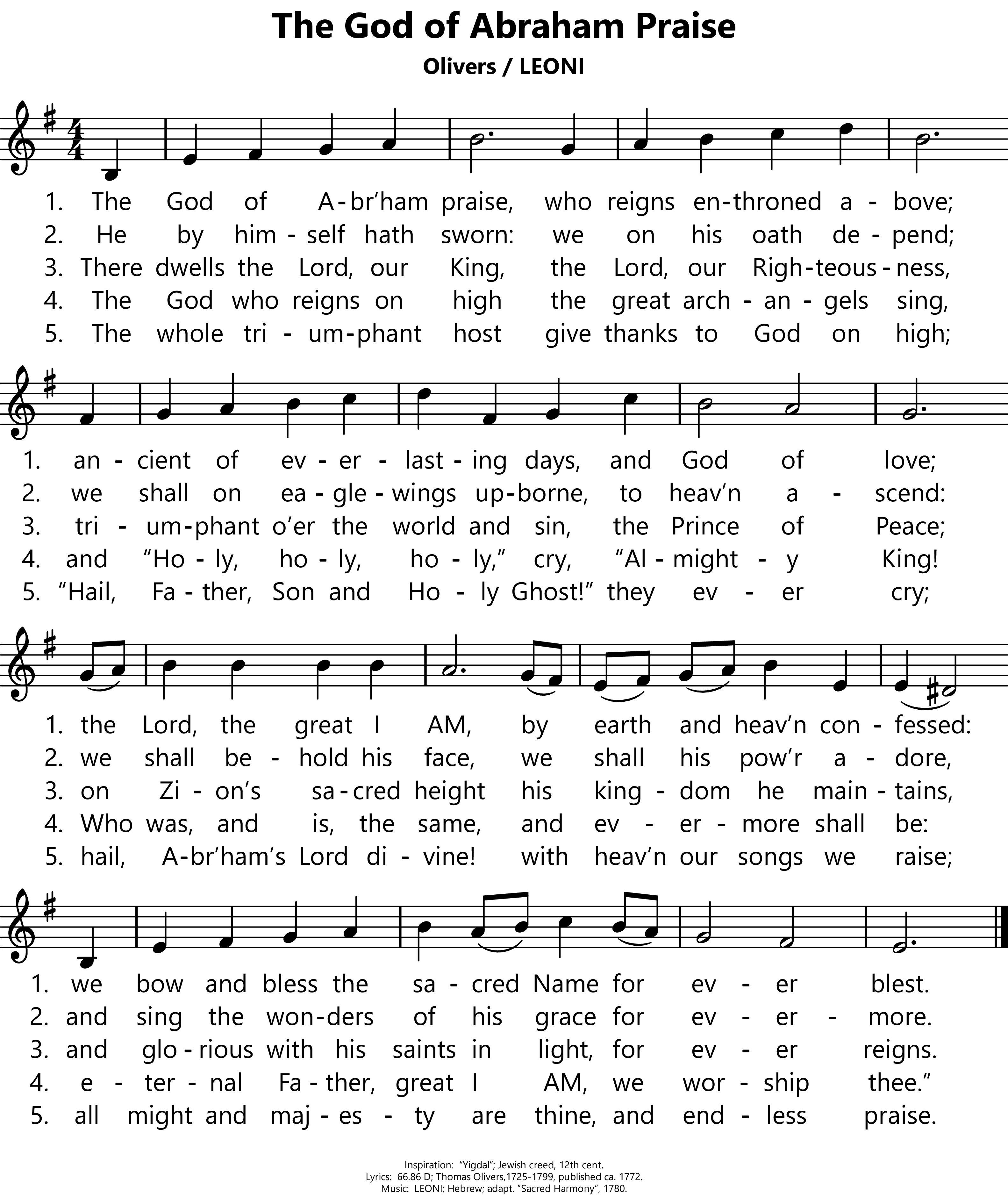 | The God of Abraham Praise | LEONI | CWB2:617 J2:602 • W4:601 |