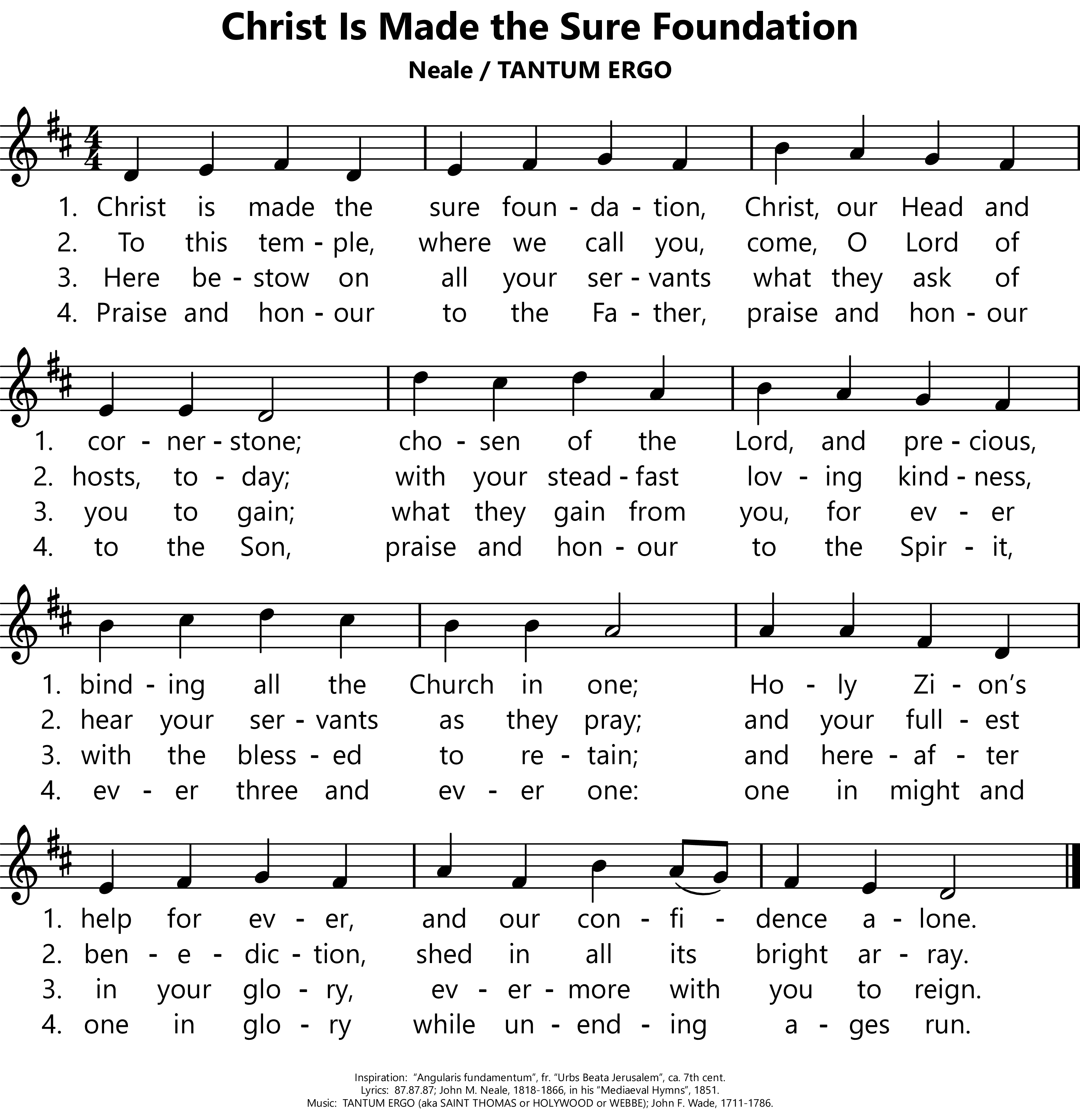 | Christ Is Made the Sure Foundation | TANTUM ERGO | CWB1:640 • GA:482 J3:747 • W4:732 |