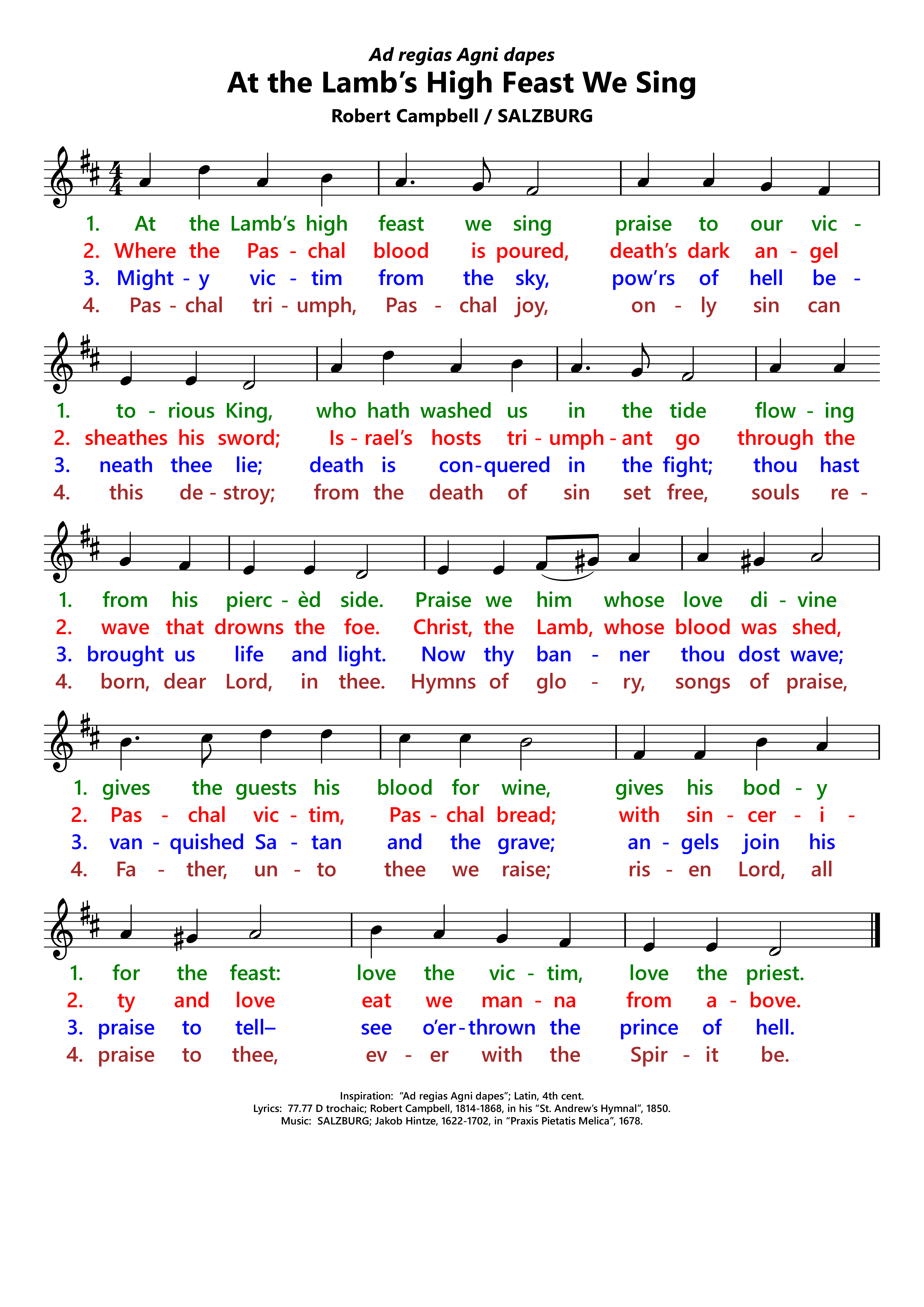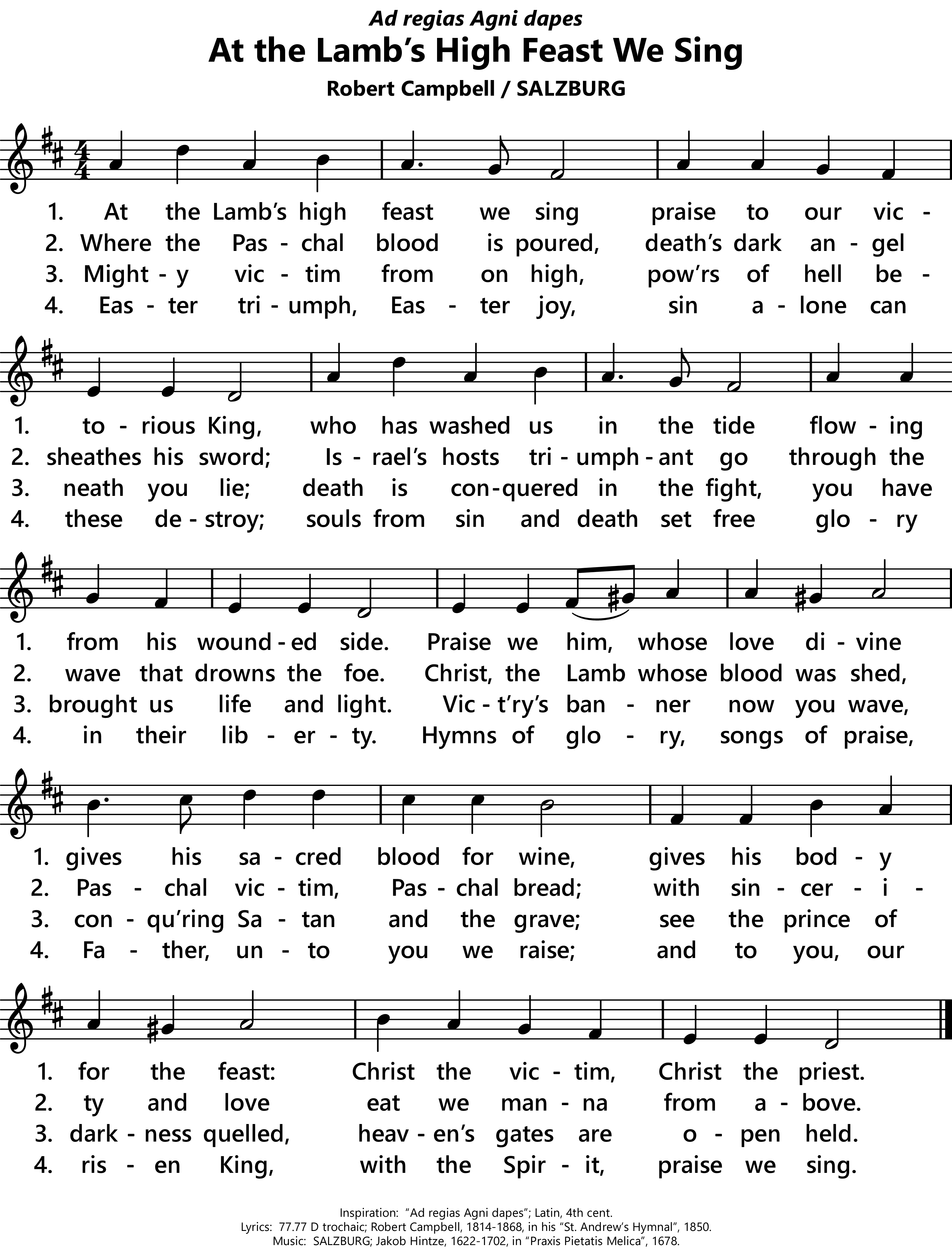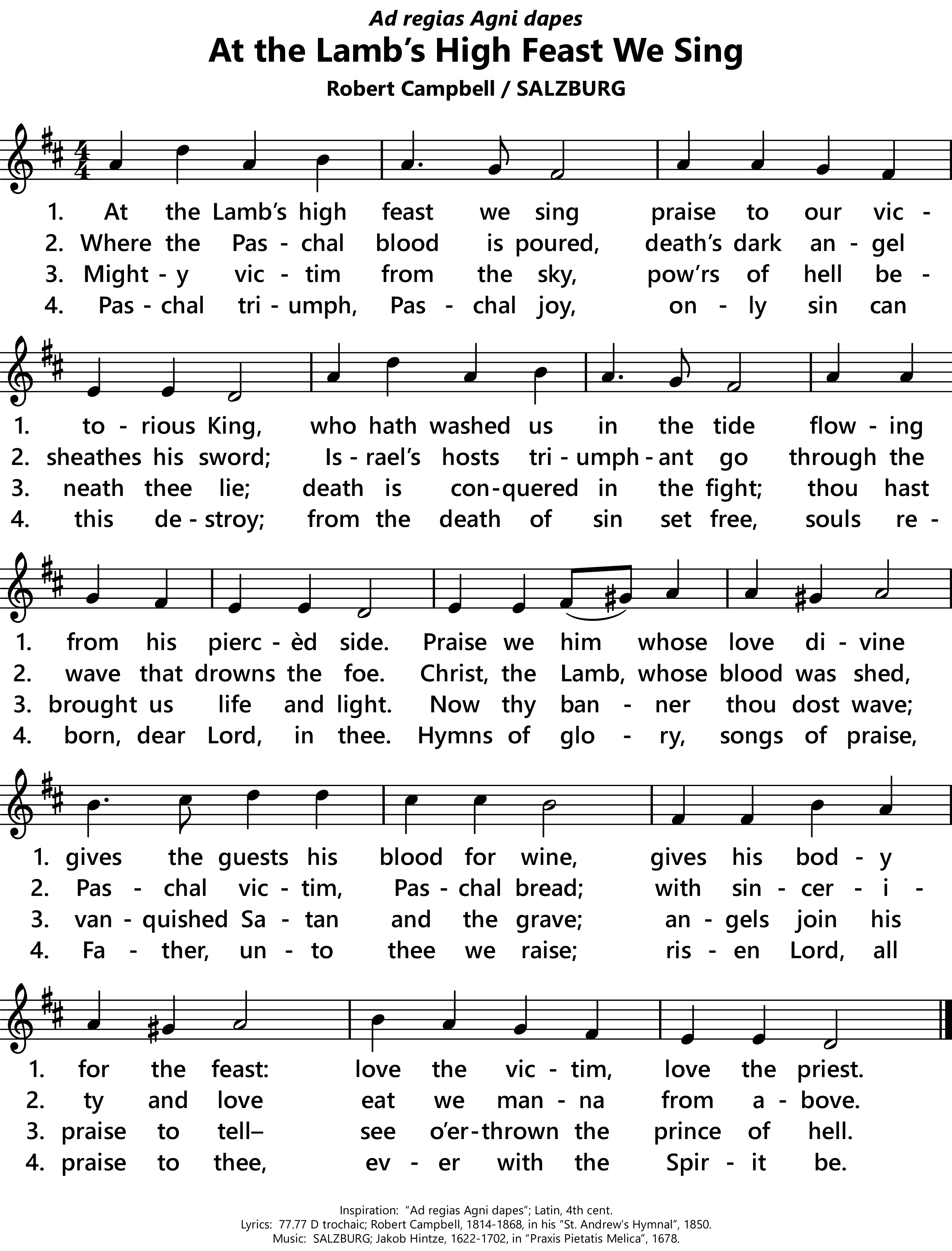| Hymnals: | CWB2:341 • NLP:23 Divine Office 1974: 35 (28) / Eastertide I • CHE:58 • CBW3:375 H22:290 • J2:424 • J3:407 • W3:459/460 • W4:512 |