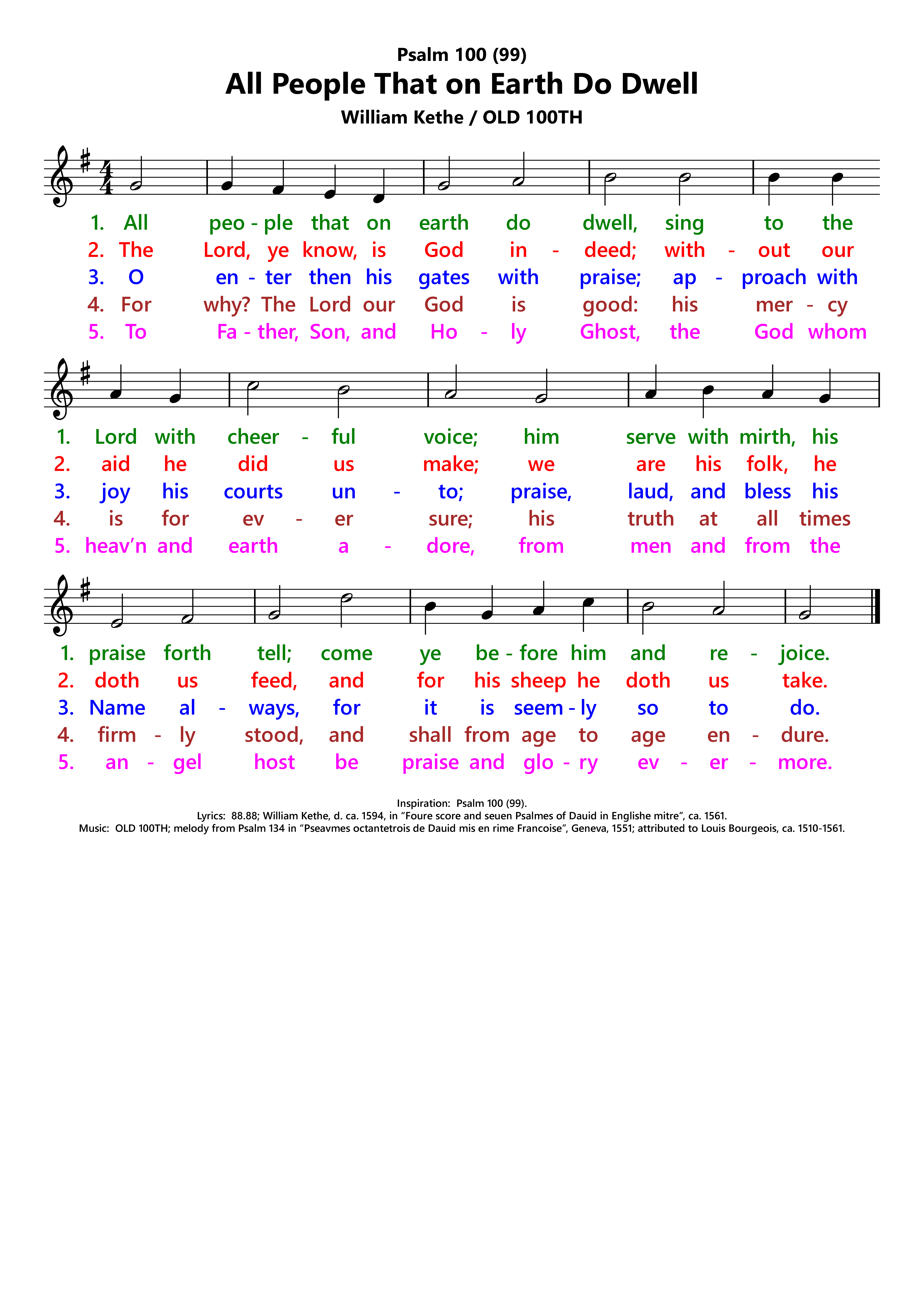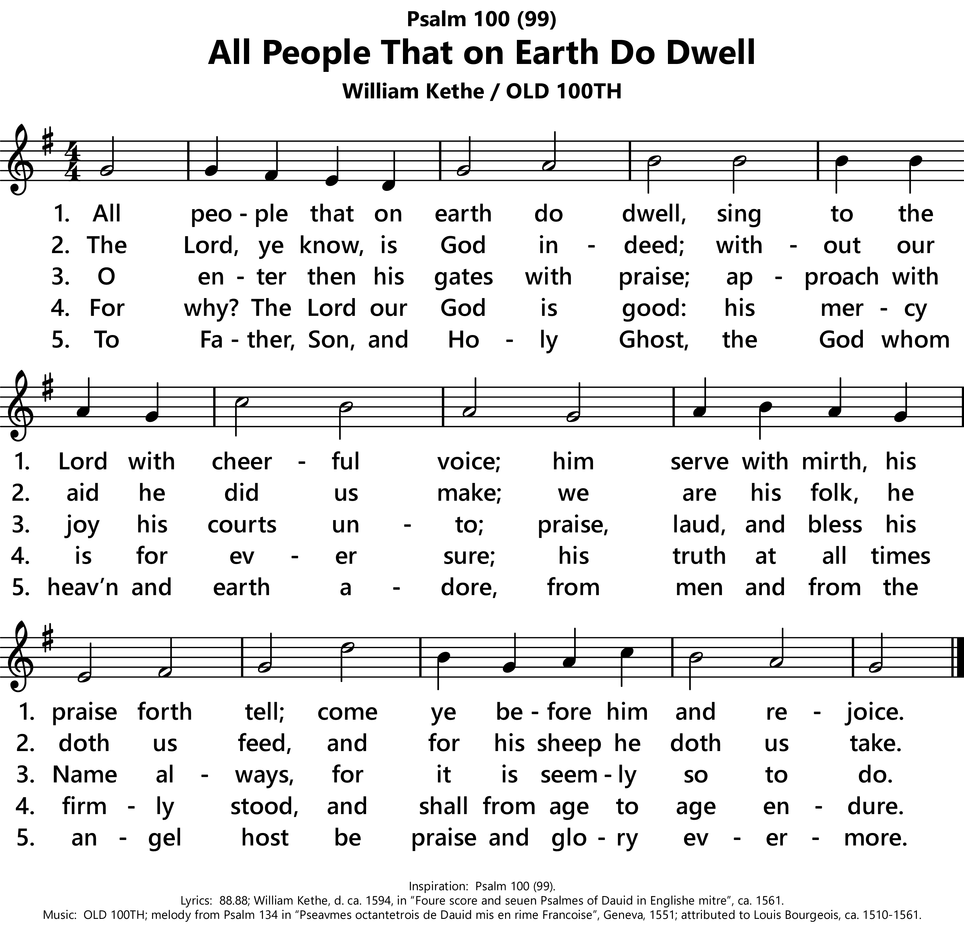 | Lyrics: | William Kethe, d. ca. 1594, in Foure score and seuen Psalmes of Dauid in Englishe mitre, Geneva, 1561. |