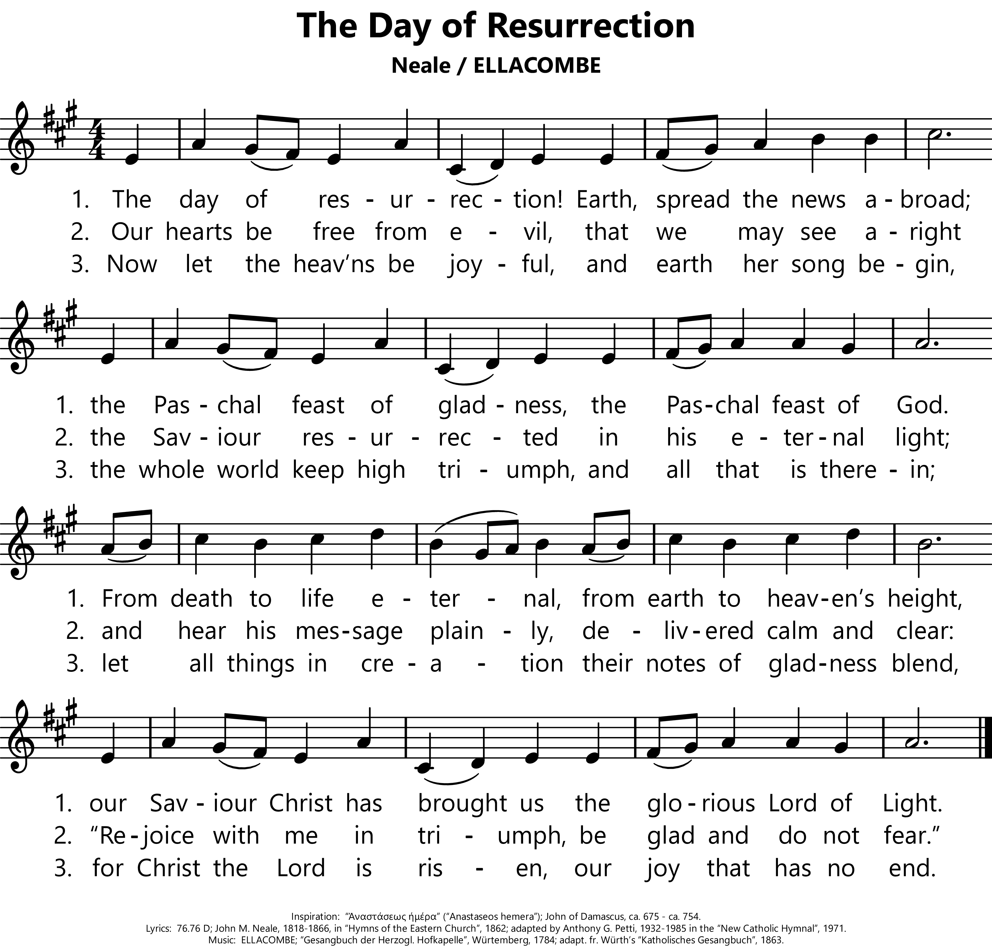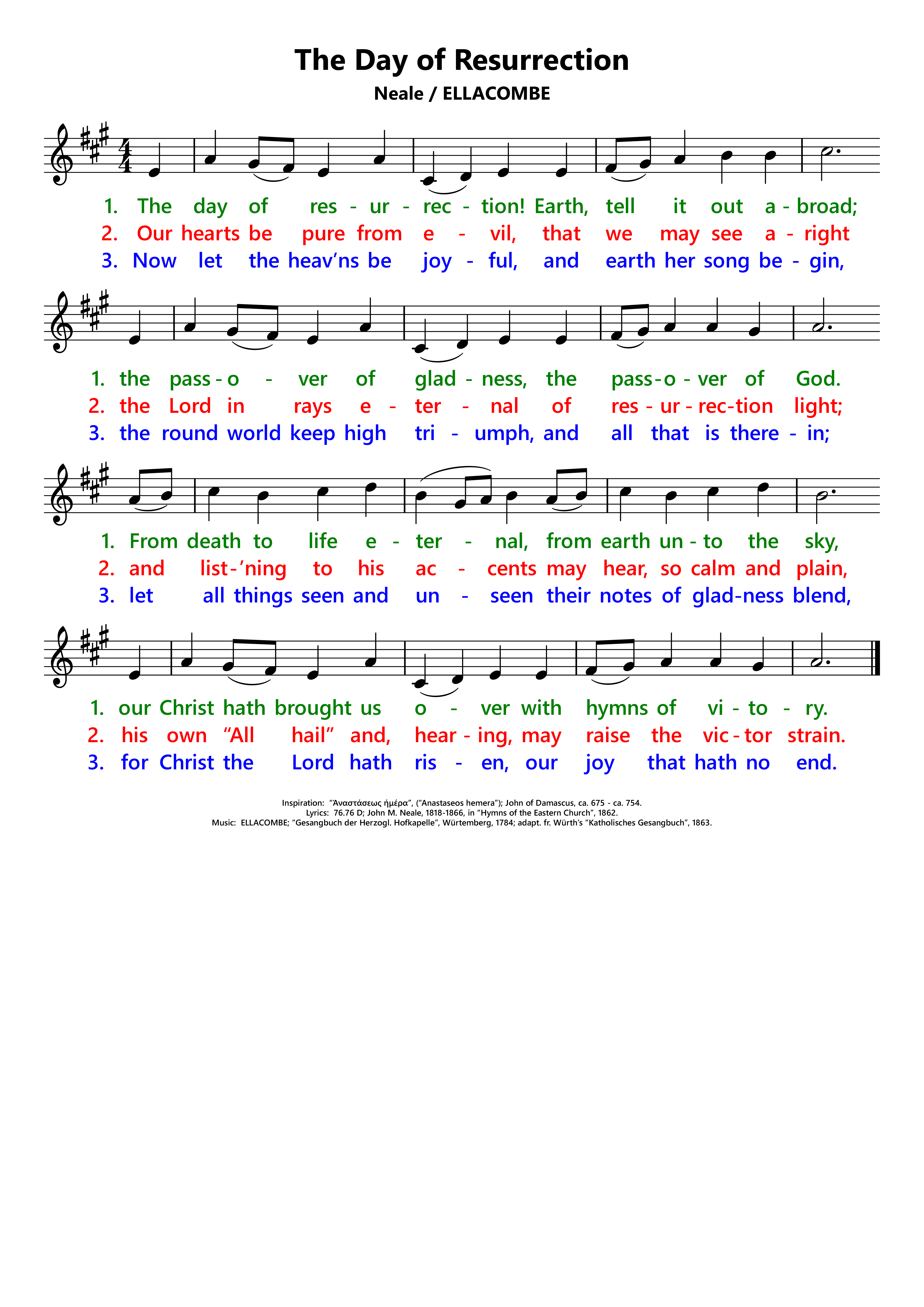 | Inspiration: | Άναστάσεως ήμέρα (Anastaseos hemera); John of Damascus, ca. 675 - ca. 754. |