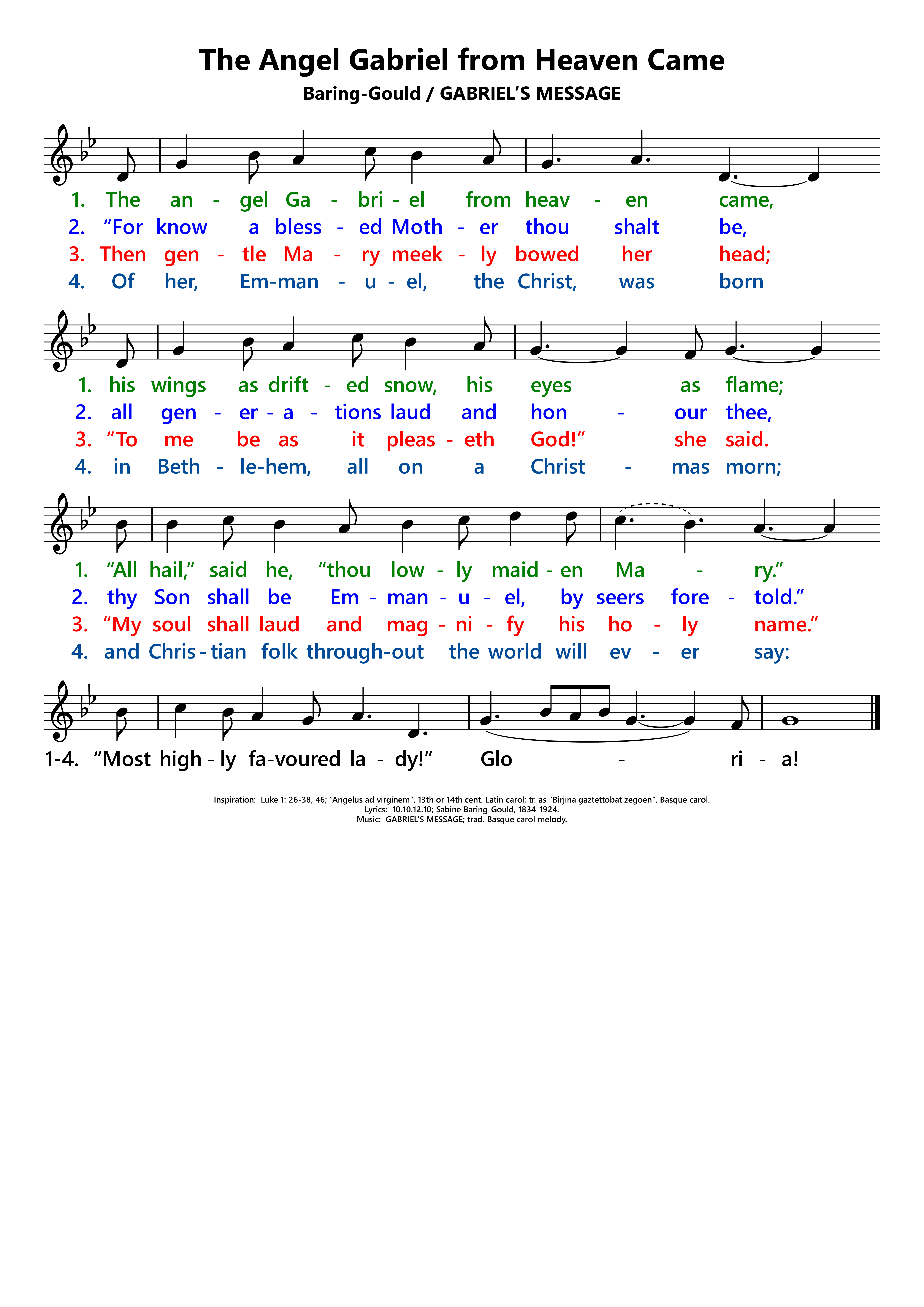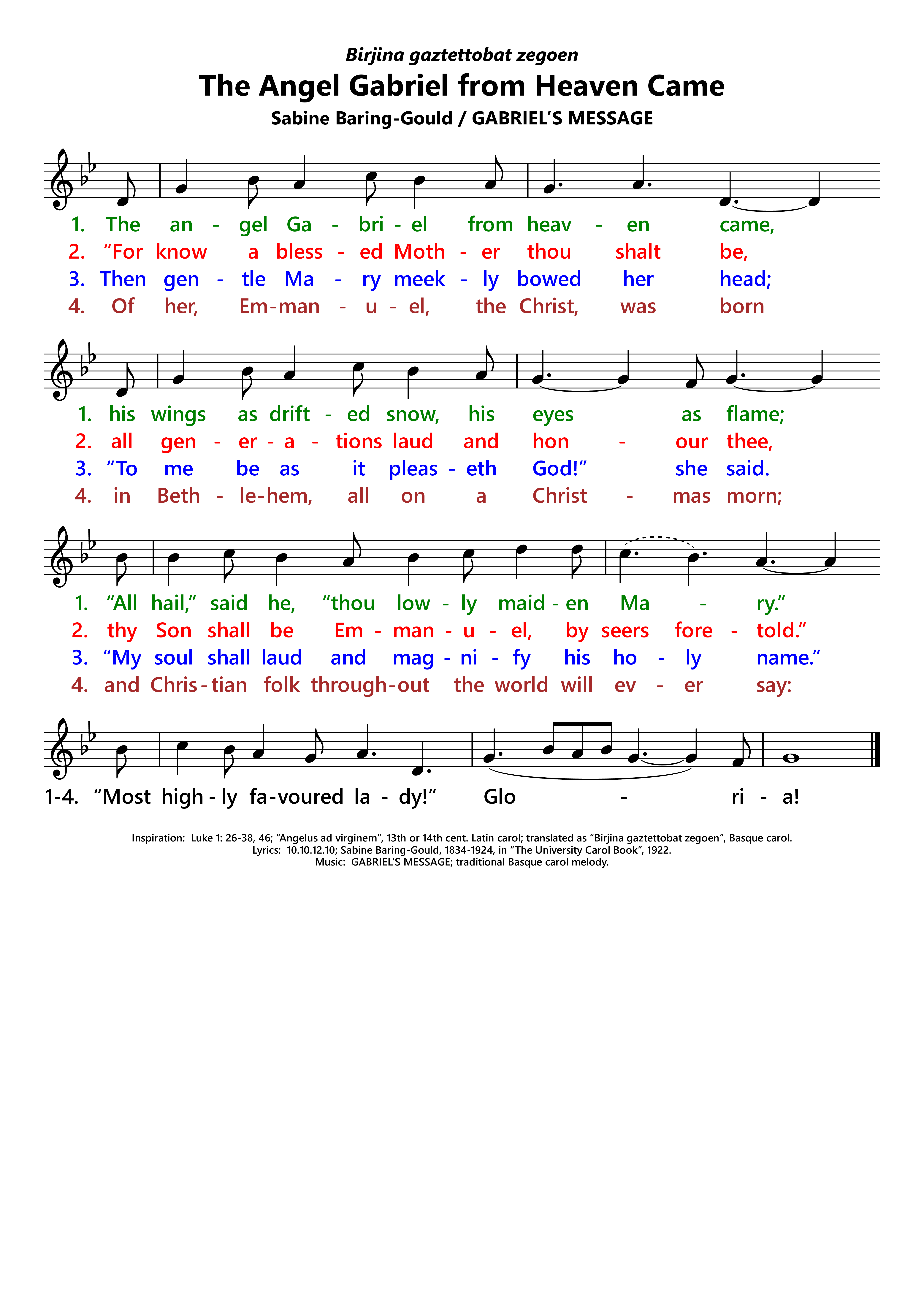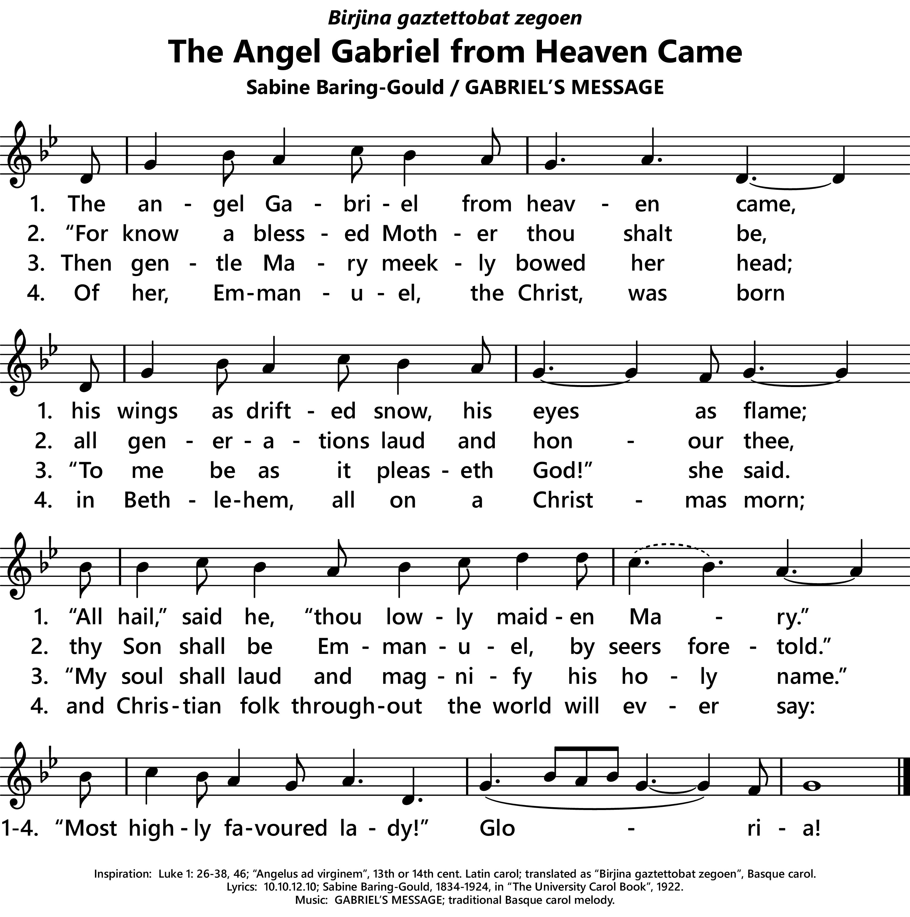 | Inspiration: | Luke 1: 26-38, 46; Angelus ad virginem, 13th or 14th cent. Latin carol; translated as Birjina gaztettobat zegoen, Basque carol. |