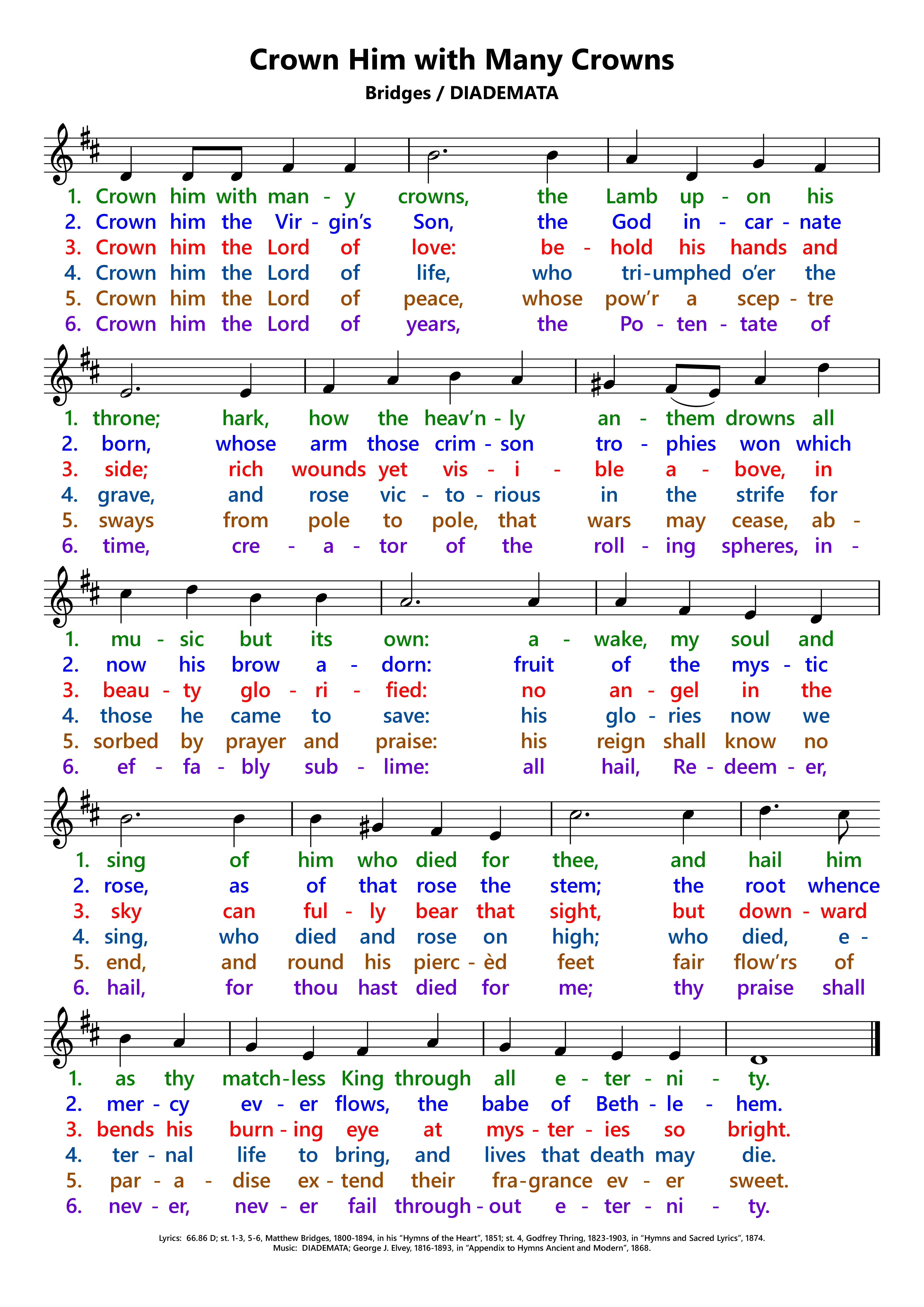 | Lyrics: | st. 1-3, 5-6, Matthew Bridges, 1800-1894, in his Hymns of the Heart, 1851; st. 4, Godfrey Thring, 1823-1903, in Hymns and Sacred Lyrics, 1874. |
