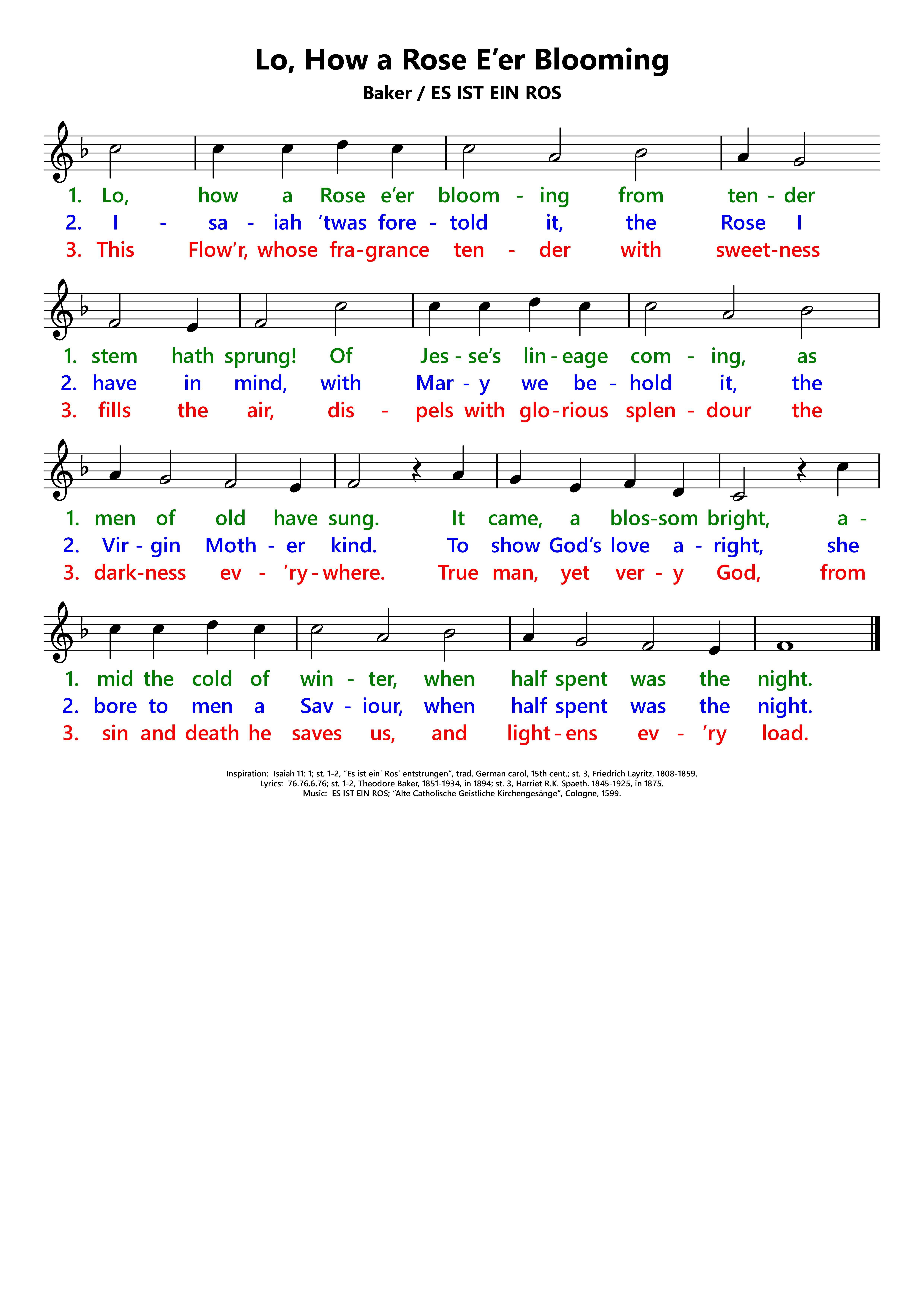| Lyrics: | st. 1-2, Es ist ein’ Ros’ entstrungen, trad. German carol, 15th cent.; st. 3, Friedrich Layritz, 1808-1859. |