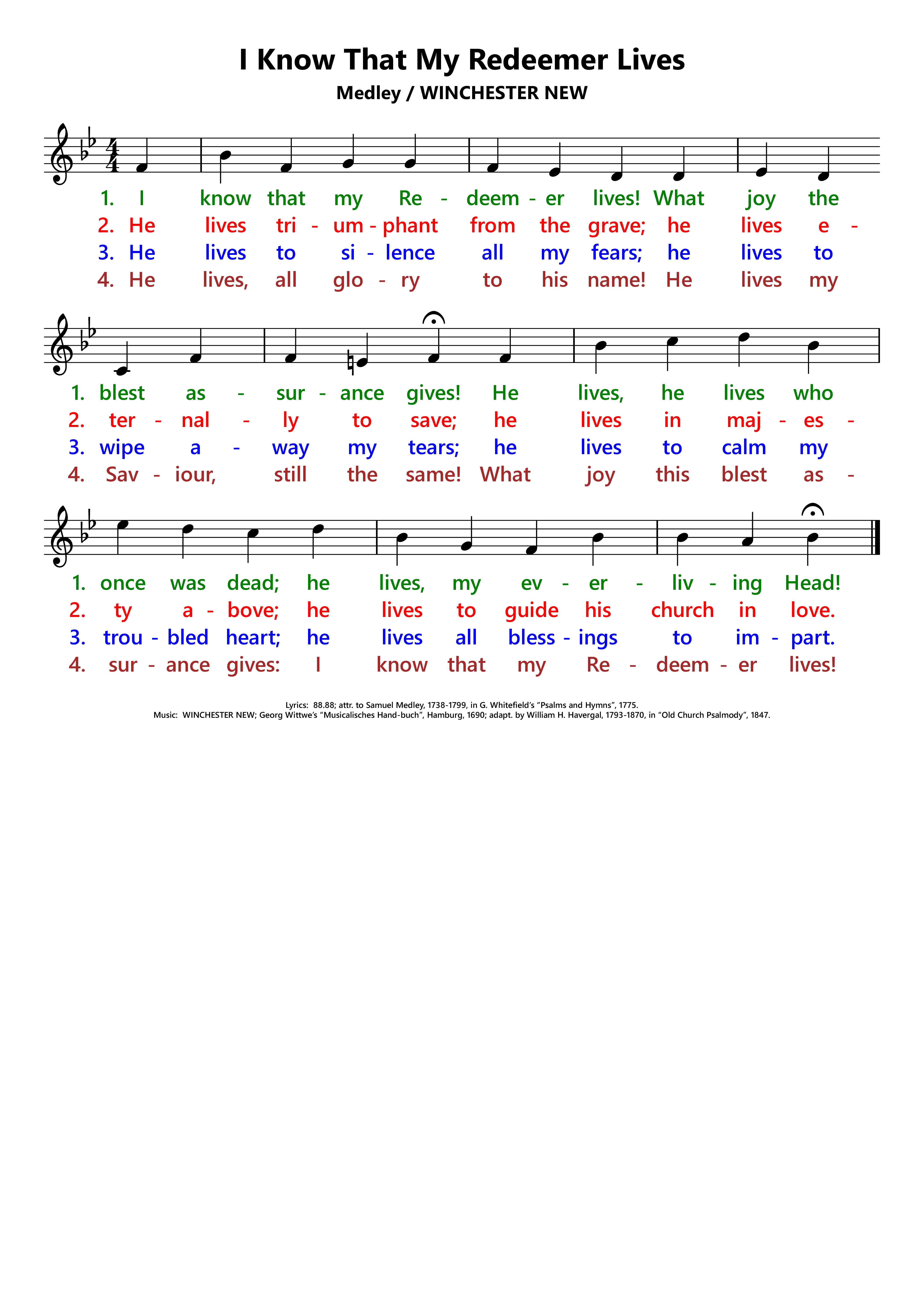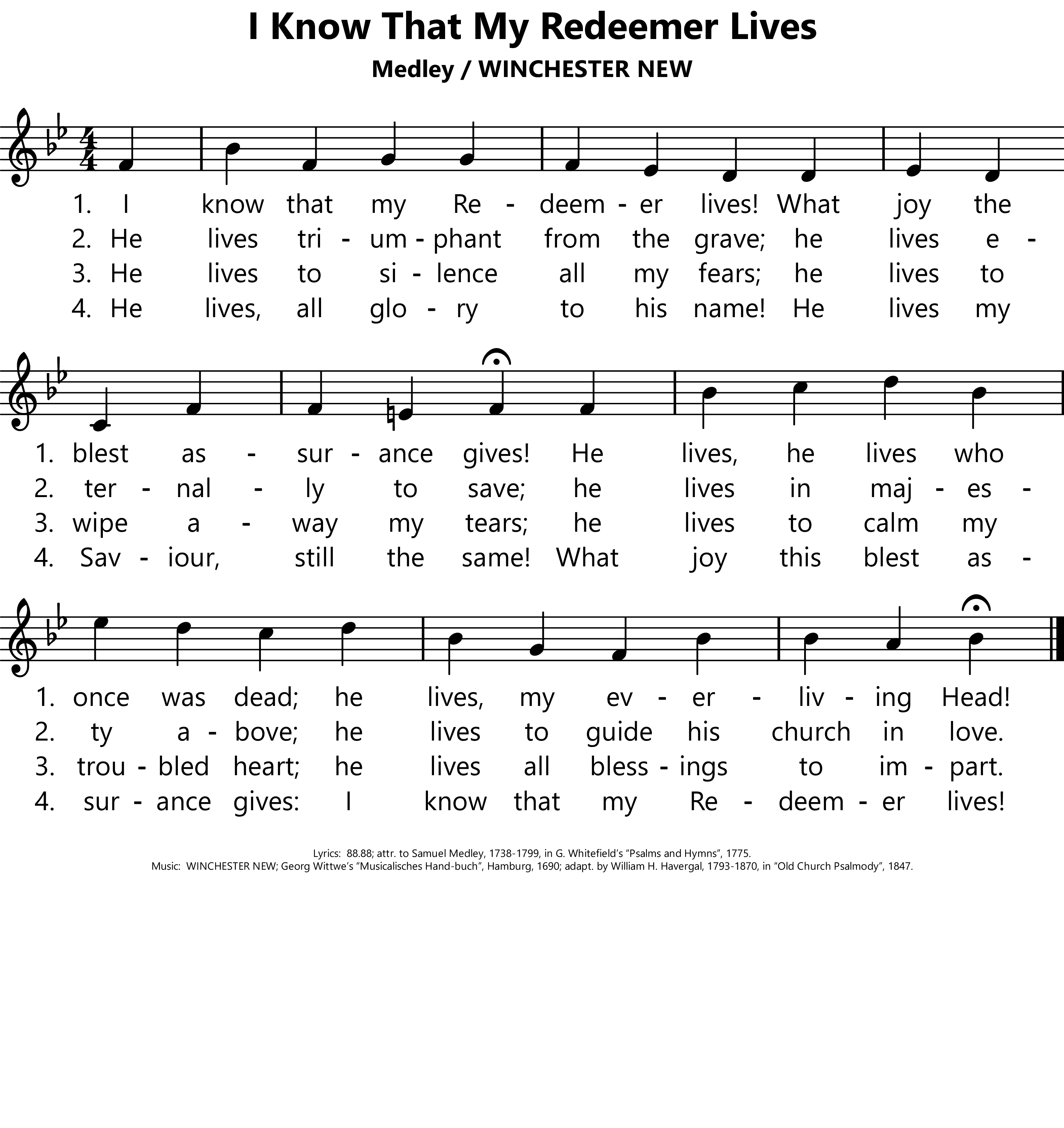 | Composer: | Georg Wittwe’s Musicalisches Hand-buch, Hamburg, 1690; adapted by William H. Havergal, 1793-1870, in Old Church Psalmody, 1847; harmonization by William H. Monk, 1823-1889, in Hymns Ancient and Modern, 1861. |