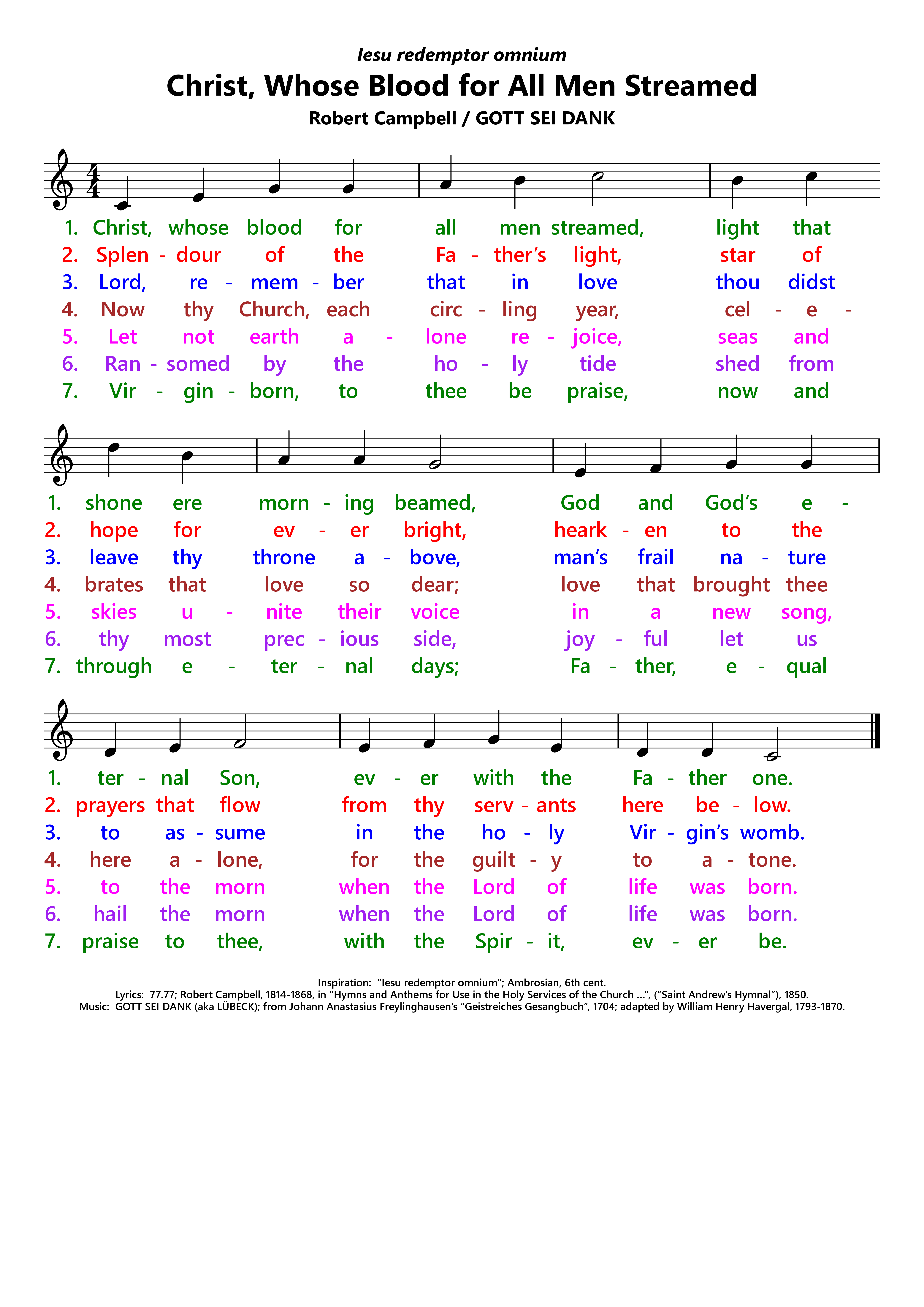 | Lyrics: | Robert Campbell, 1814-1868, in Hymns and Anthems for Use within the United Diocese of St. Andrew’s, Dunkeld and Dunblane, aka Saint Andrew’s Hymnal, 1850. |