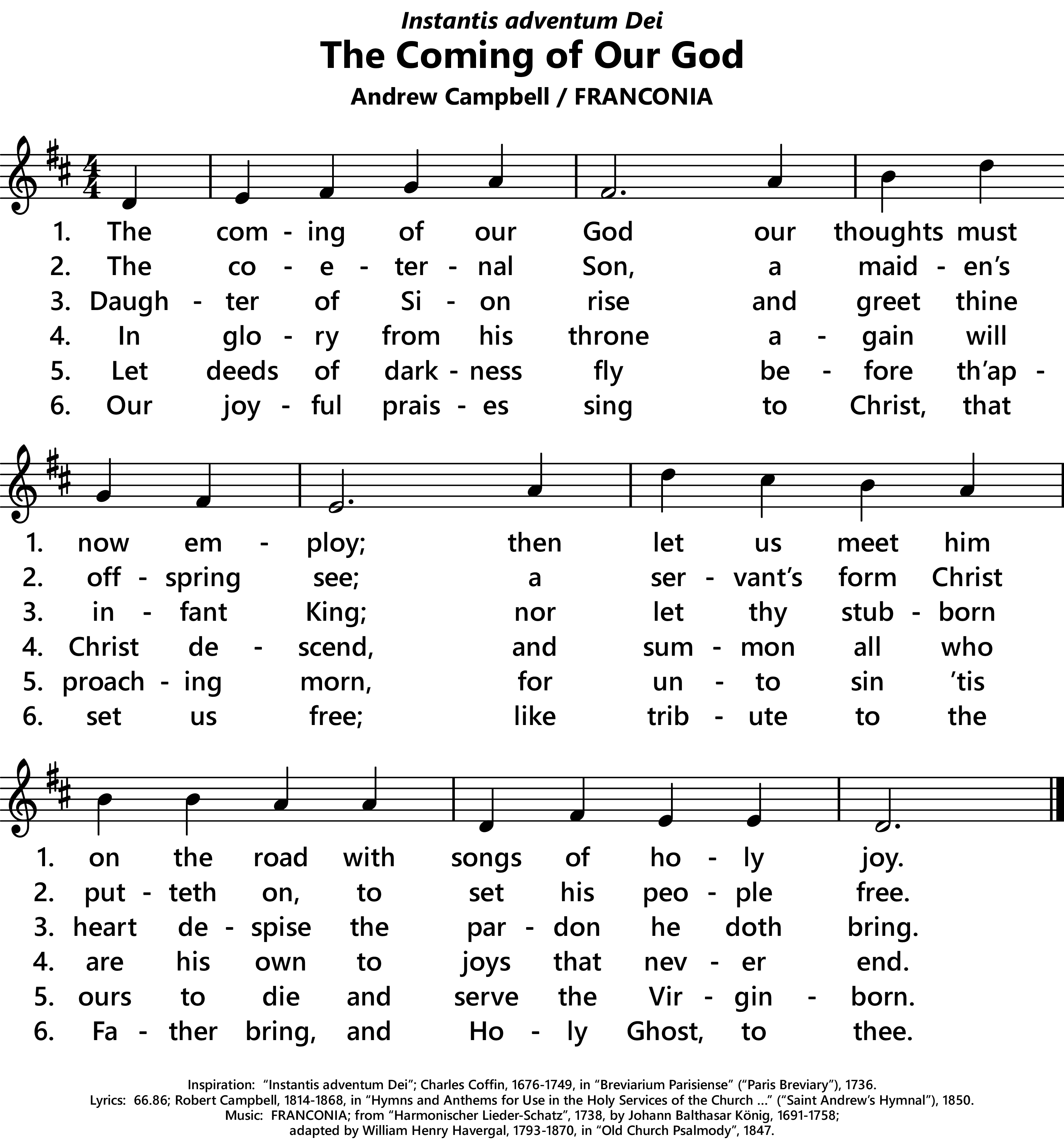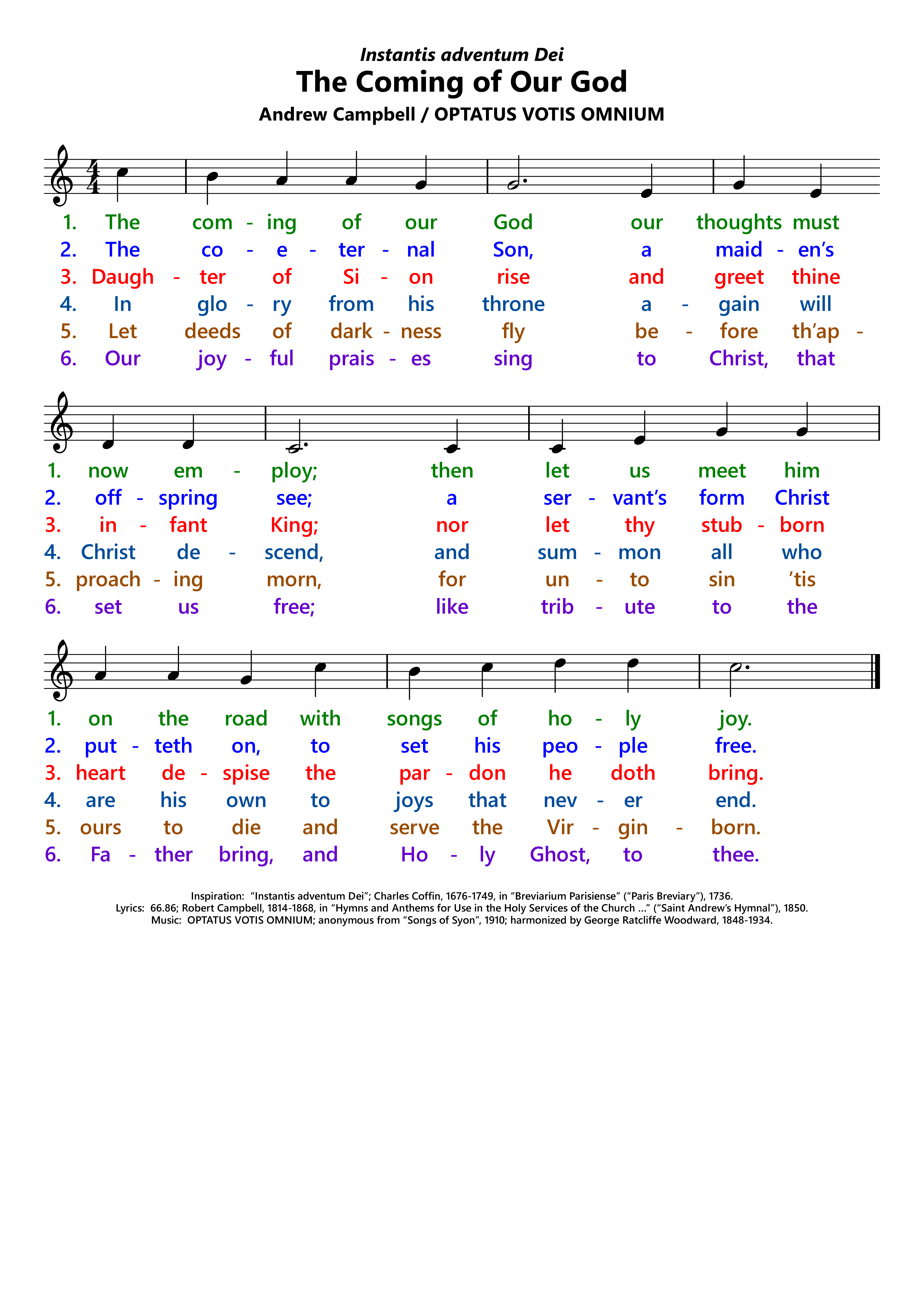 | Titles: | OCP changes the first line (and title) to The Advent of Our King when used with FRANCONIA (but not OPTATUS VOTIS OMNIUM) and only used the second coming verses in its missals. Divine Office 1974 only uses the incarnation verses, excluding the first verse, so it is retitled The Co-eternal Son |