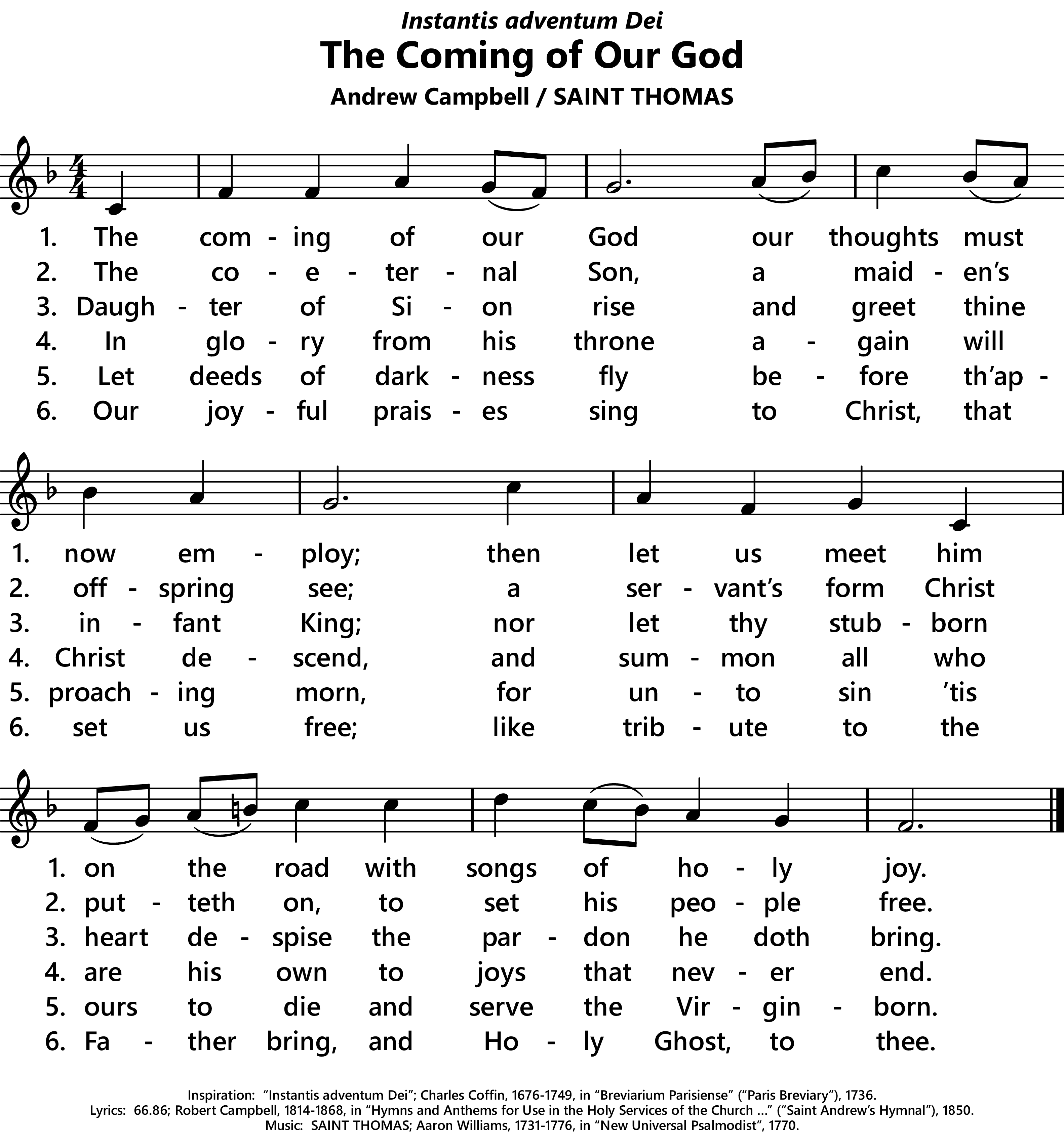| Lyrics: | Robert Campbell, 1814-1868, in Hymns and Anthems for Use within the United Diocese of St. Andrew’s, Dunkeld and Dunblane, aka Saint Andrew’s Hymnal, 1850. |
