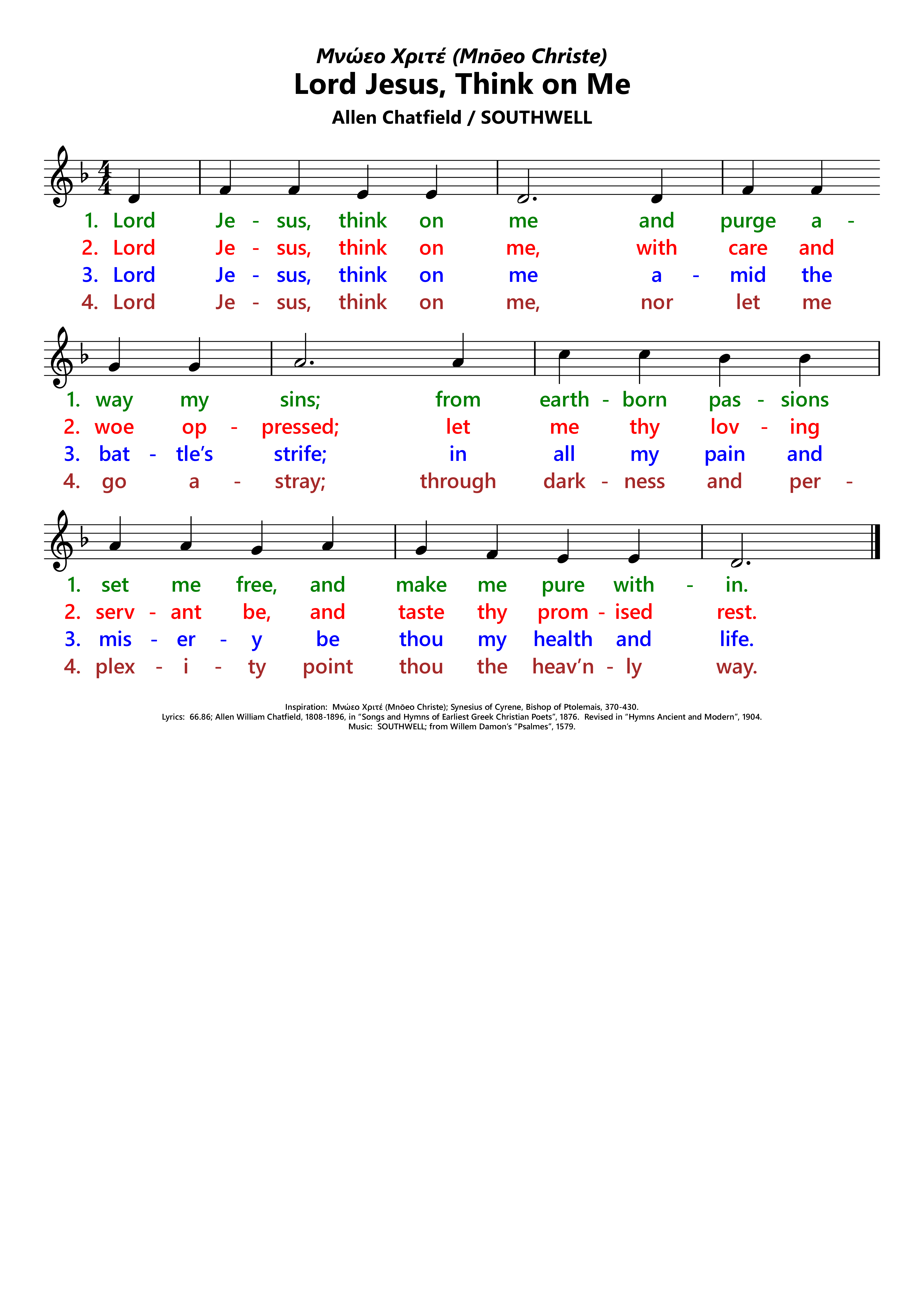 | Lyrics: | Allen William Chatfield, 1808-1896, in Songs and Hymns of Earliest Greek Christian Poets, 1876. Revised in Hymns Ancient and Modern, 1904. |