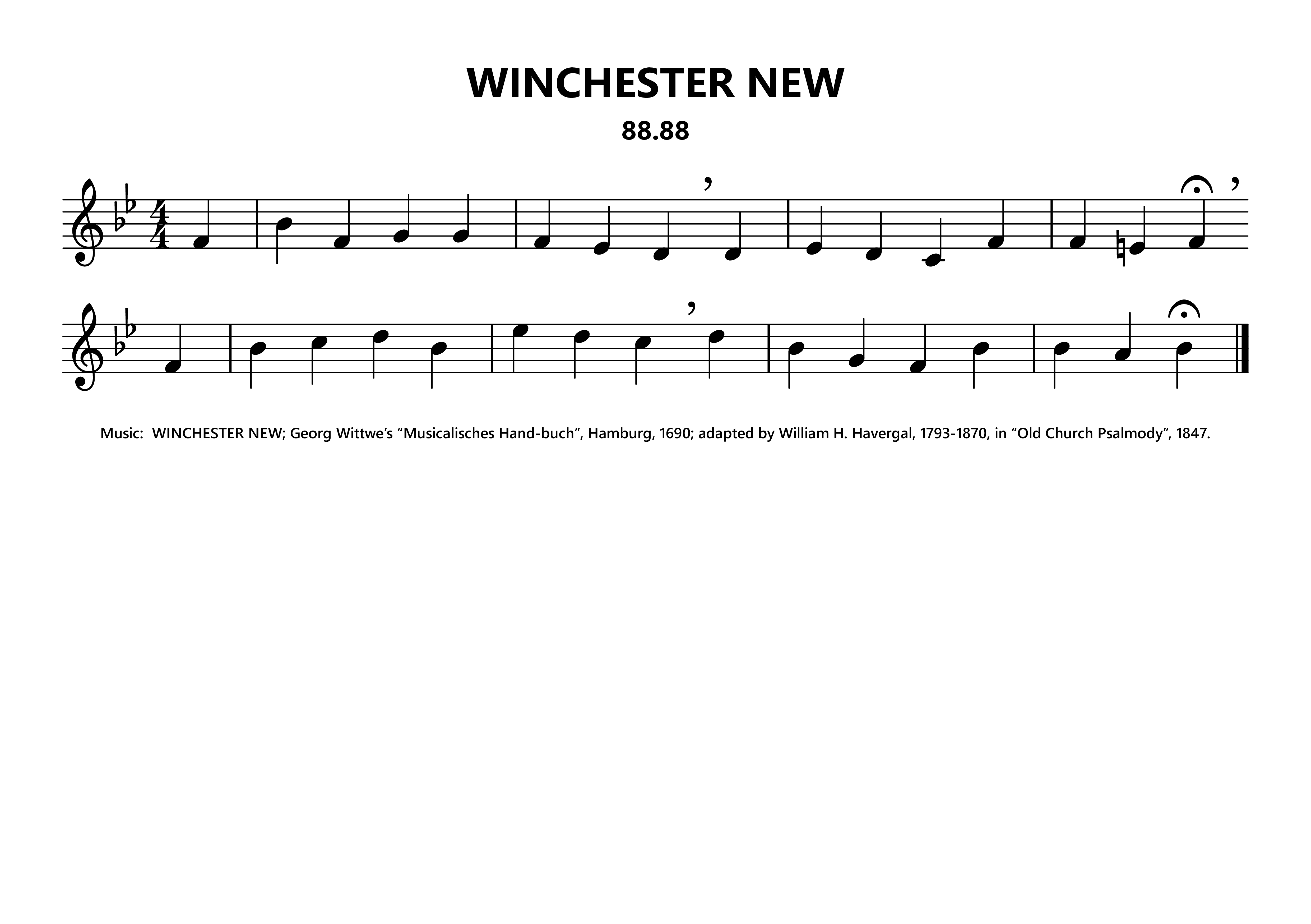 | Composer: | Georg Wittwe’s Musicalisches Hand-buch, Hamburg, 1690; adapt. by William H. Havergal, 1793-1870, in Old Church Psalmody, 1847; harm. by William H. Monk, 1823-1889, in Hymns Ancient and Modern, 1861. |