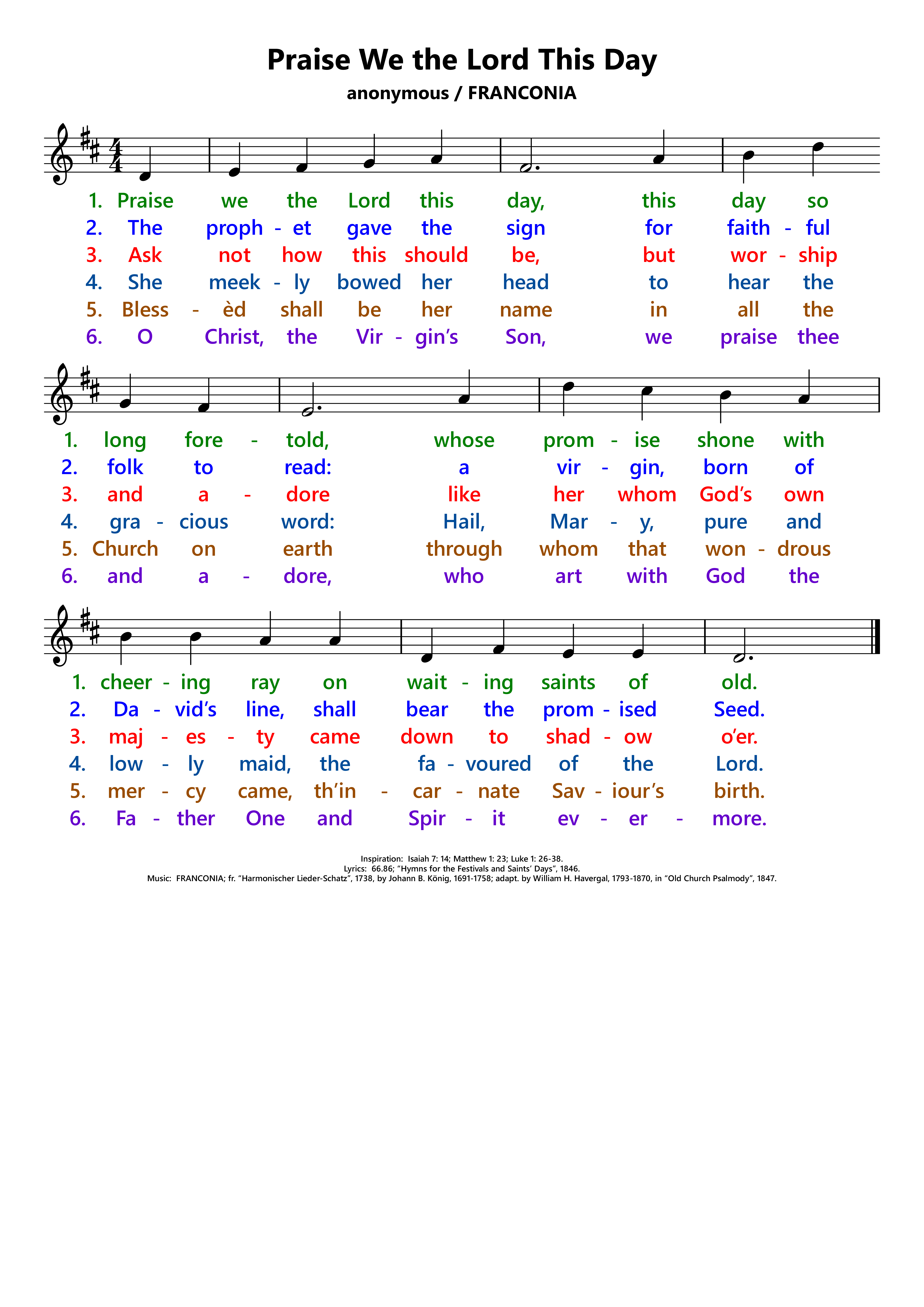 | Composer: | Johann M. Spiess, 1715-1772, in Davids-Harpffen-Spiel, Heidelberg, 1745 adapted by William H. Havergal, 1793-1870, in Old Church Psalmody, 1847. |