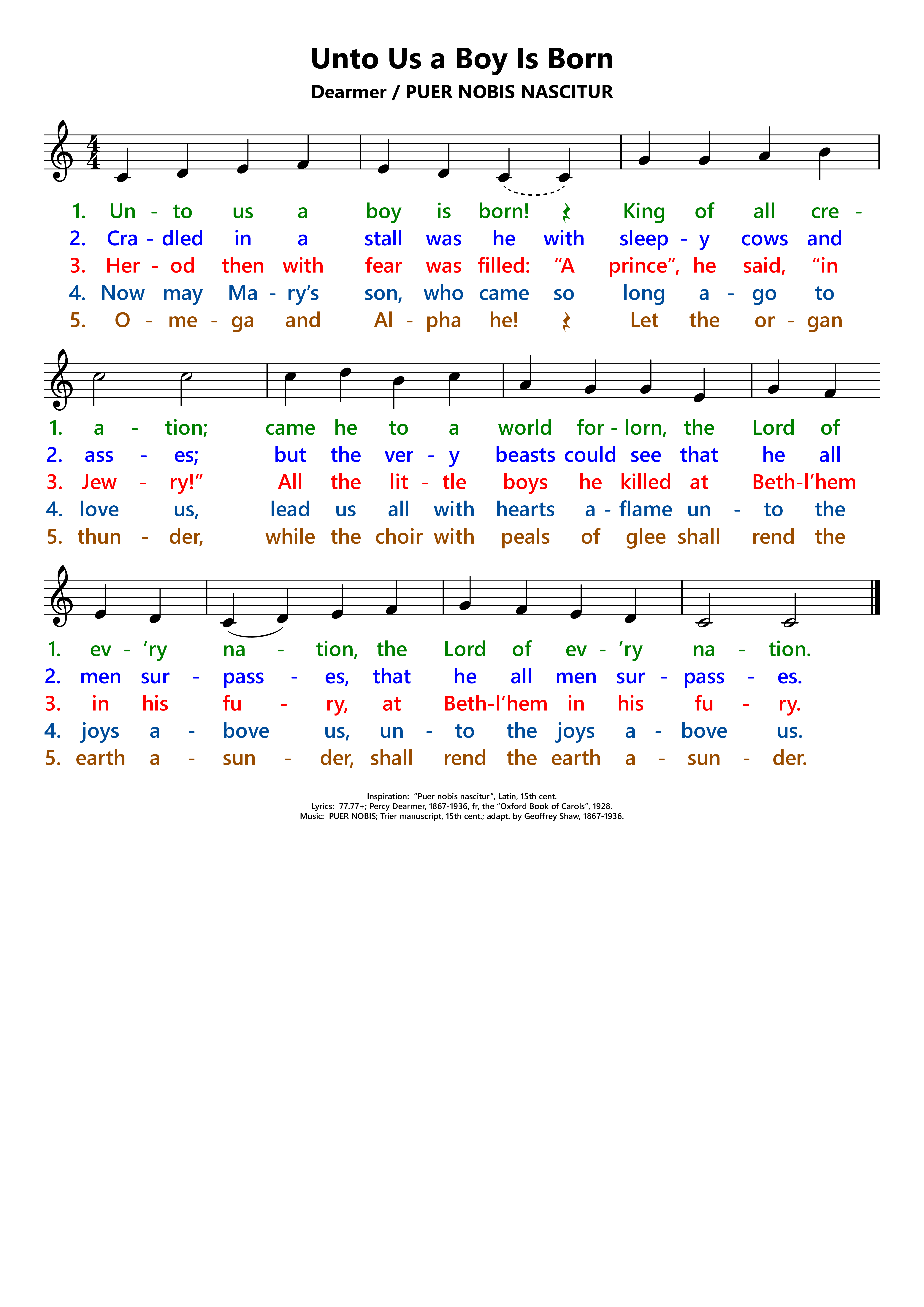 | Lyrics: | Percy Dearmer, 1867-1936, Oxford Book of Carols, 1928. |