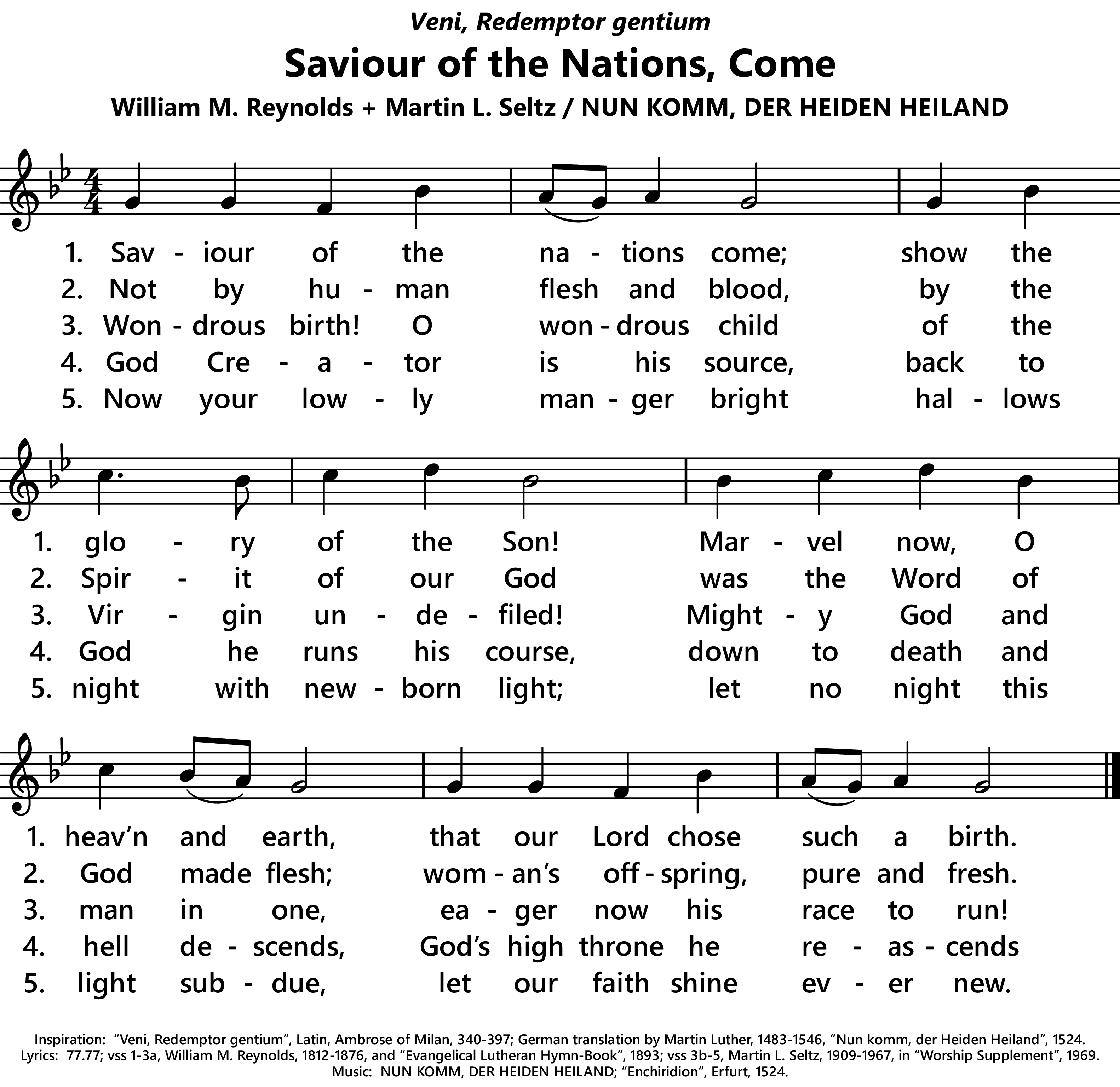 | Inspiration: | German translation, Martin Luther, 1483-1546, Nun komm, der Heiden Heiland, 1524. |