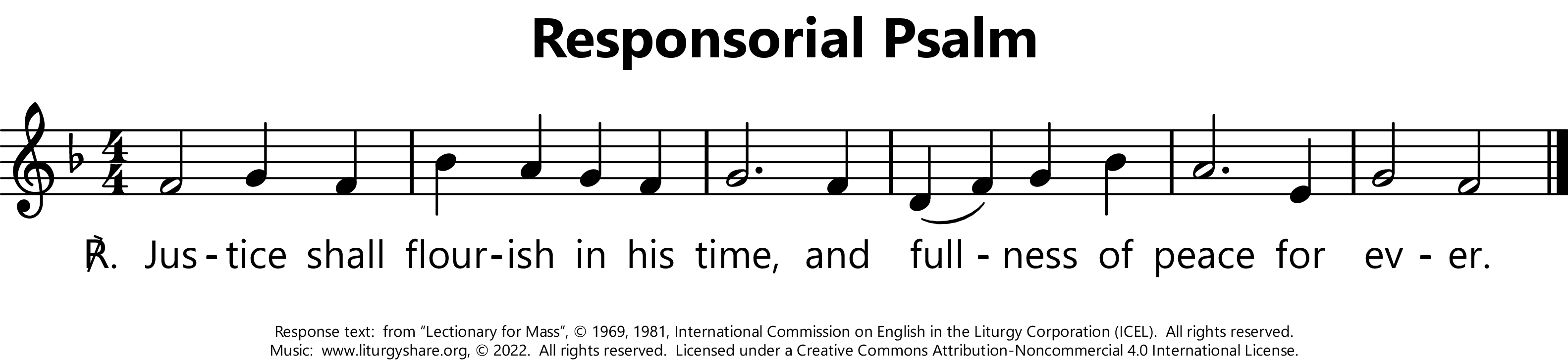 | ℣: | Psalm 72 (71): 1-2, 7-8, 12-13, 17 Justice shall flourish in his time, and fullness of peace for ever. (Oz, US) In his days shall justice flourish, and great peace for ever. (UK) |