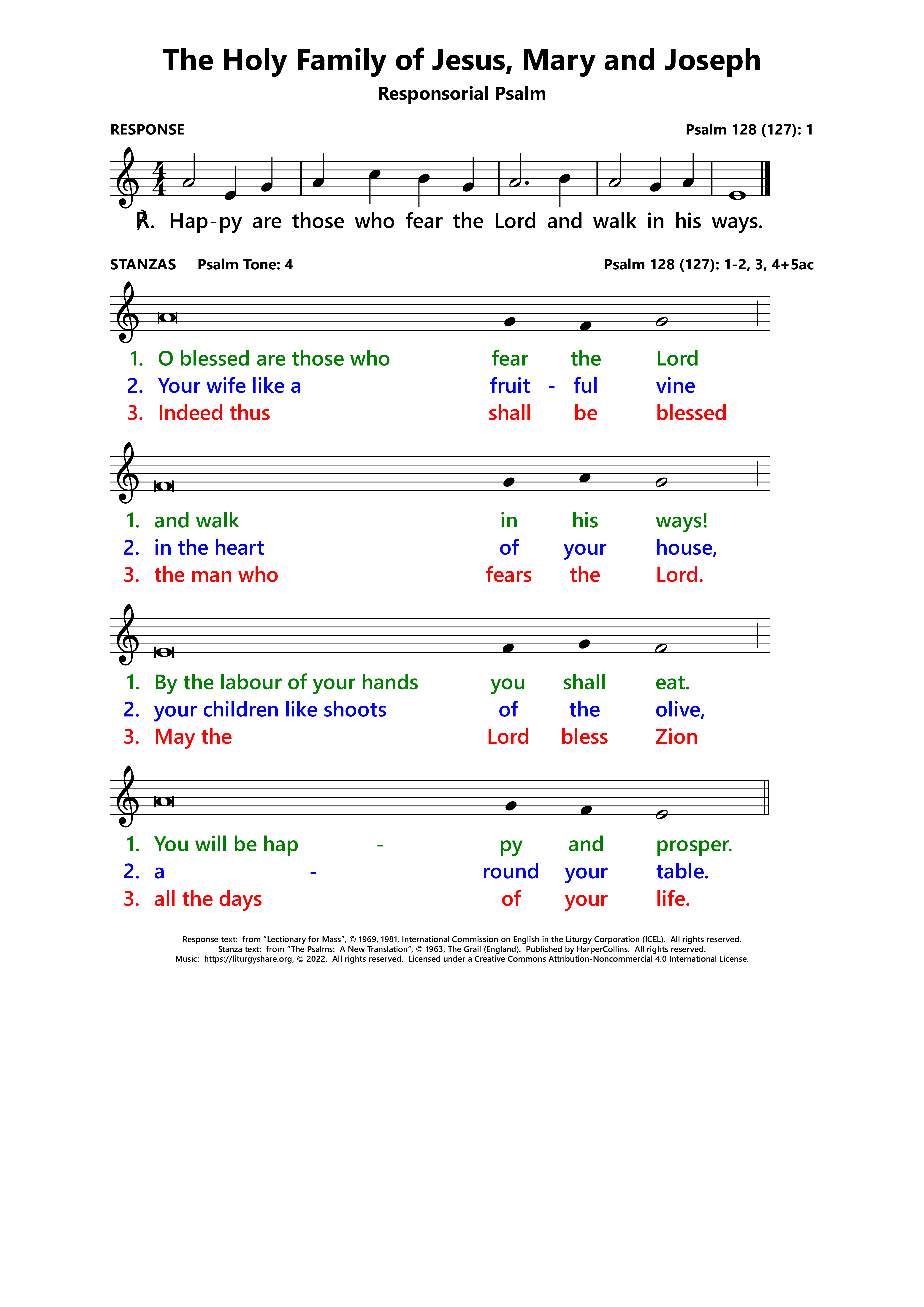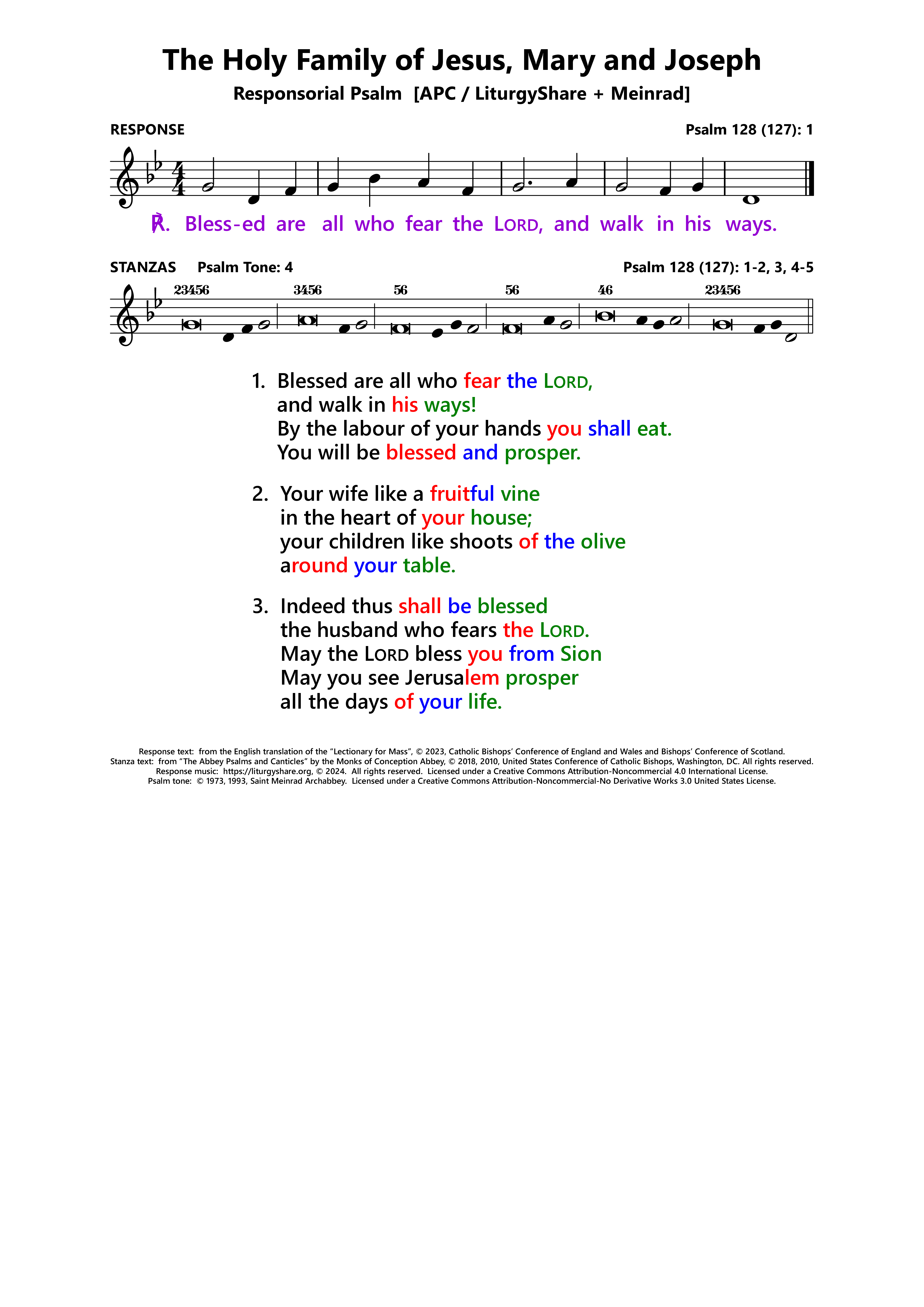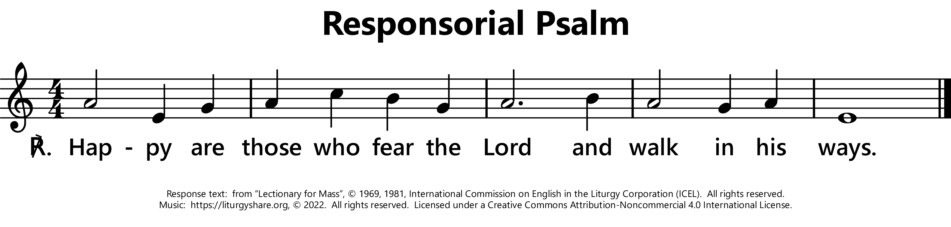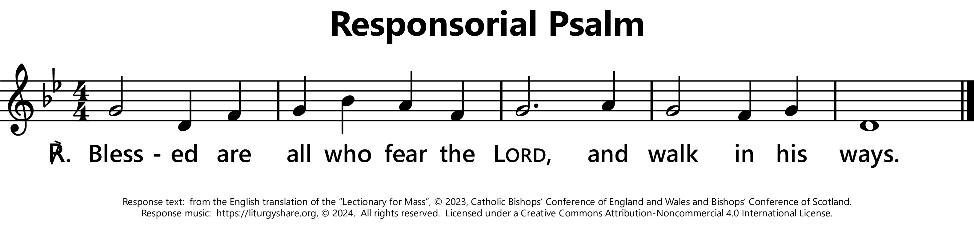 | ℟: | Psalm 128 (127): 1ab Happy are those who fear the Lord and walk in his ways. (Oz) Blessed are those who fear the Lord and walk in his ways. (US) Blessed are all who fear the Lord, and walk in his ways. (UK) |