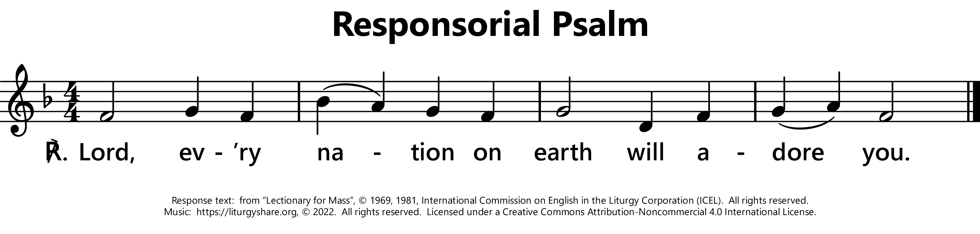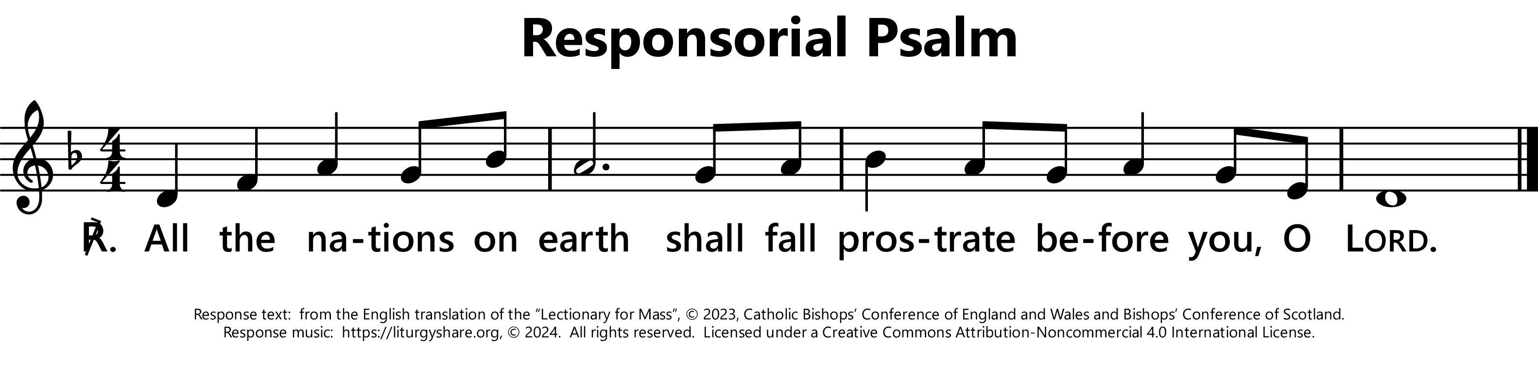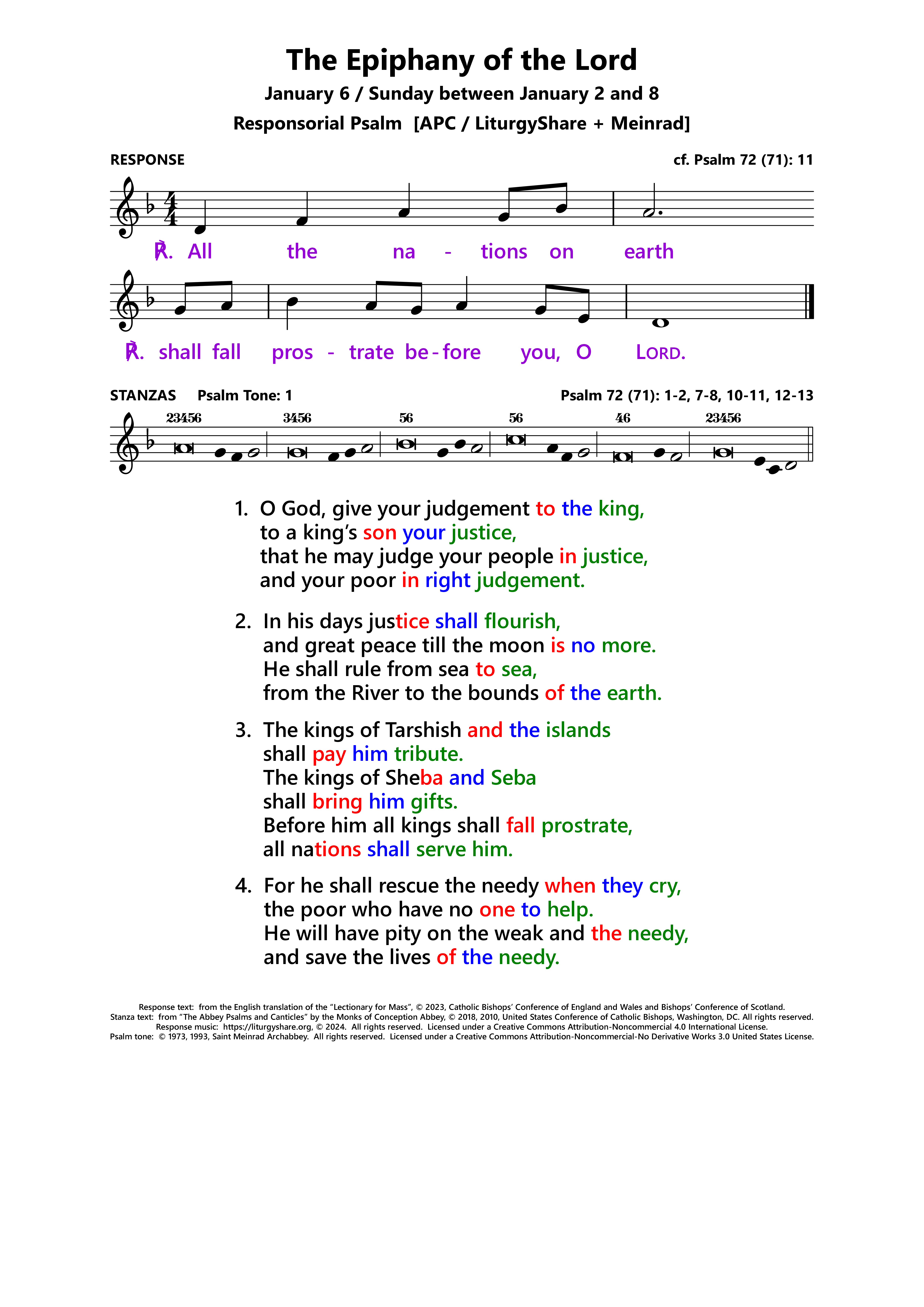 | ℟: | Psalm 72 (71): 11 Adorabunt te, Domine, omnes gentes terrae. Lord, every nation on earth will adore you. (Oz, US) All the nations on earth shall fall prostrate before you, O Lord. (UK) |