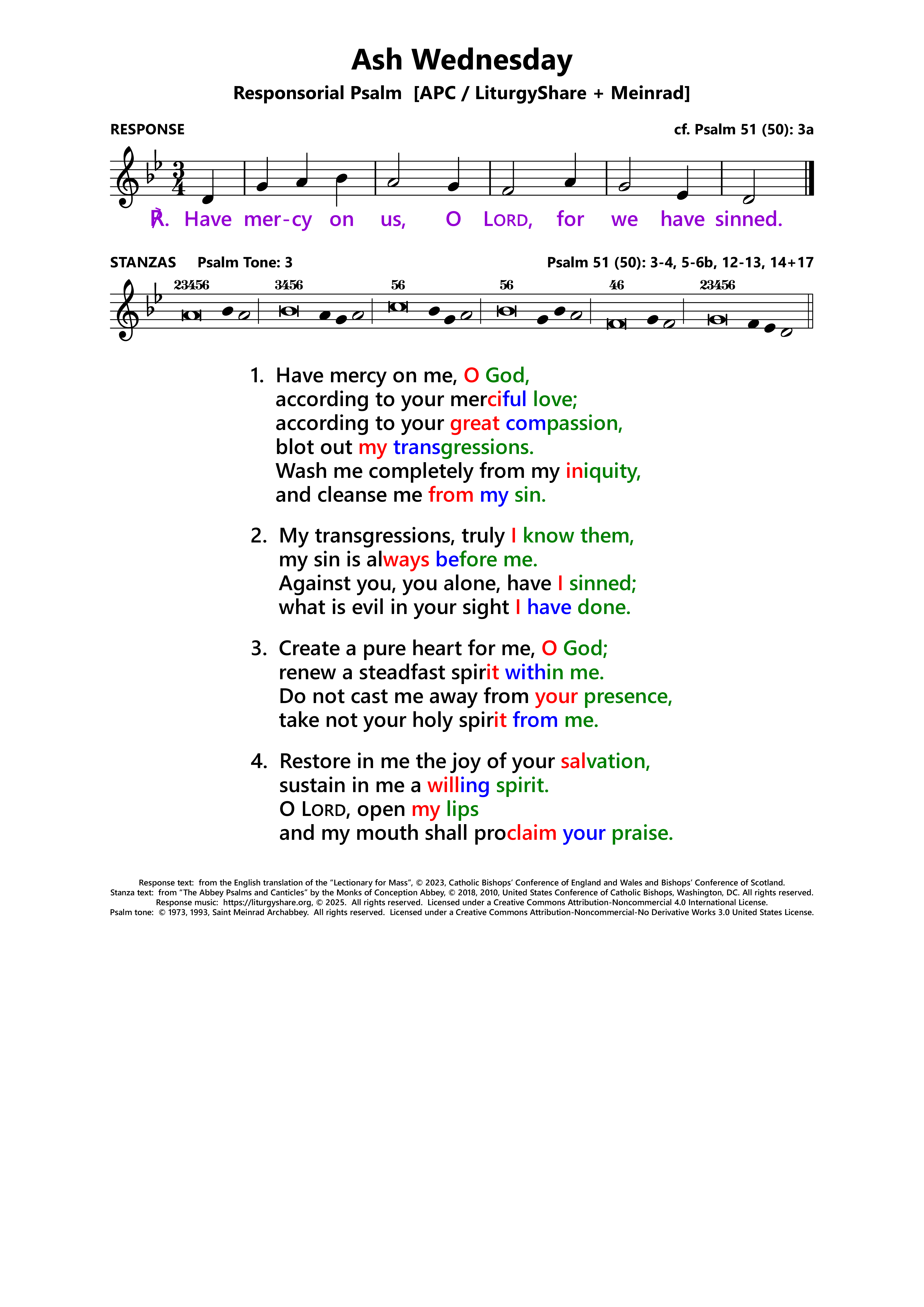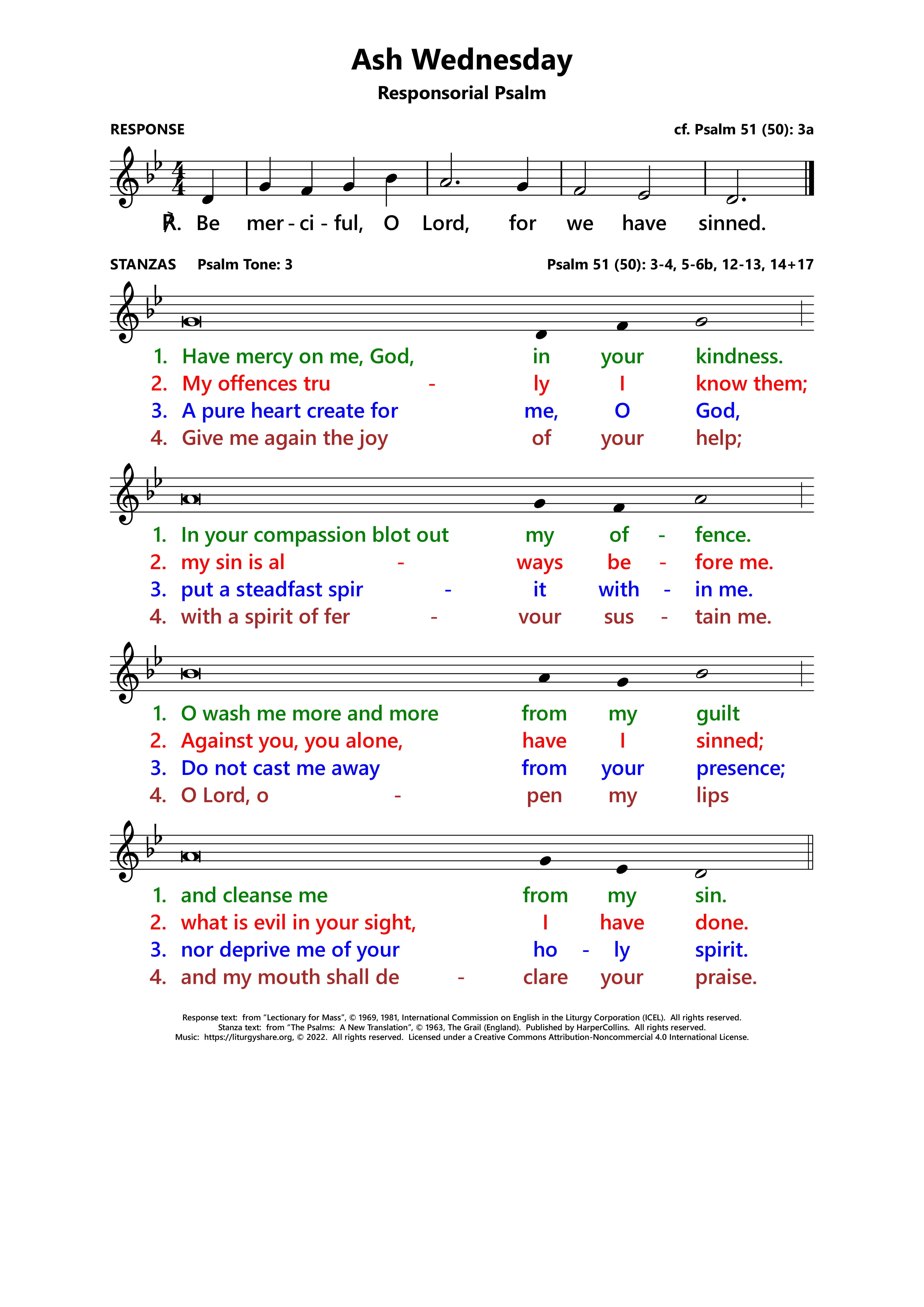 | ℣: | Psalm 51 (50): 3-4, 5-6b, 12-13, 14+17 |