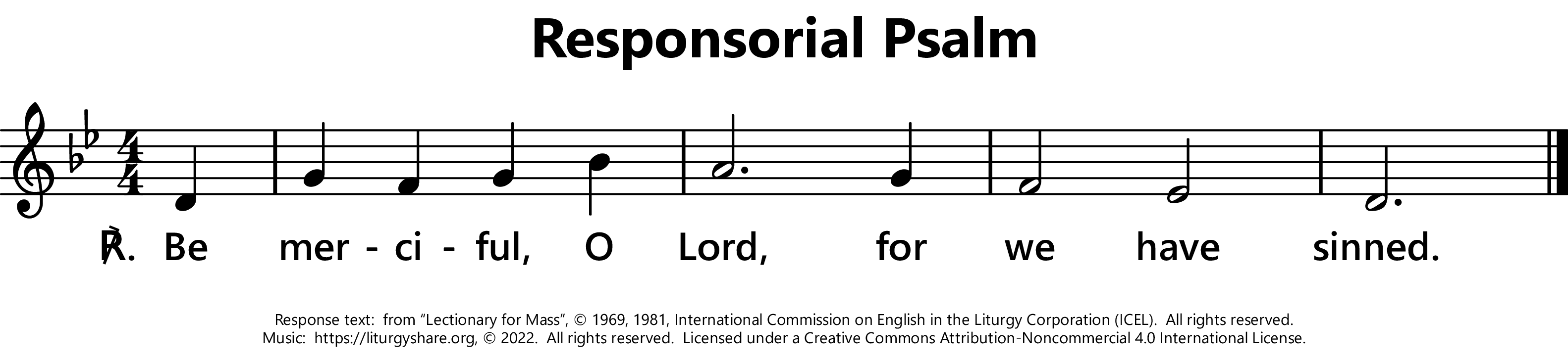 | ℟: | cf. Psalm 51 (50): 3a Miserere, Domine, quia peccavimus.. Be merciful, O Lord, for we have sinned. (Oz, US) Have mercy on us, O Lord, for we have sinned. (UK) |