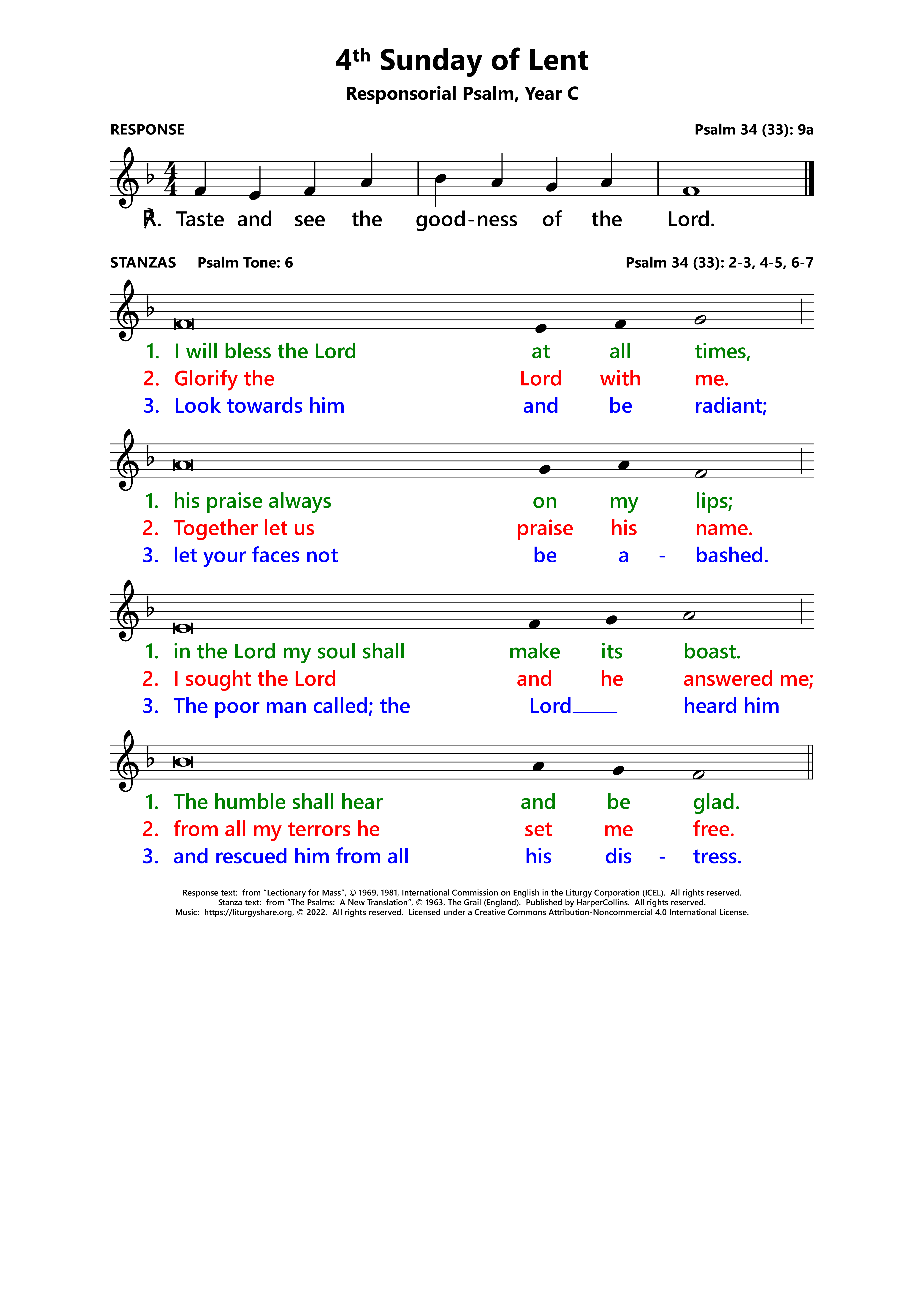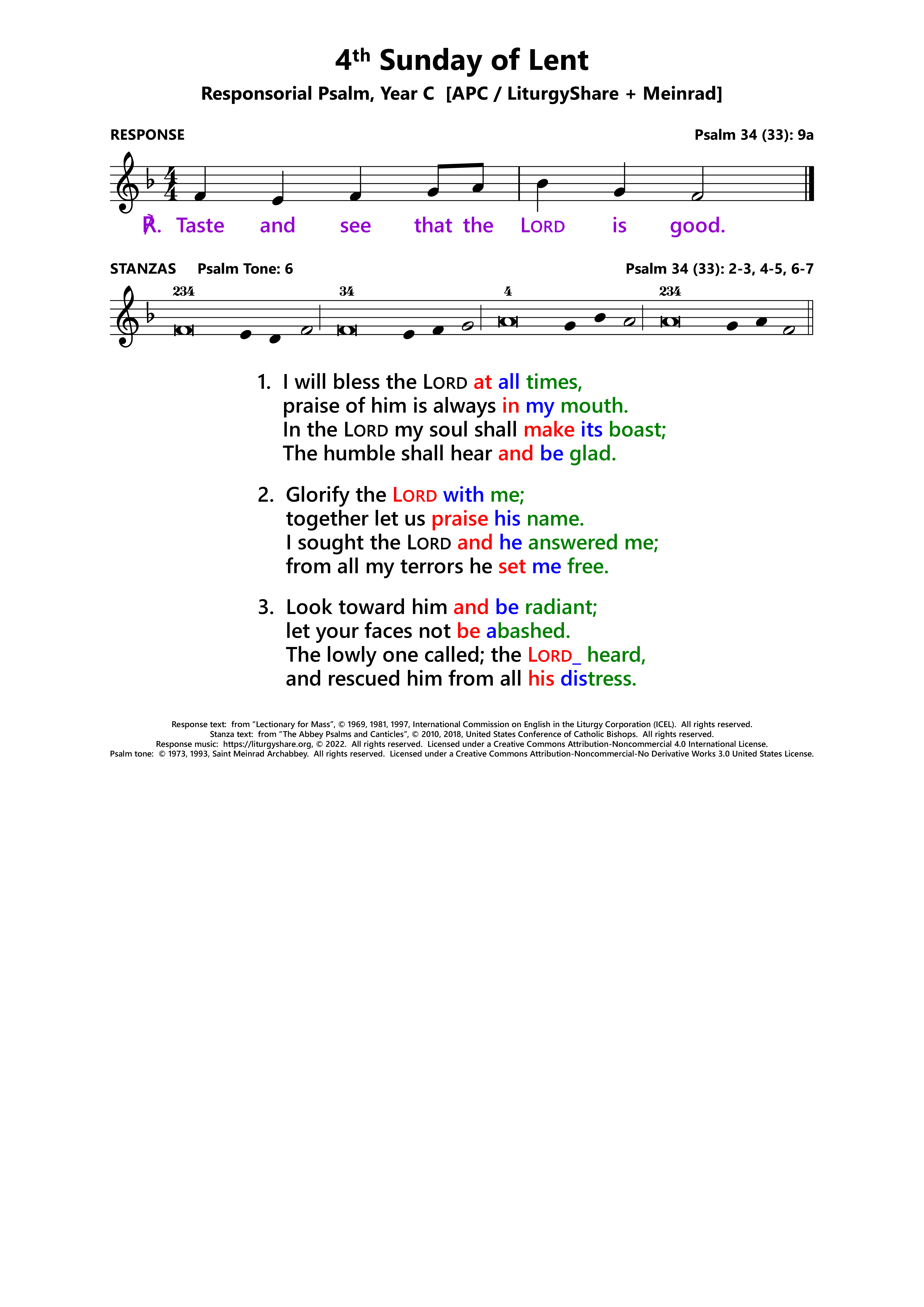 | ℣: | Psalm 34 (33): 2-3, 4-5, 6-7 4th Sunday of Lent, Year C (33) |