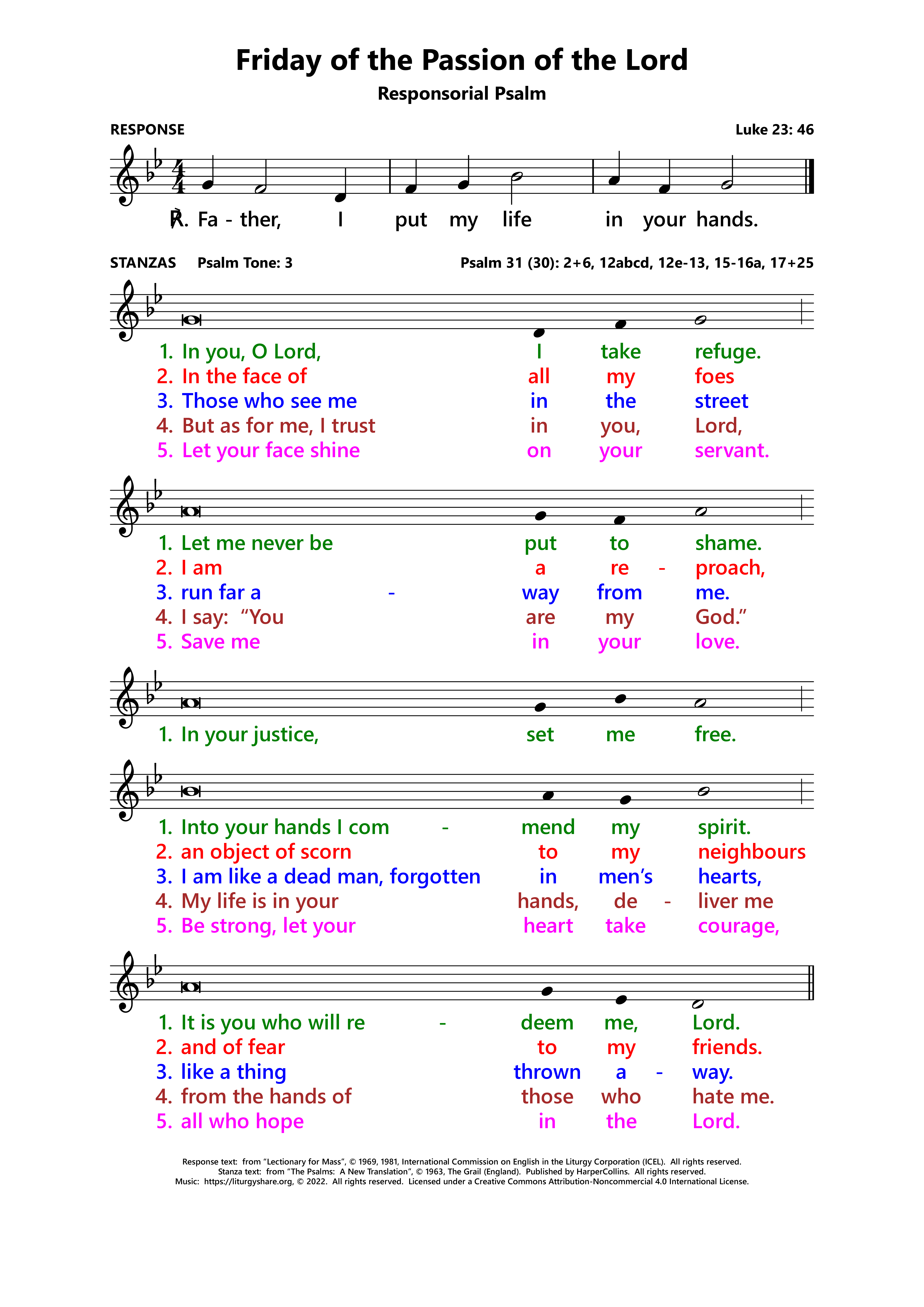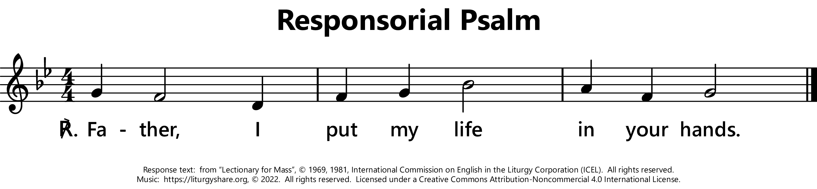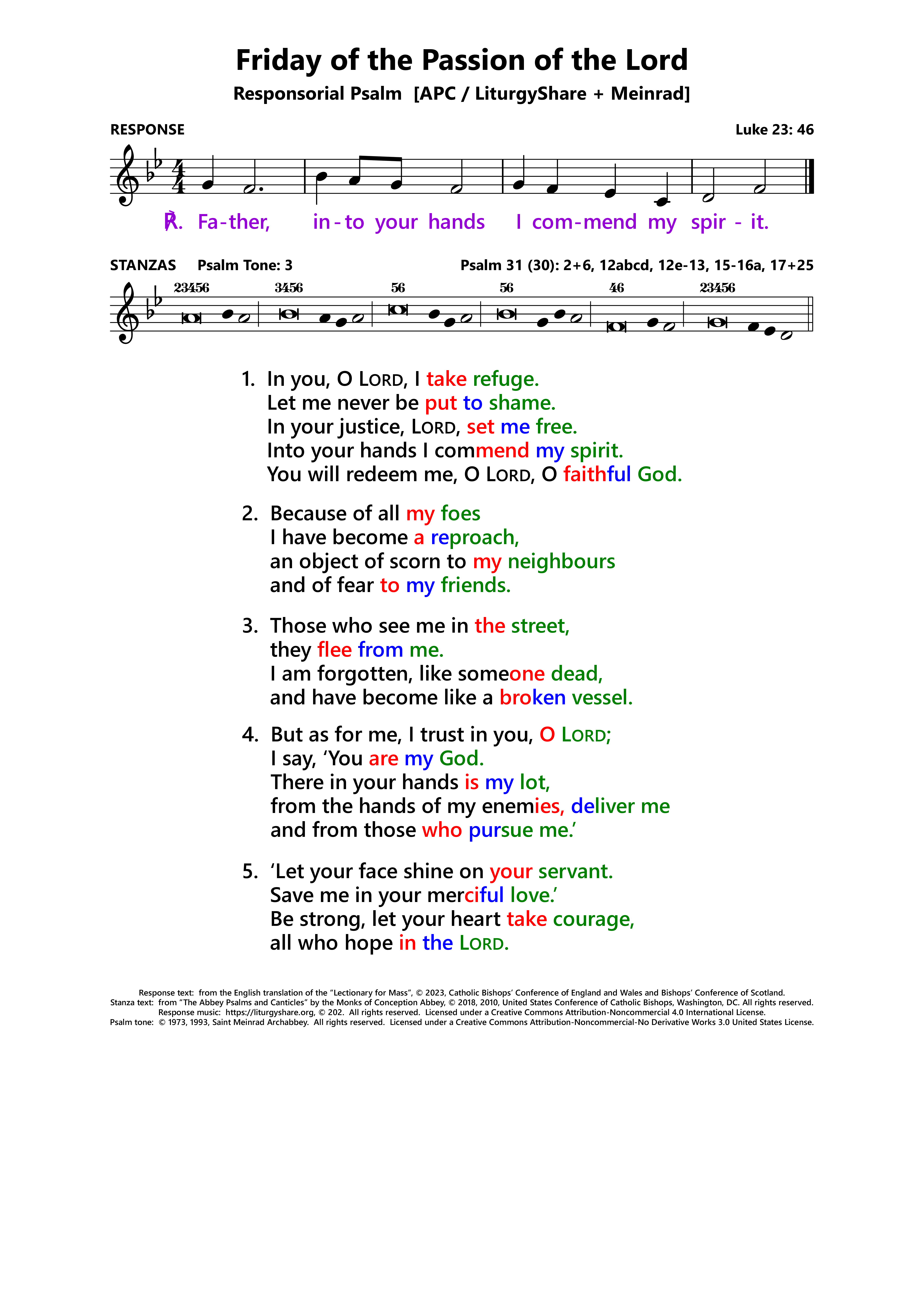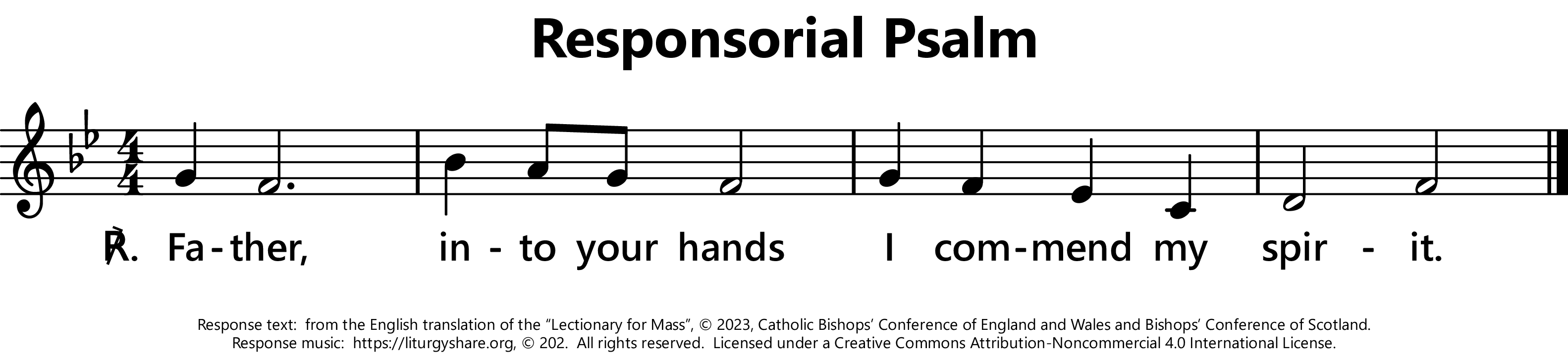 | ℟: | Luke 23: 46 Pater, in manus tuas commendo spiritum meum. Father, I put my life in your hands. (Oz) Father, into your hands, I commend my spirit. (US, UK) |