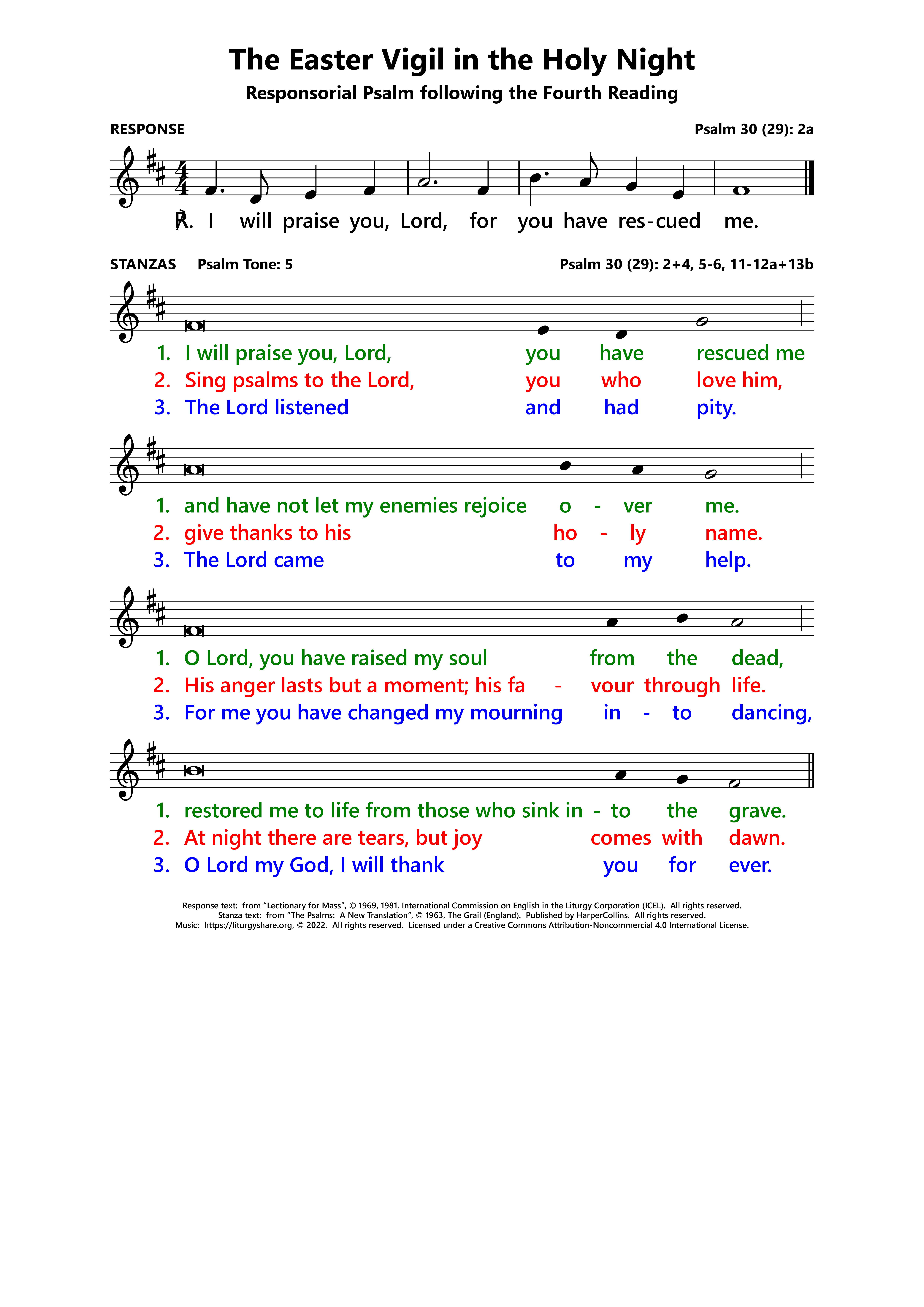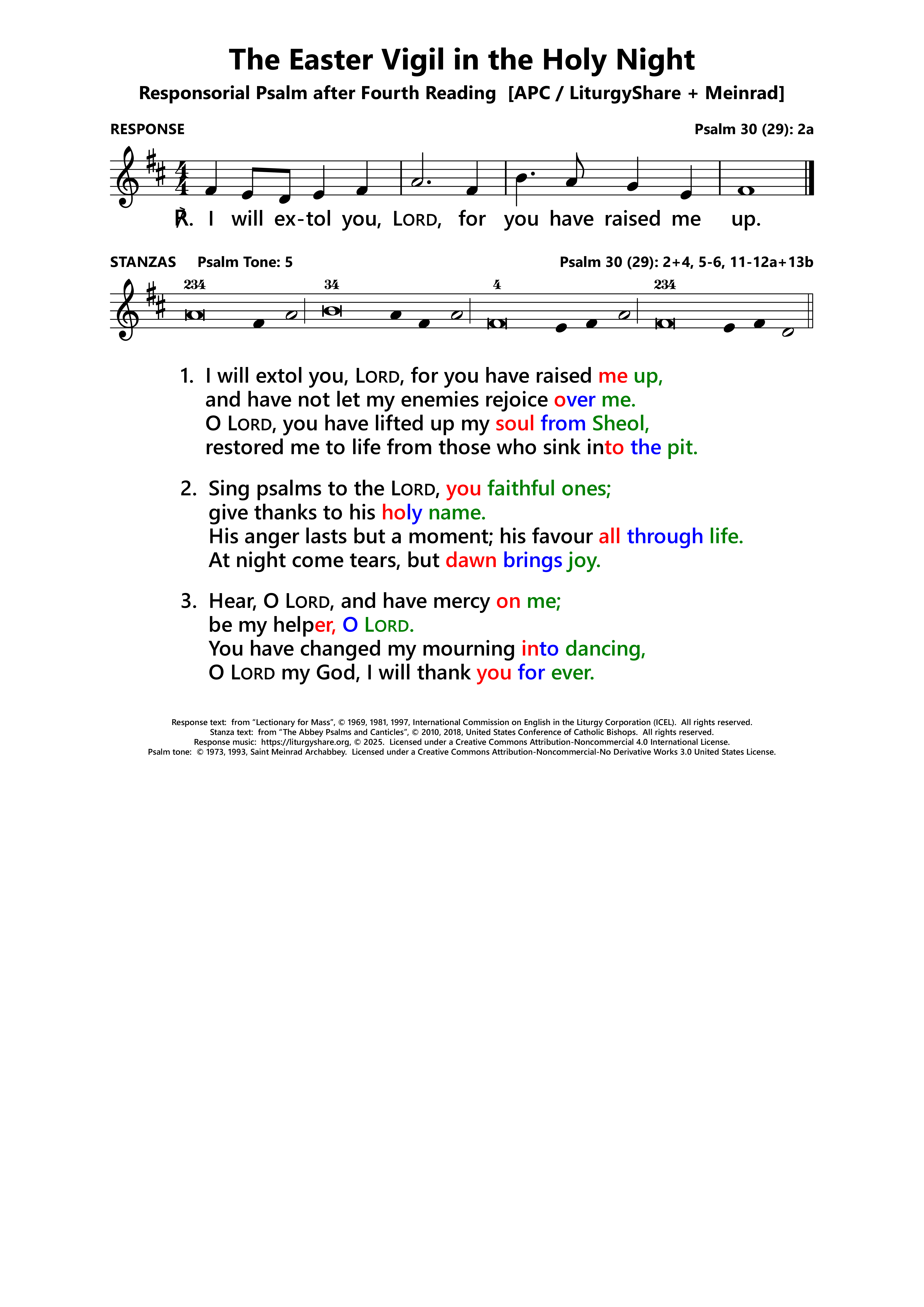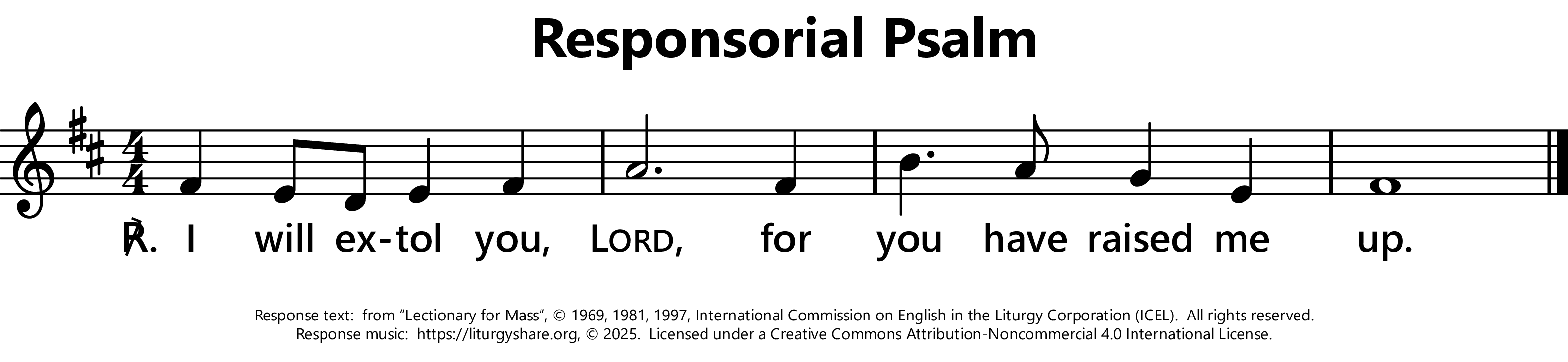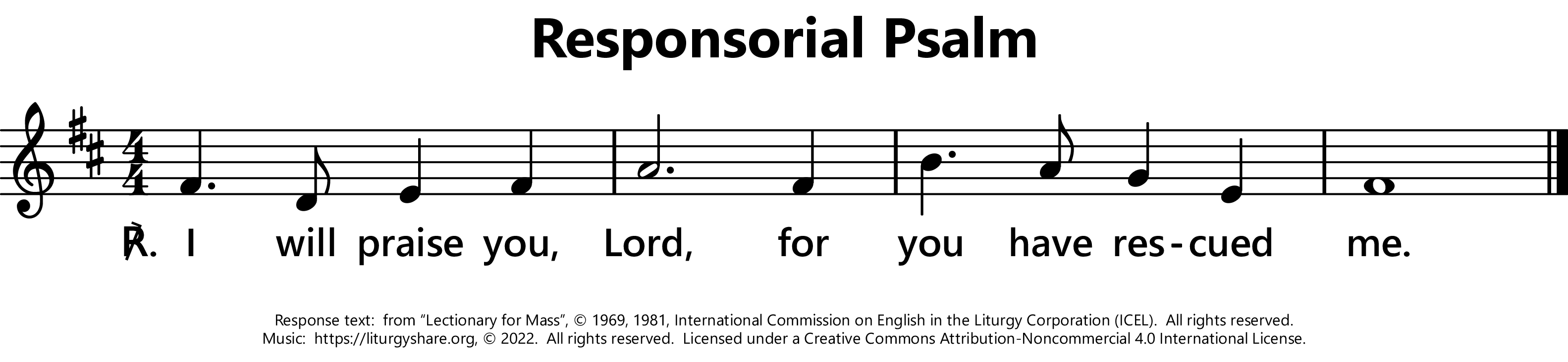 | ℟: | Psalm 30 (29): 2a Exaltabo te, Domine, quoniam extraxisti me. I will praise you, Lord, for you have rescued me. (Oz, US) I will extol you, Lord, for you have raise me up. (UK) |