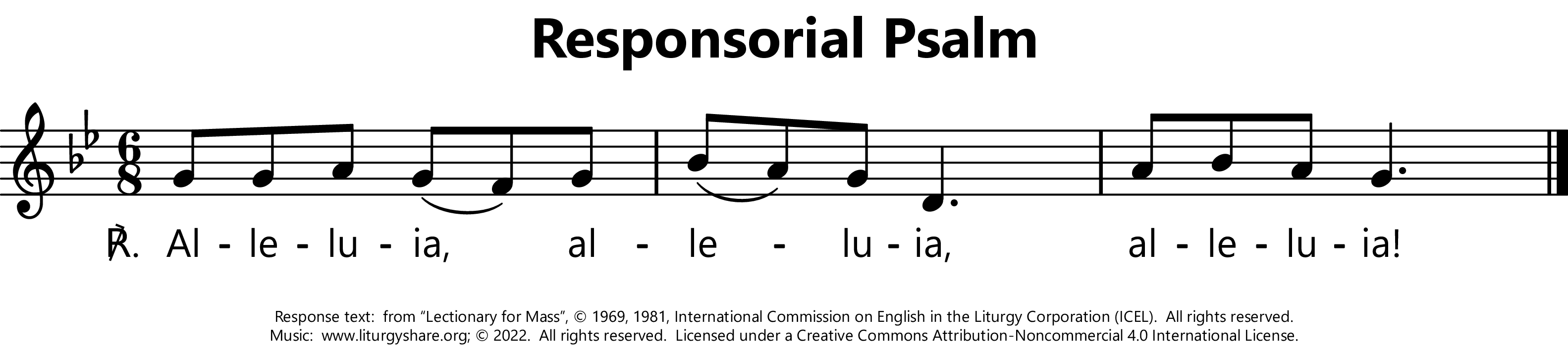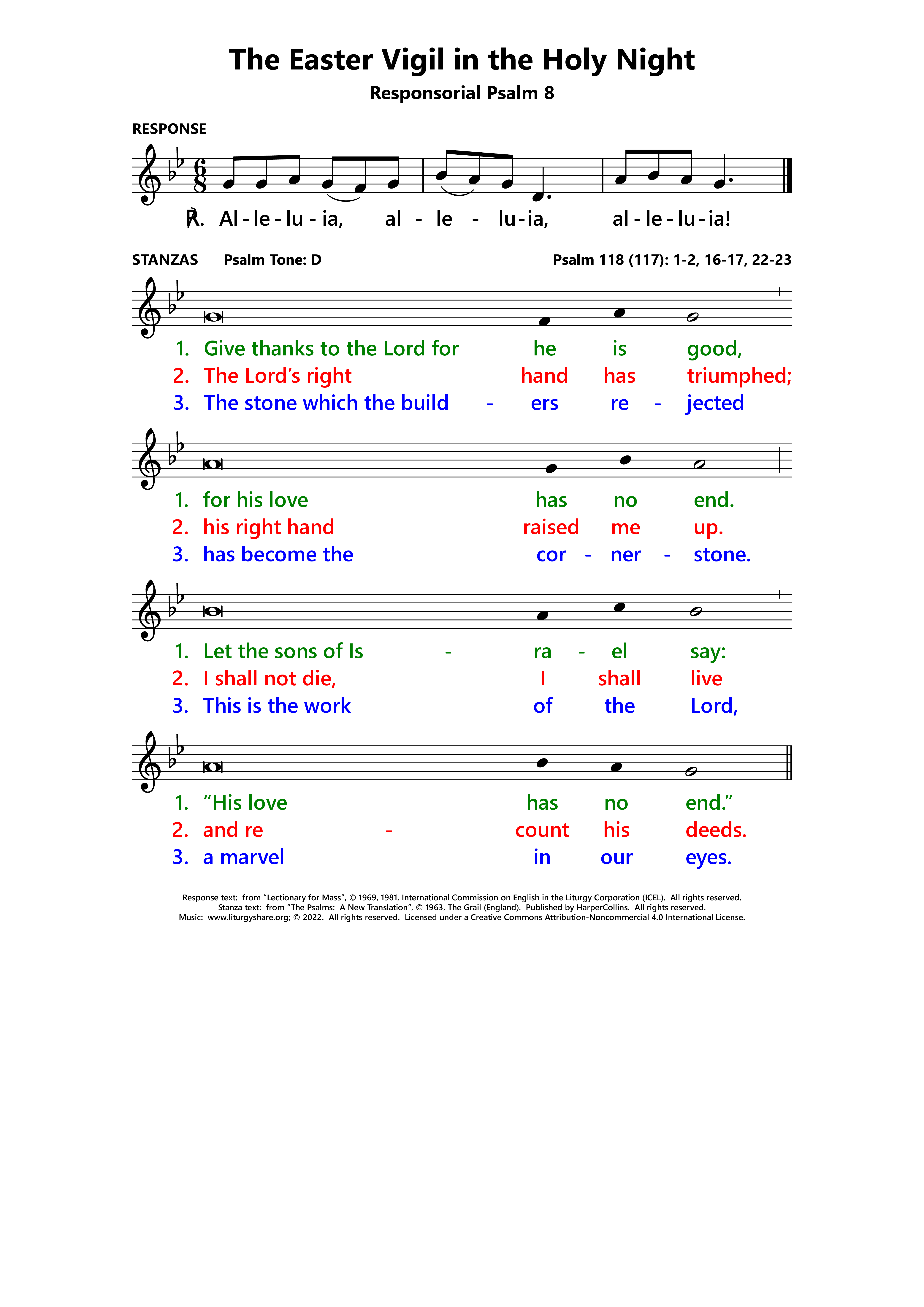This setting is published with the VATICANO psalm tone in F major, but some people will find chanting the third phrase a strain, and dropping the whole psalm by a step hurts the alreadly low response. An option is to replace the psalm tone with Smith’s ORVIETO, which can be found with the second and third Easter Vigil readings.
