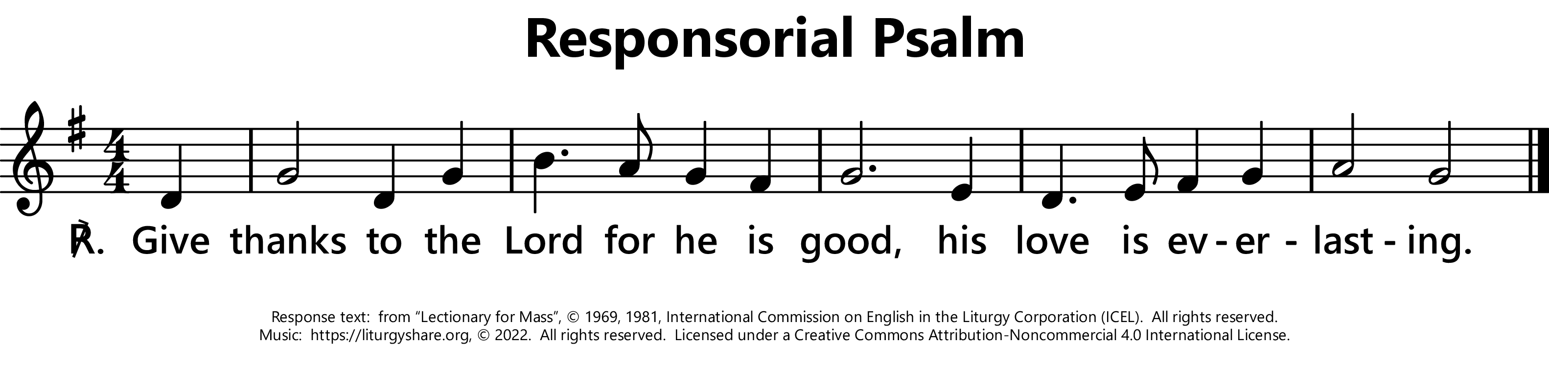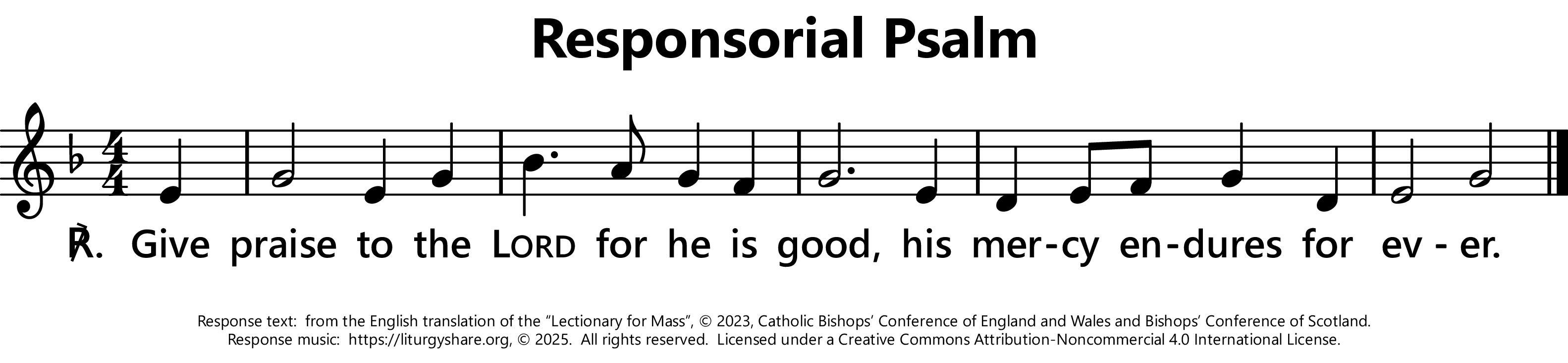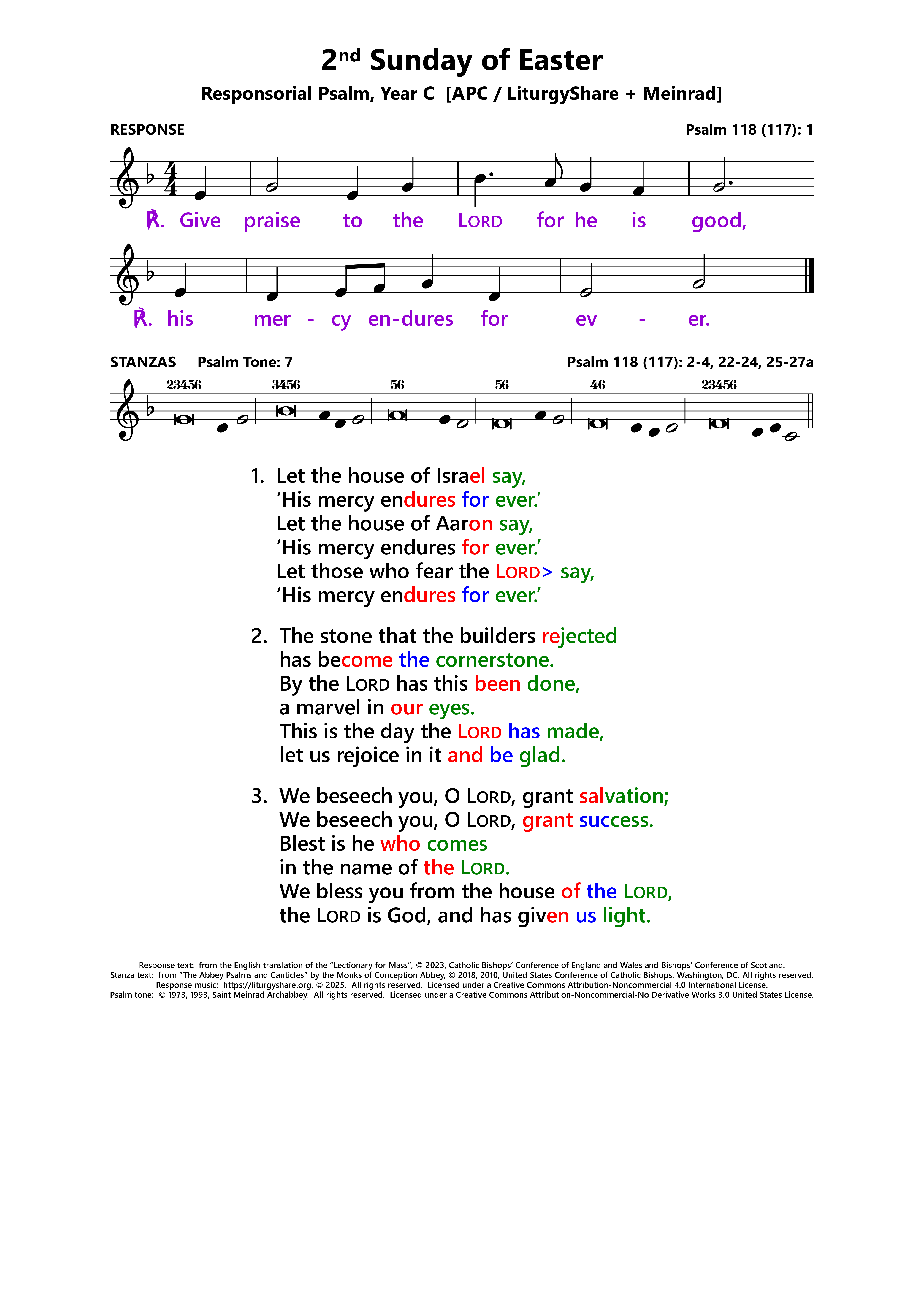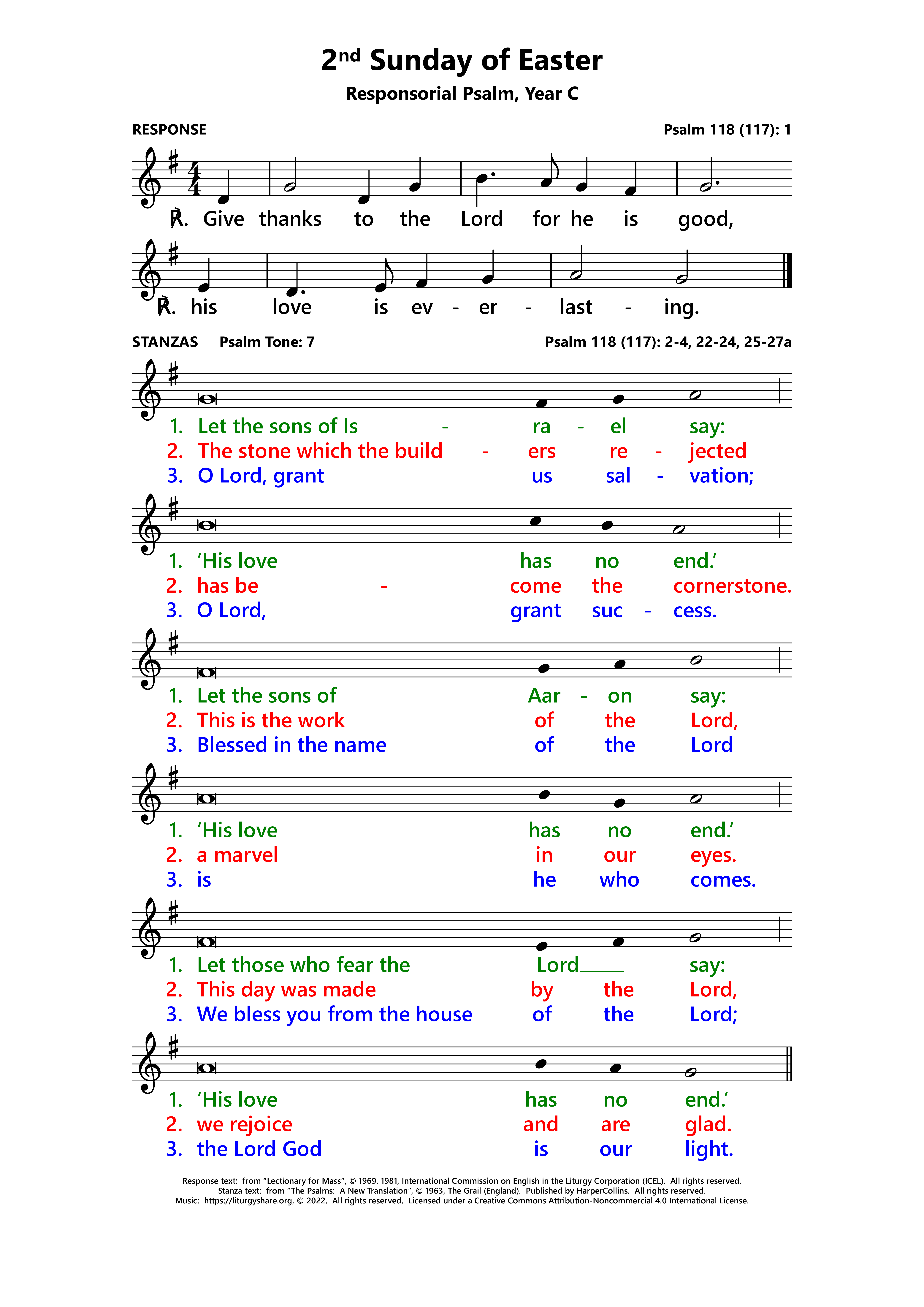 | ℟: | Psalm 118 (117): 2 Confitemini Domino quoniam bonus, quoniam in saeculum misericordia eius. Give thanks to the Lord for he is good, his love is everlasting. (Oz, US) Give thanks to the Lord for he is good, his mercy endures for ever. (UK) |