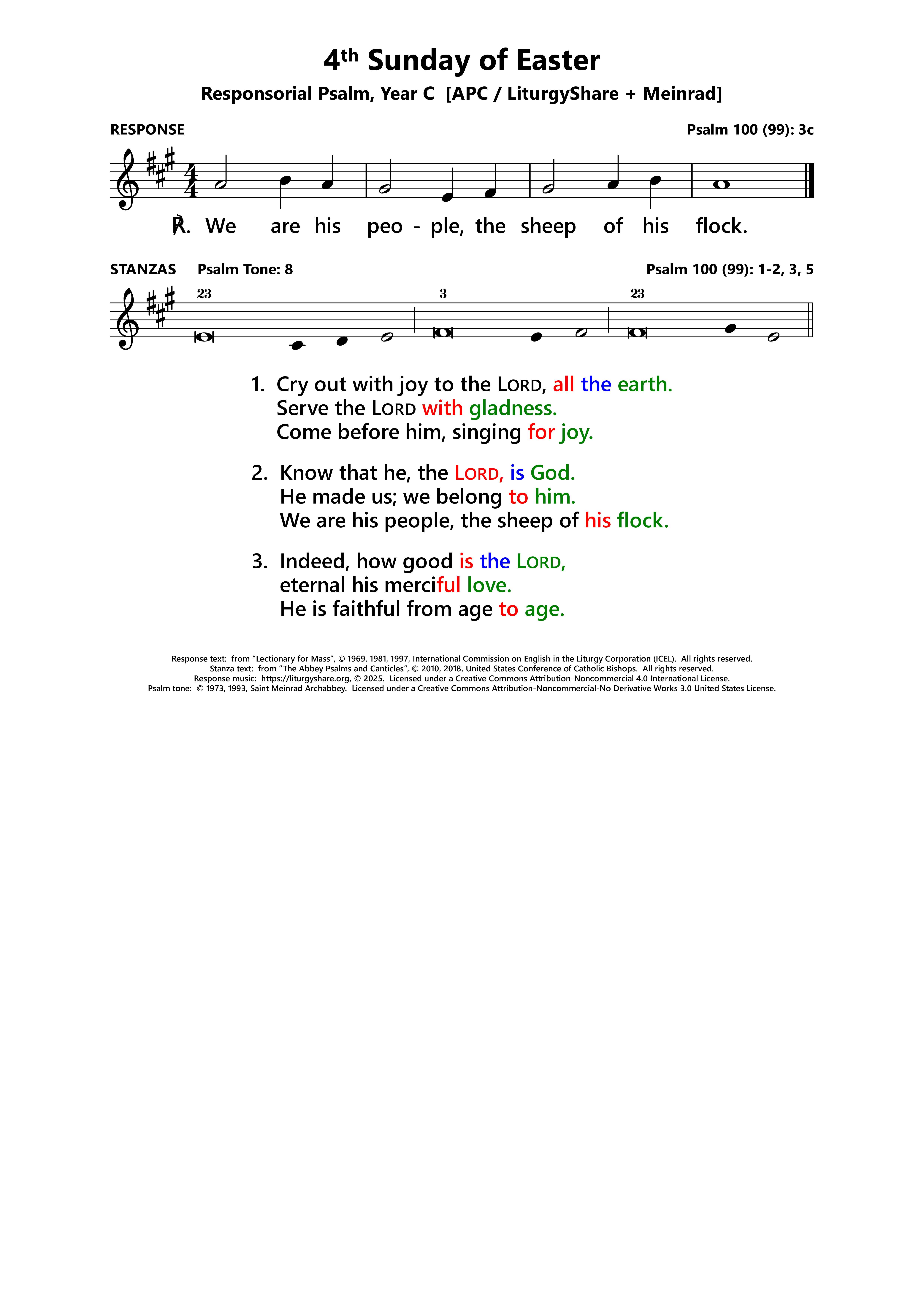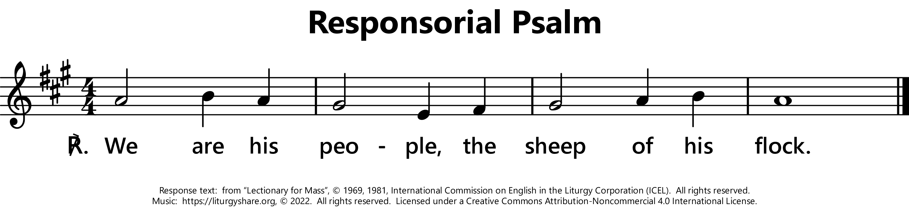 | ℟: | Psalm 100 (99): 3c Nos populus eius et oves pascuae eius. We are his people, the sheep of his flock. |