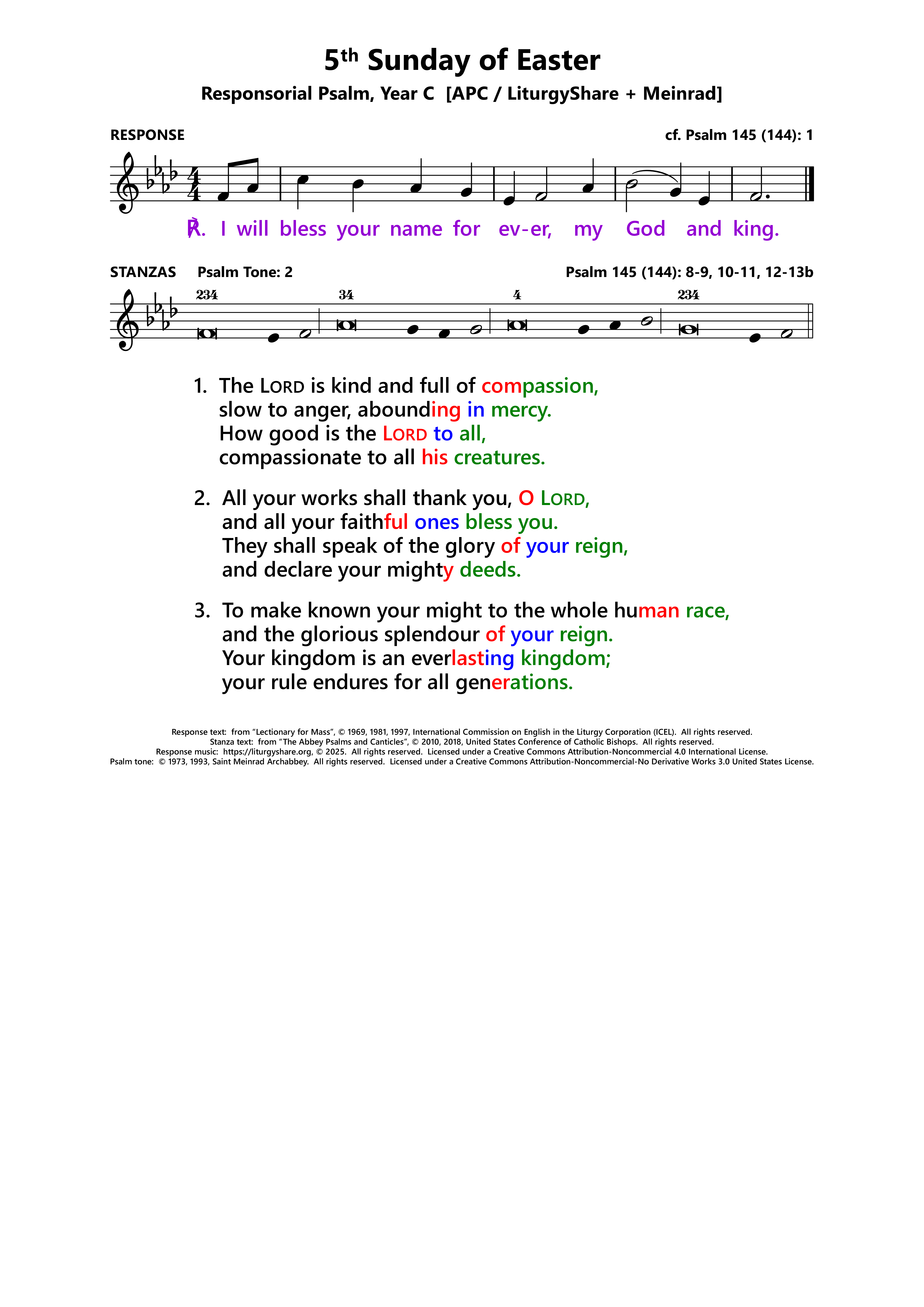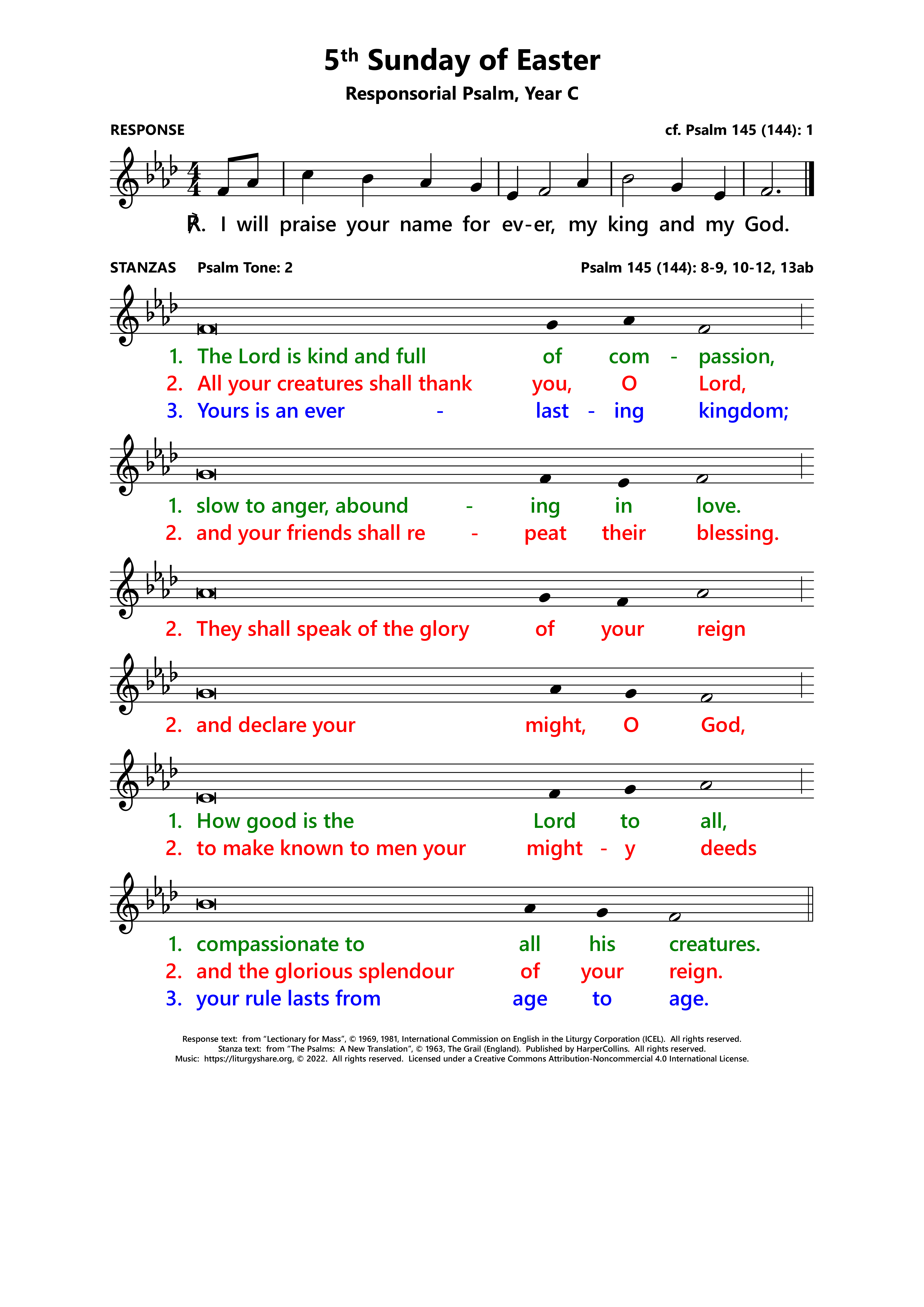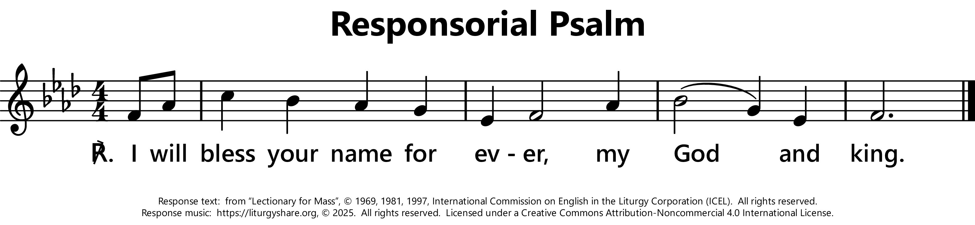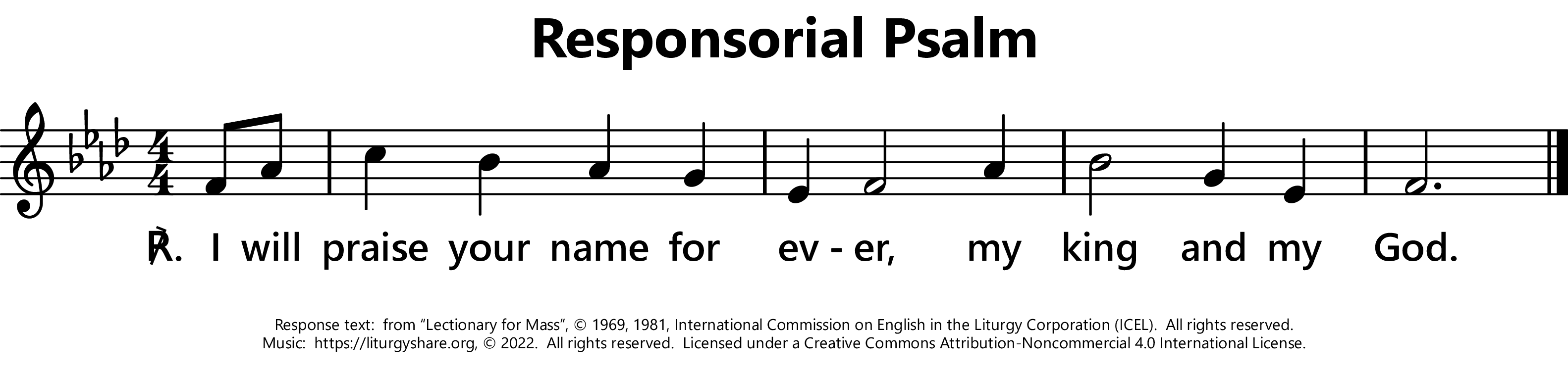 | ℟: | cf. Psalm 145 (144): 1 Benedicam nomini tuo in saeculum, Deus meus, rex. I will praise your name for ever, my king and my God. (Oz, US) I will bless your name for ever, my God and king. (UK) |