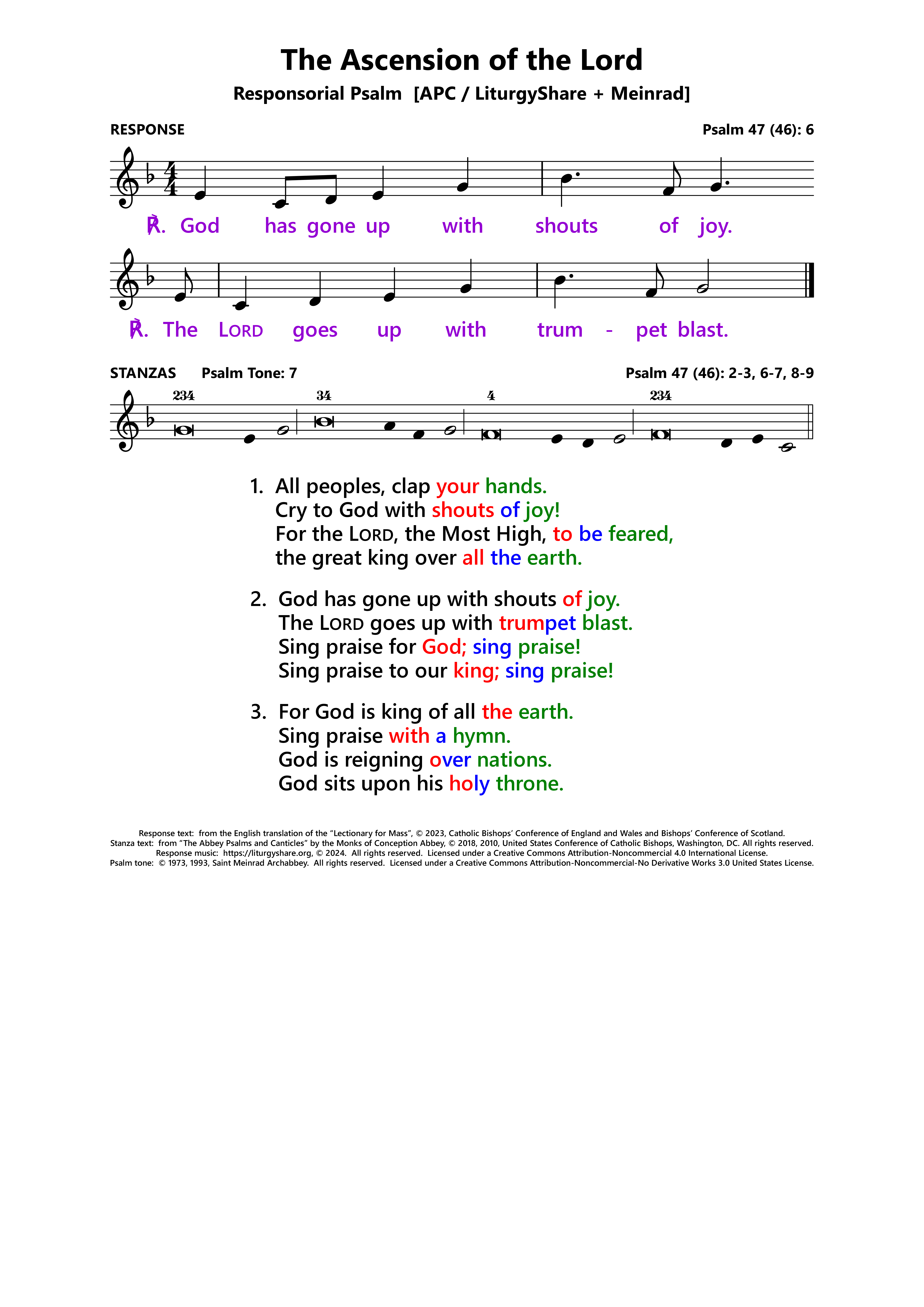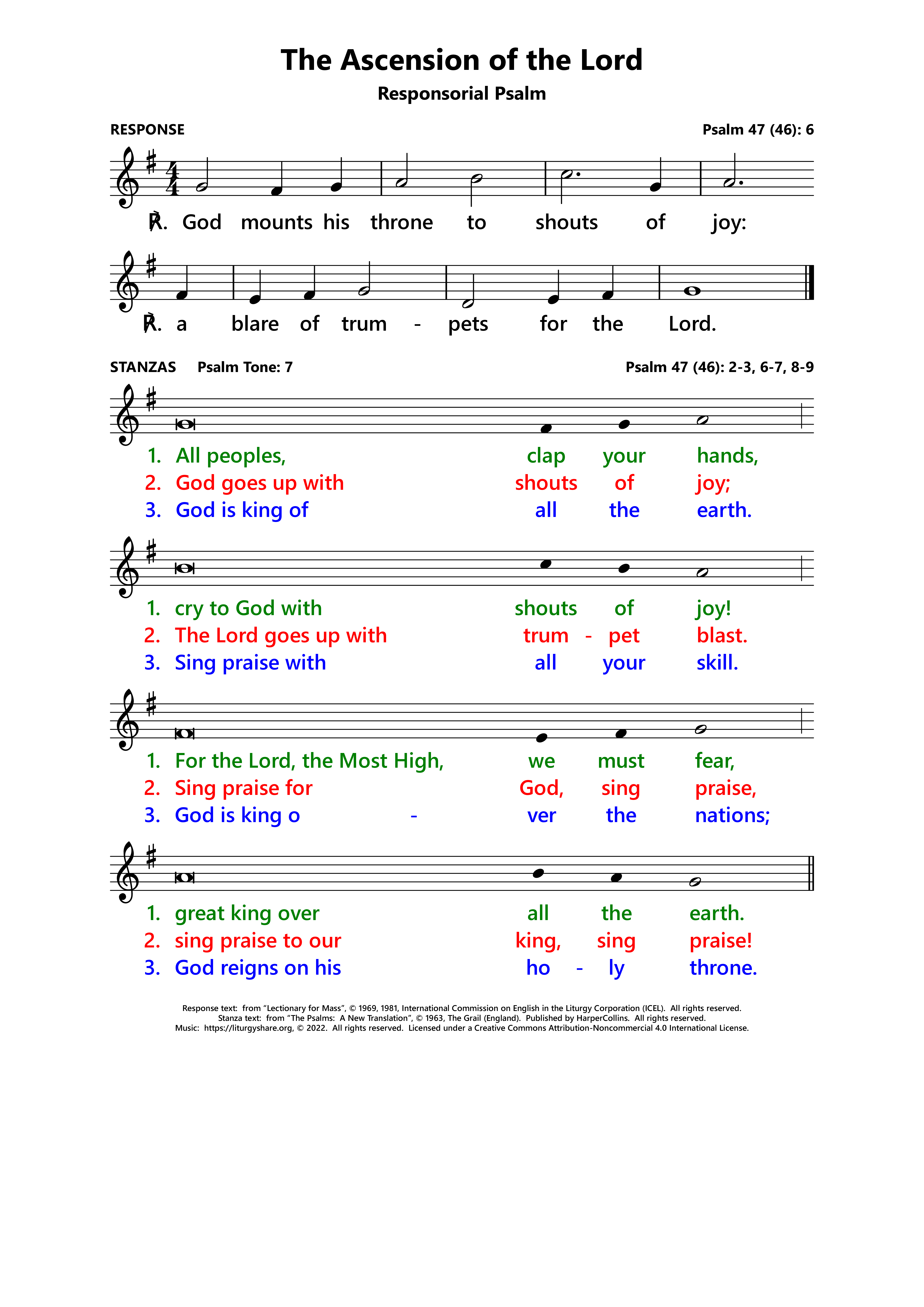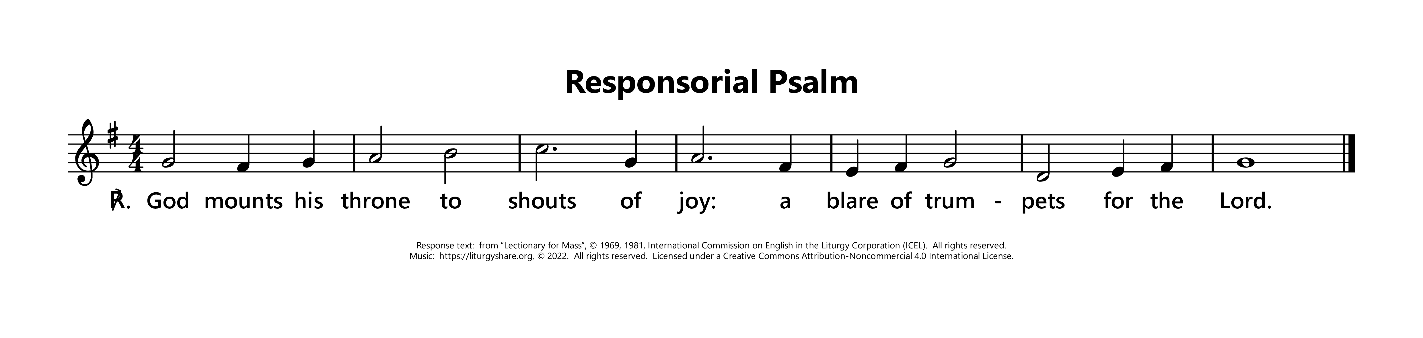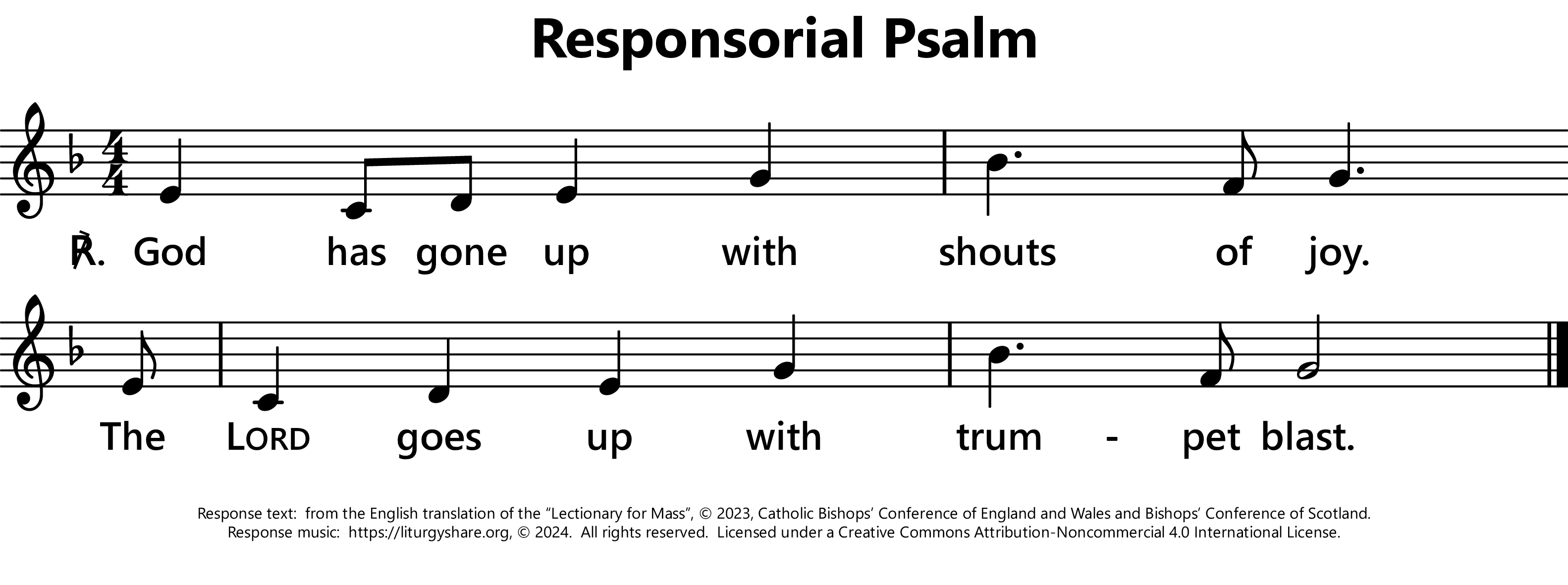 | ℟: | Psalm 47 (46): 6 Ascendit Deus in iubilo, et Dominus in voce tubae. God mounts his throne to shouts of joy: a blare of trumpets for the Lord. (Oz, US) God has gone up with shouts of joy. The Lord goes up with trumpet blast. (UK) |