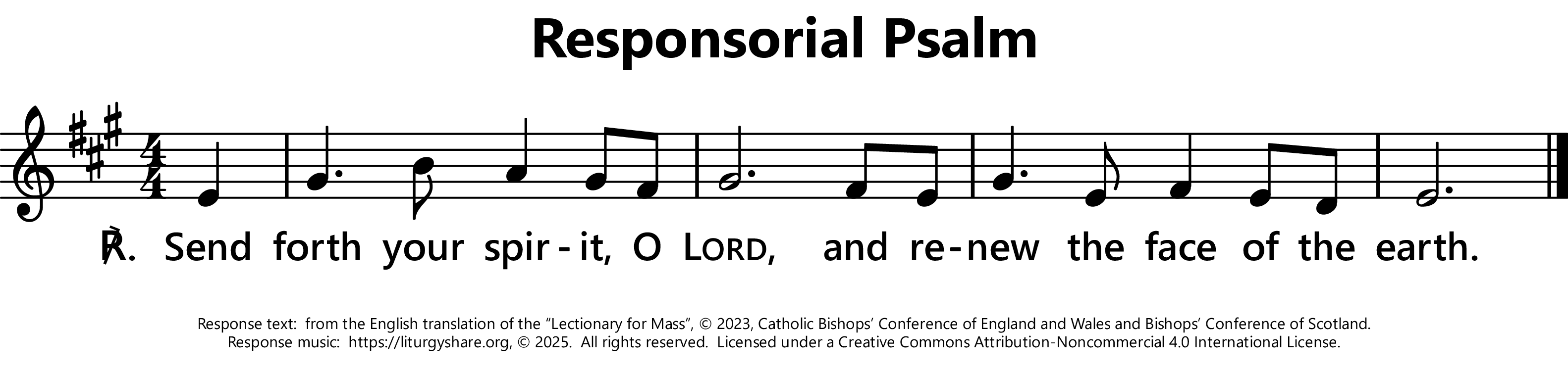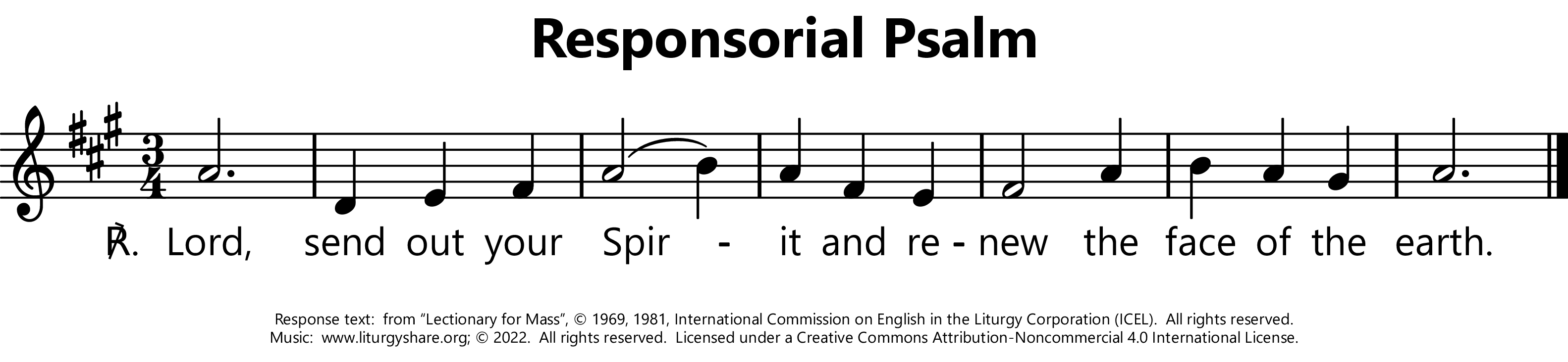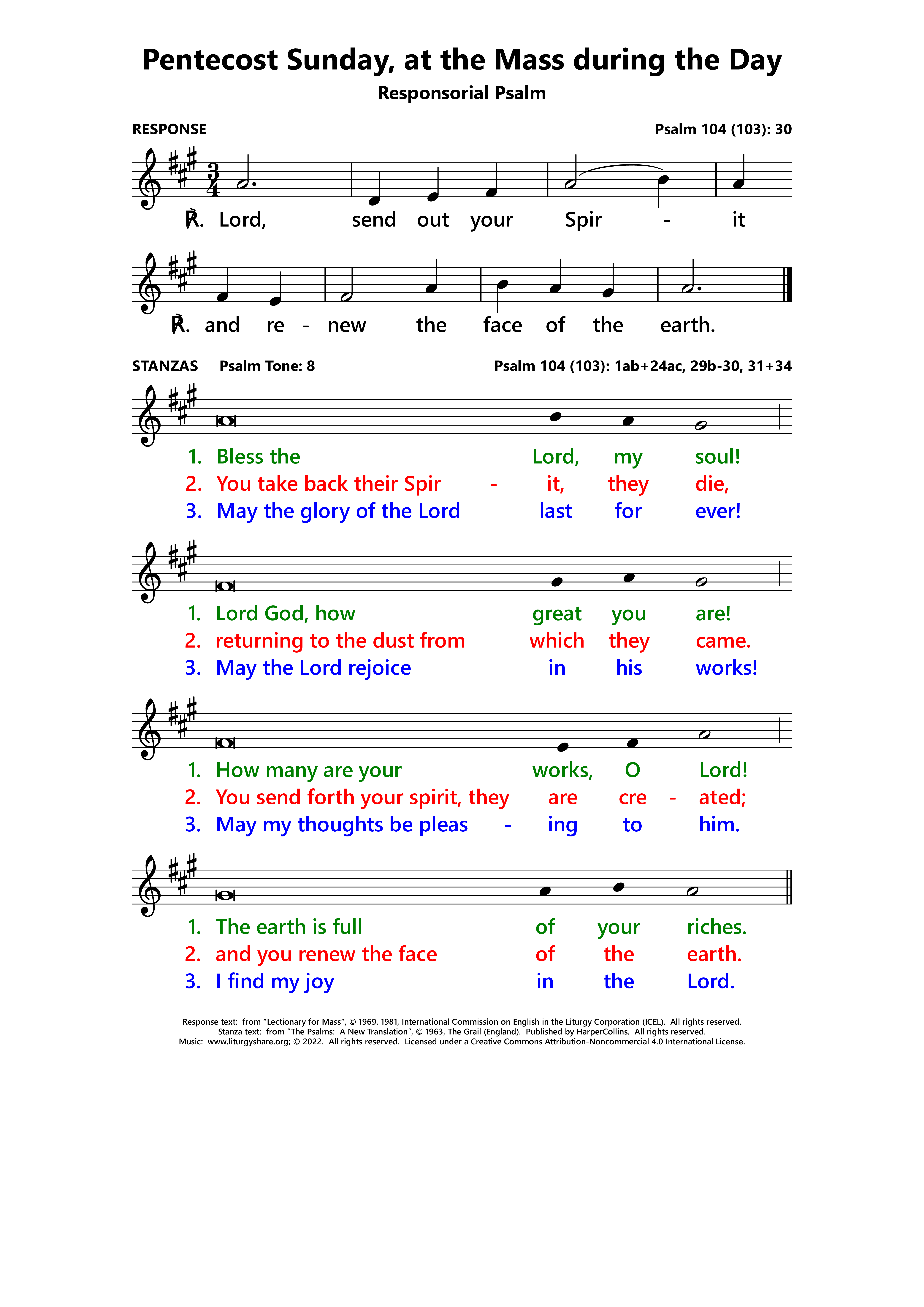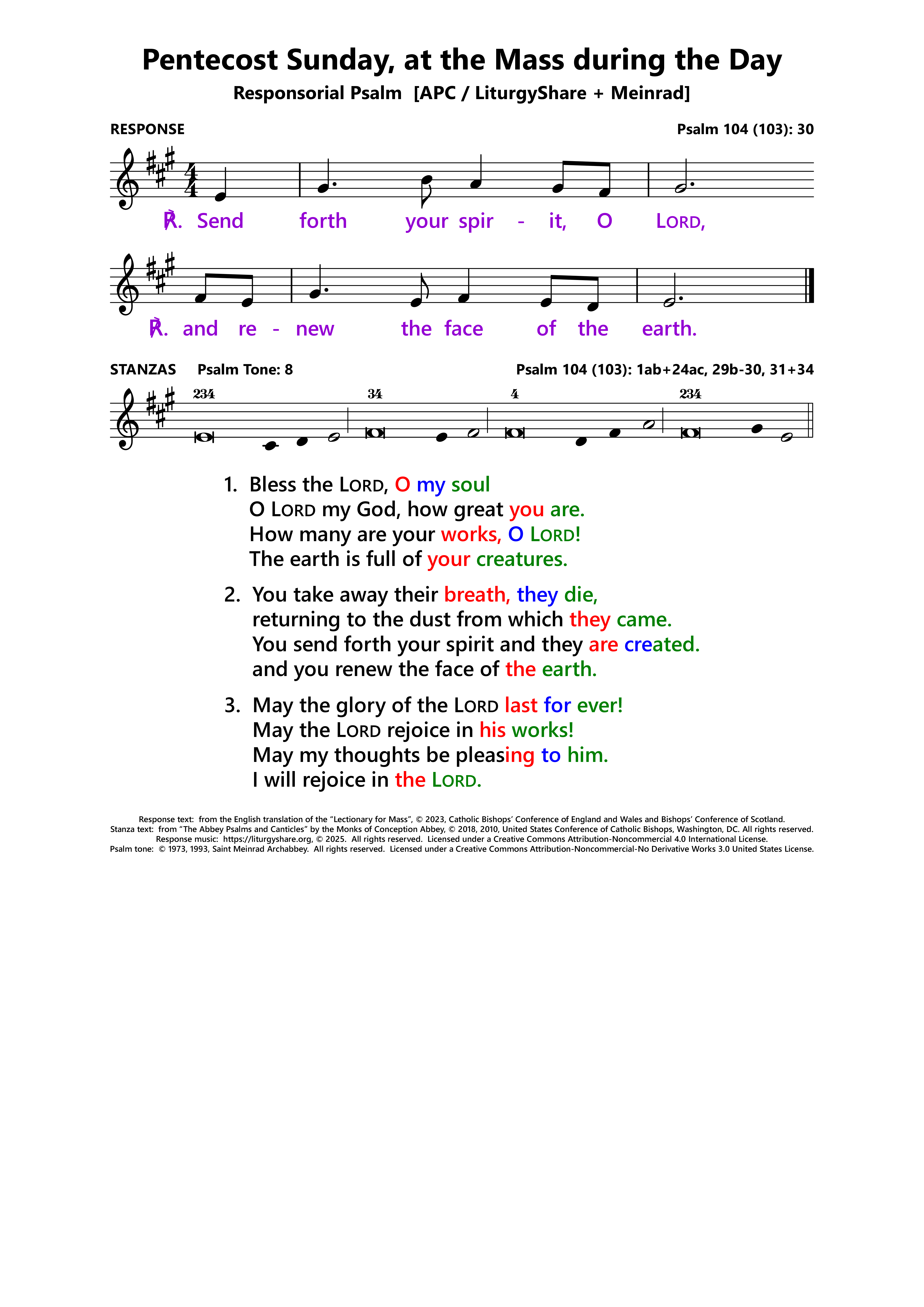 | ℟: | Psalm 104 (103): 30 Emitte Spiritum tuum, Domine, et renova faciem terrae. Lord, send out your Spirit, and renewthe face of the earth. (Oz, US) Send forth your Spirit, O Lord, and renew the face of the earth. (UK) |