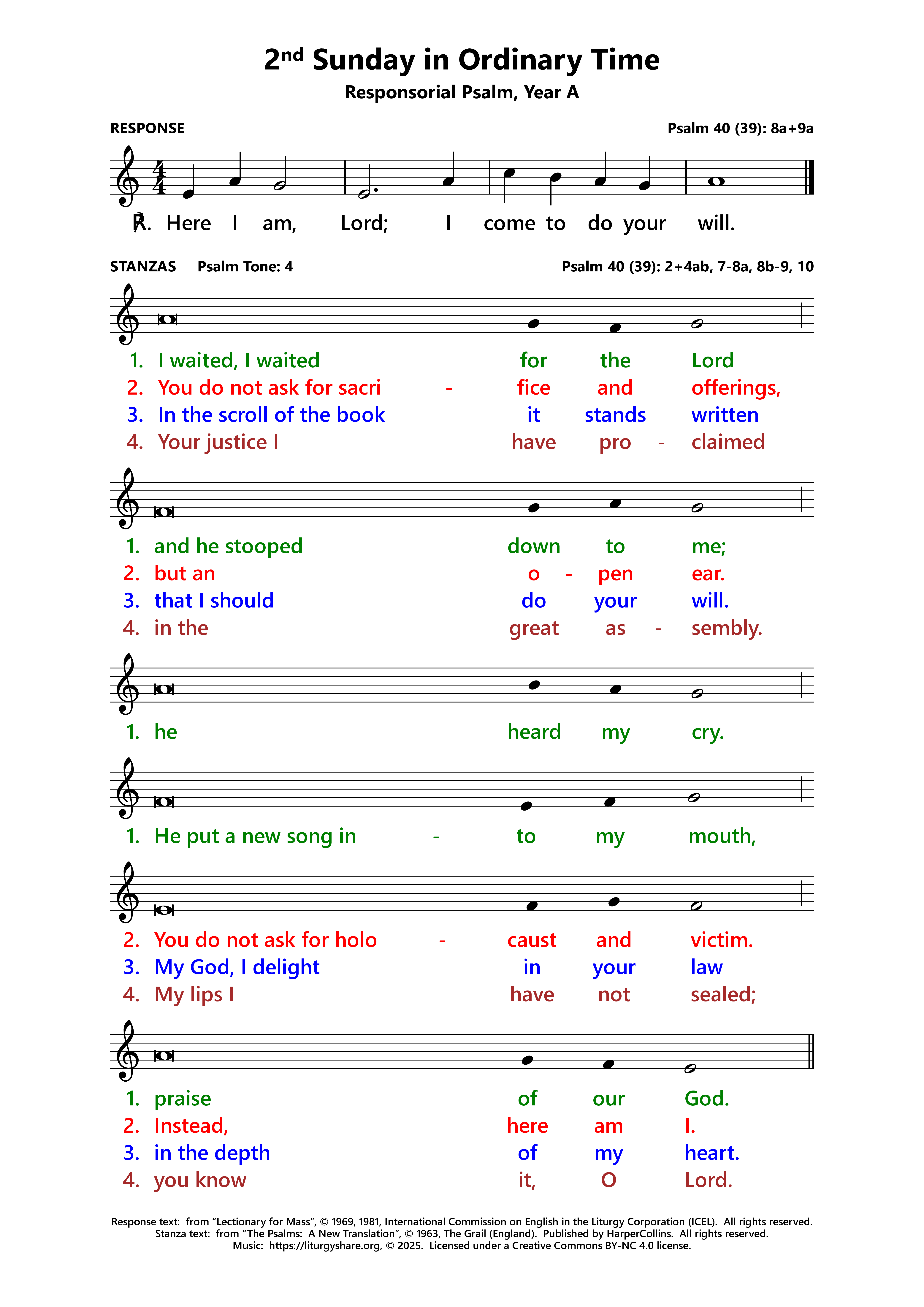 | ℟: | Psalm 40 (39): 8a+9a Ecce venio, Domine, facere voluntatem tuam. Here I am, Lord; I come to do your will. (Oz, US) Behold, I have come, Lord, to do your will. (UK) |