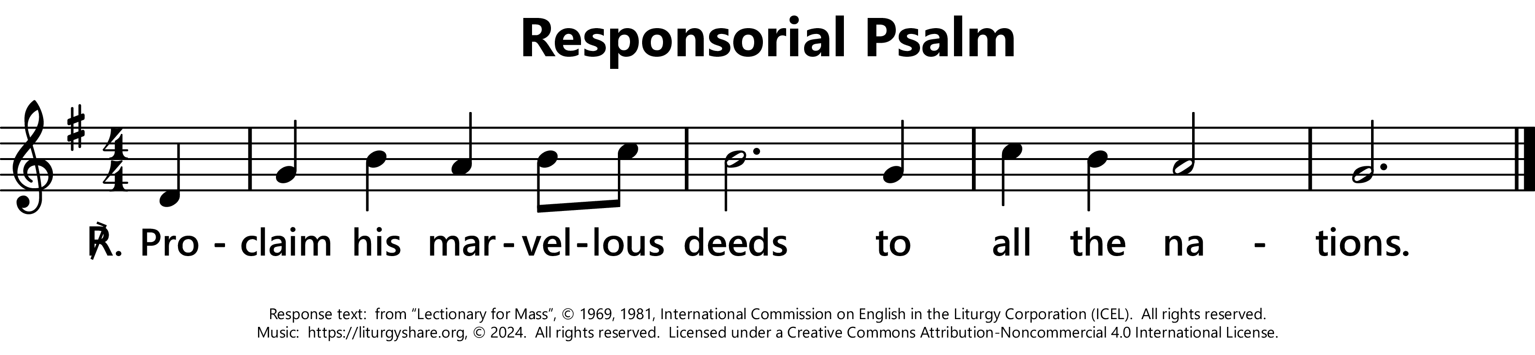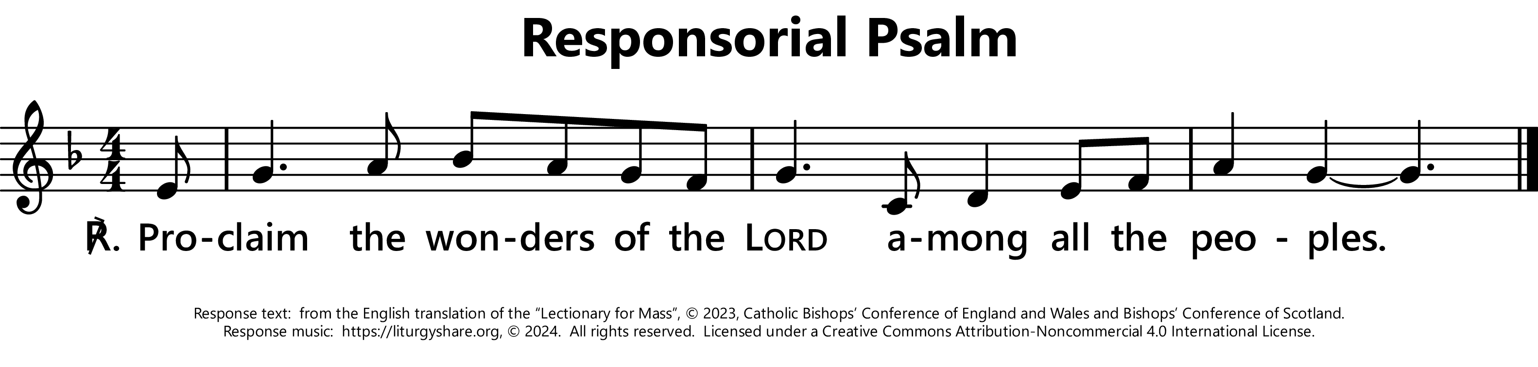 | ℟: | cf. Psalm 96 (95): 3 Annuntiate in omnibus populis mirabilia Domini. Proclaim his marvellous deeds to all the nations. (Oz, US) Proclaim the wonders of the Lord among all the peoples. (UK) |