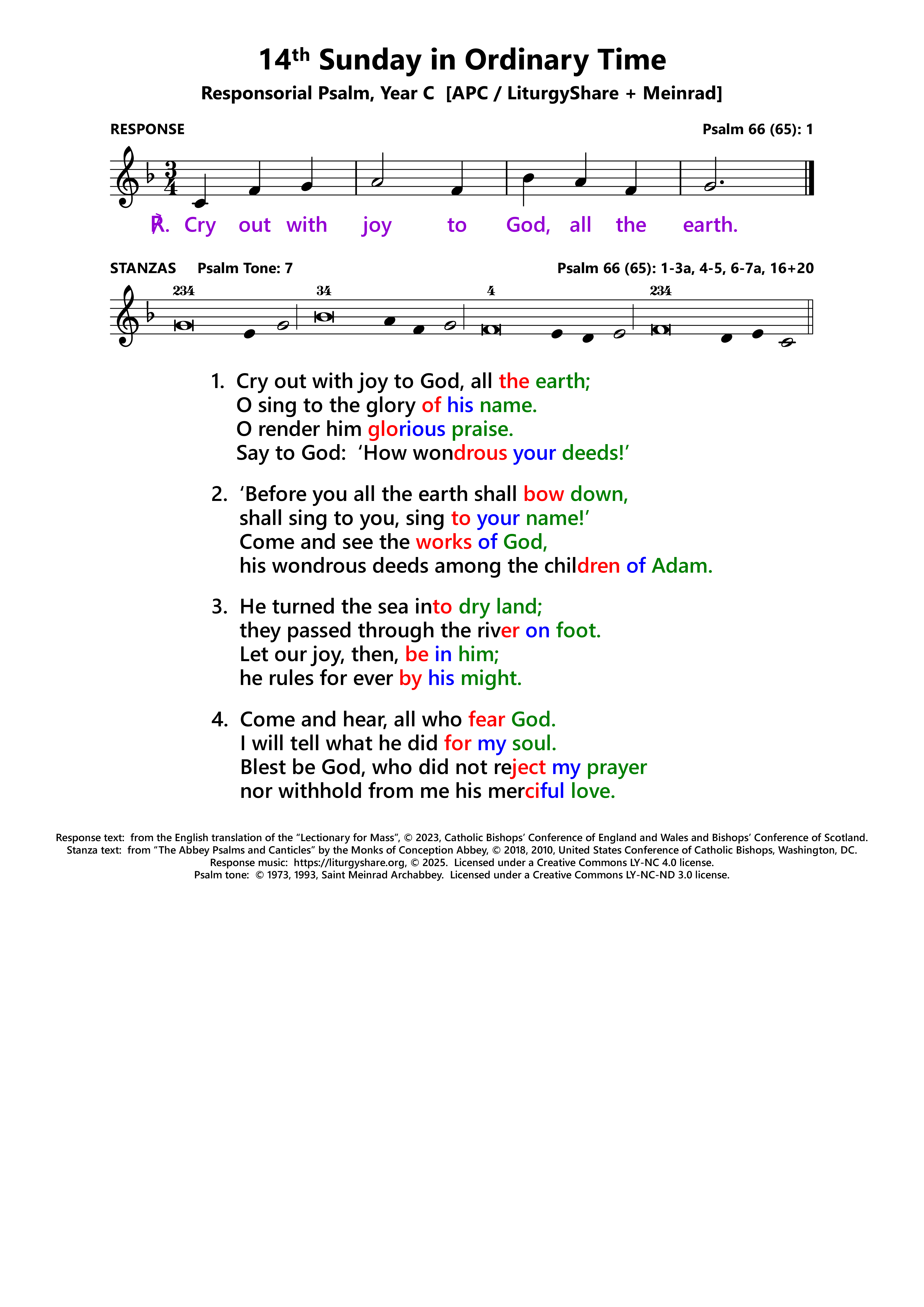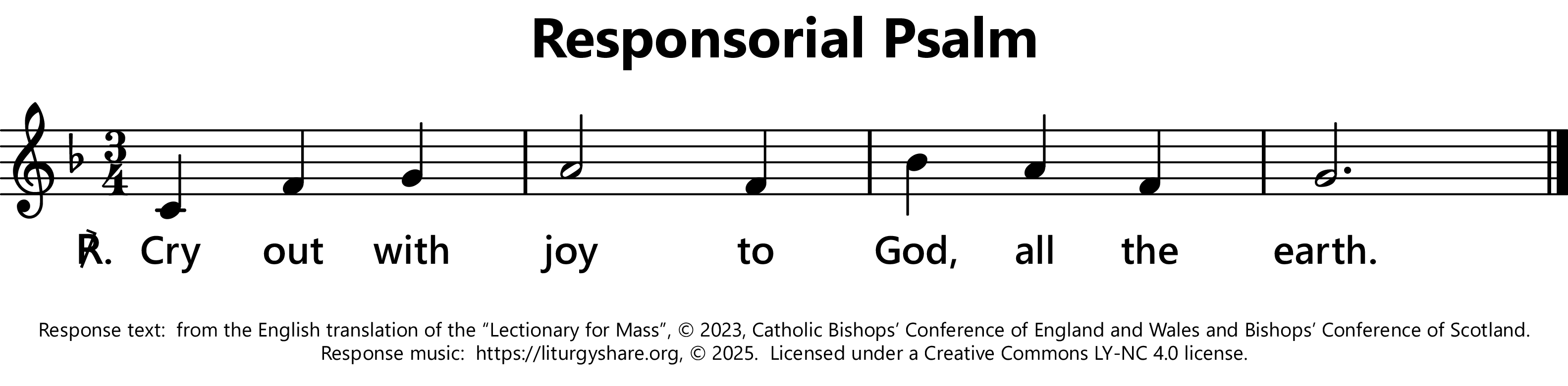 | ℟: | Psalm 66 (65): 1 Iubilate Deo omnis terra. Let all the earth cry out to God with joy. (Oz, US) Cry out with joy to God, all the earth. (UK) |