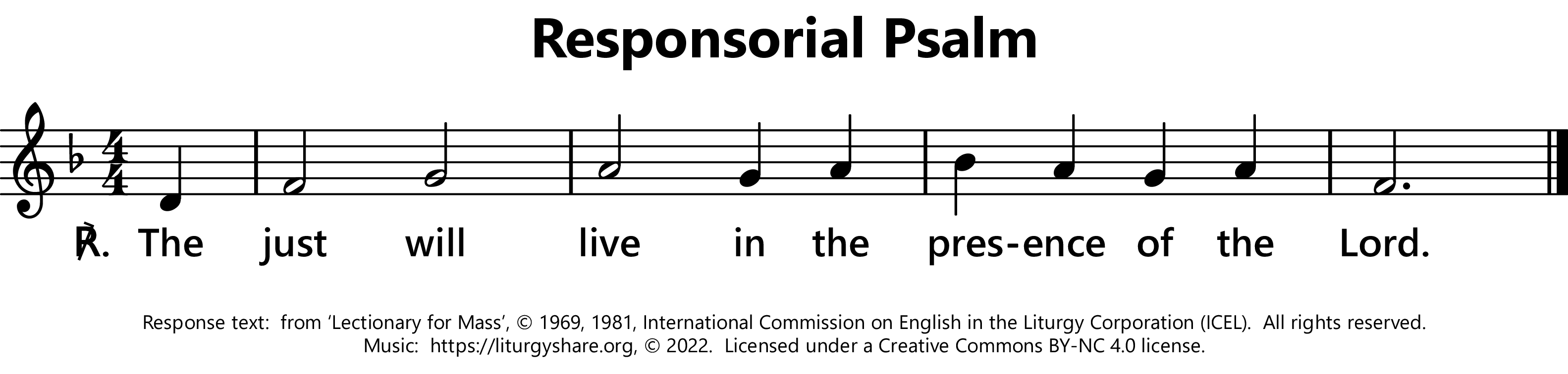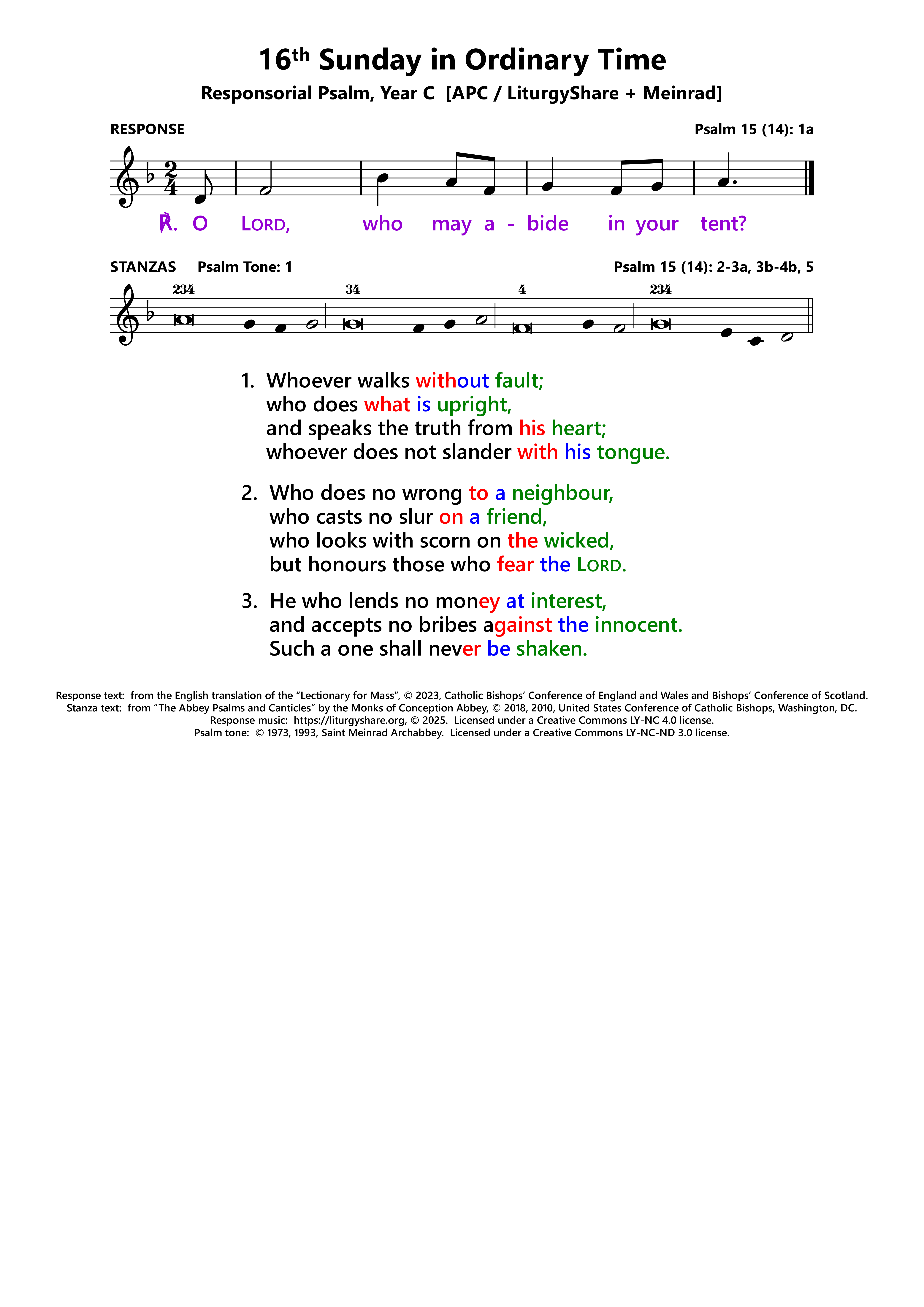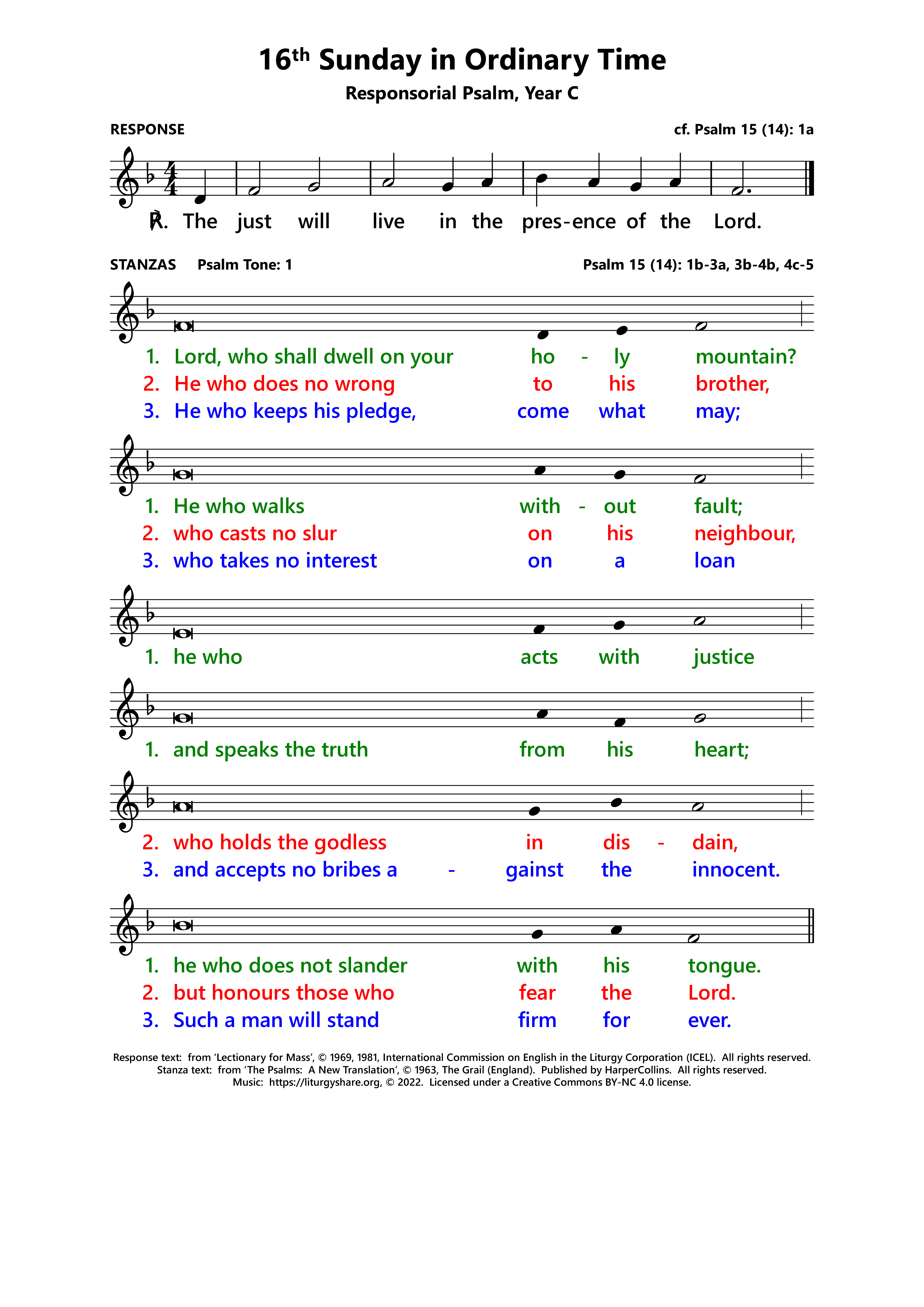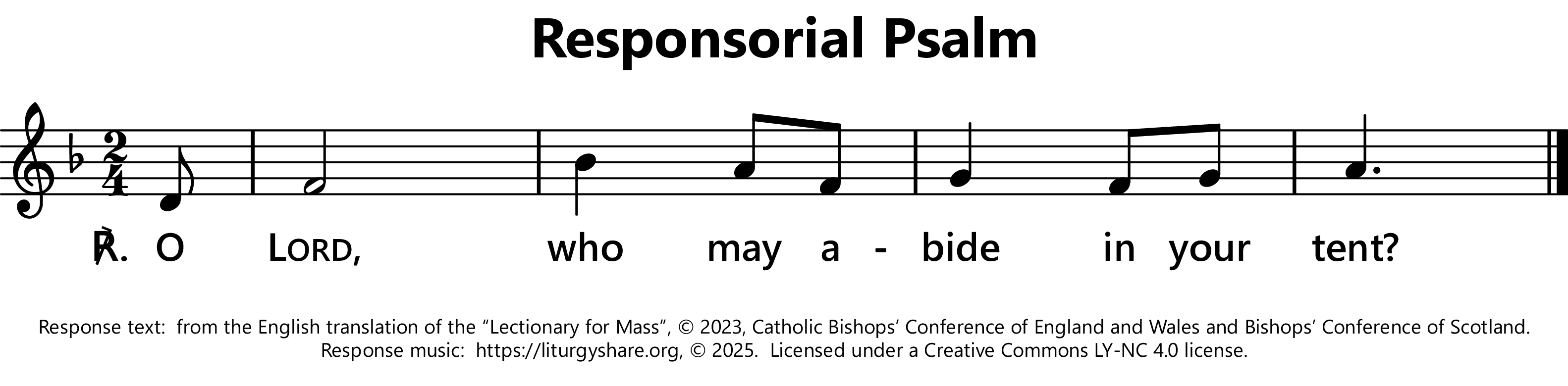 | ℟: | Psalm 15 (14): 1a Domine, quis habitabit in tabernaculo tuo? The just will live in the presence of the Lord. (Oz) He who does justice will live in the presence of the Lord. (US) O Lord, who may abide in your tent? (UK) |