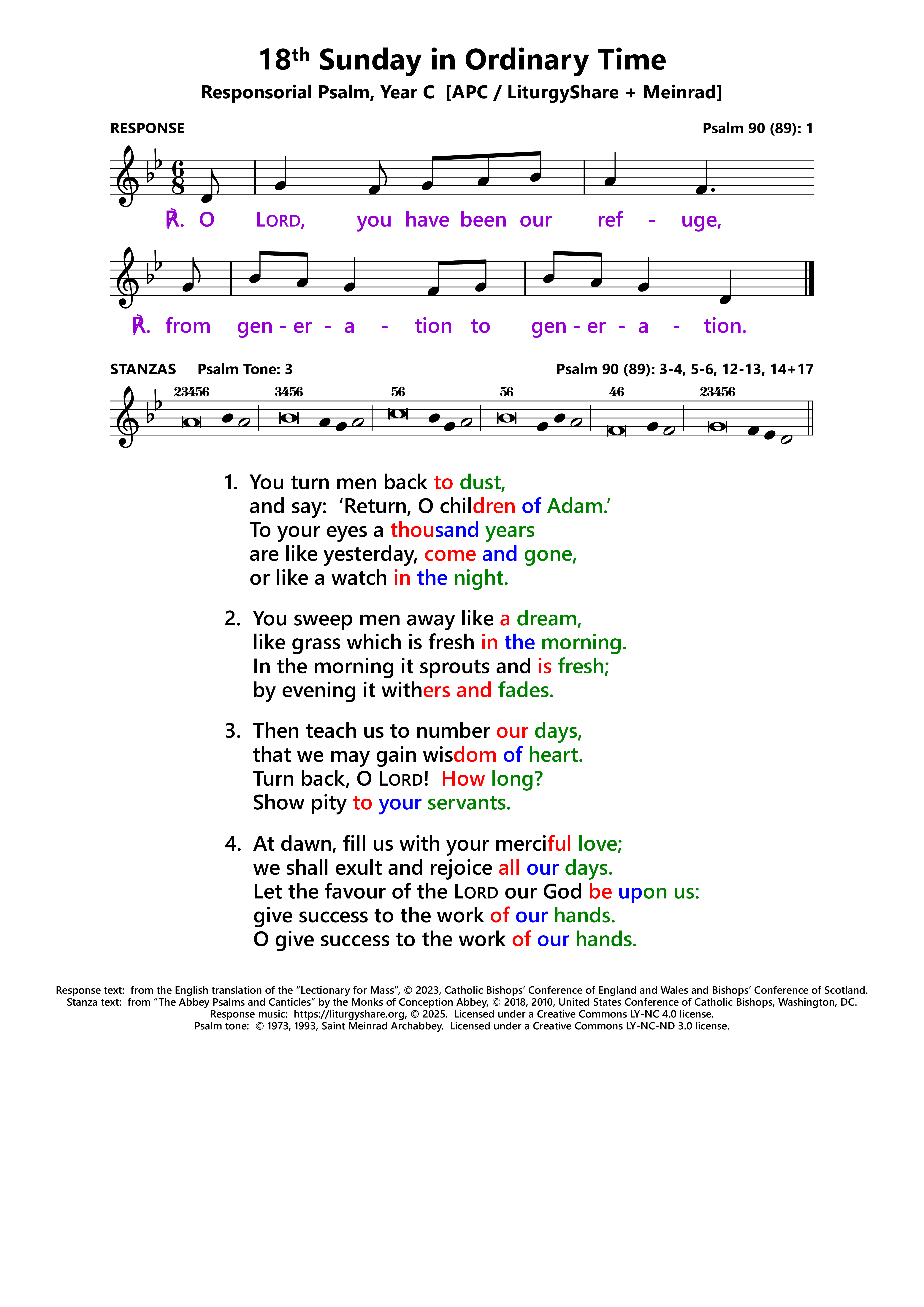 | ℣: | Psalm 90 (89): 3-4, 5-6, 12-13, 14+17 Psalm 90 (89): 3-4, 5-6, 12-13, 14+17ab (Oz) |