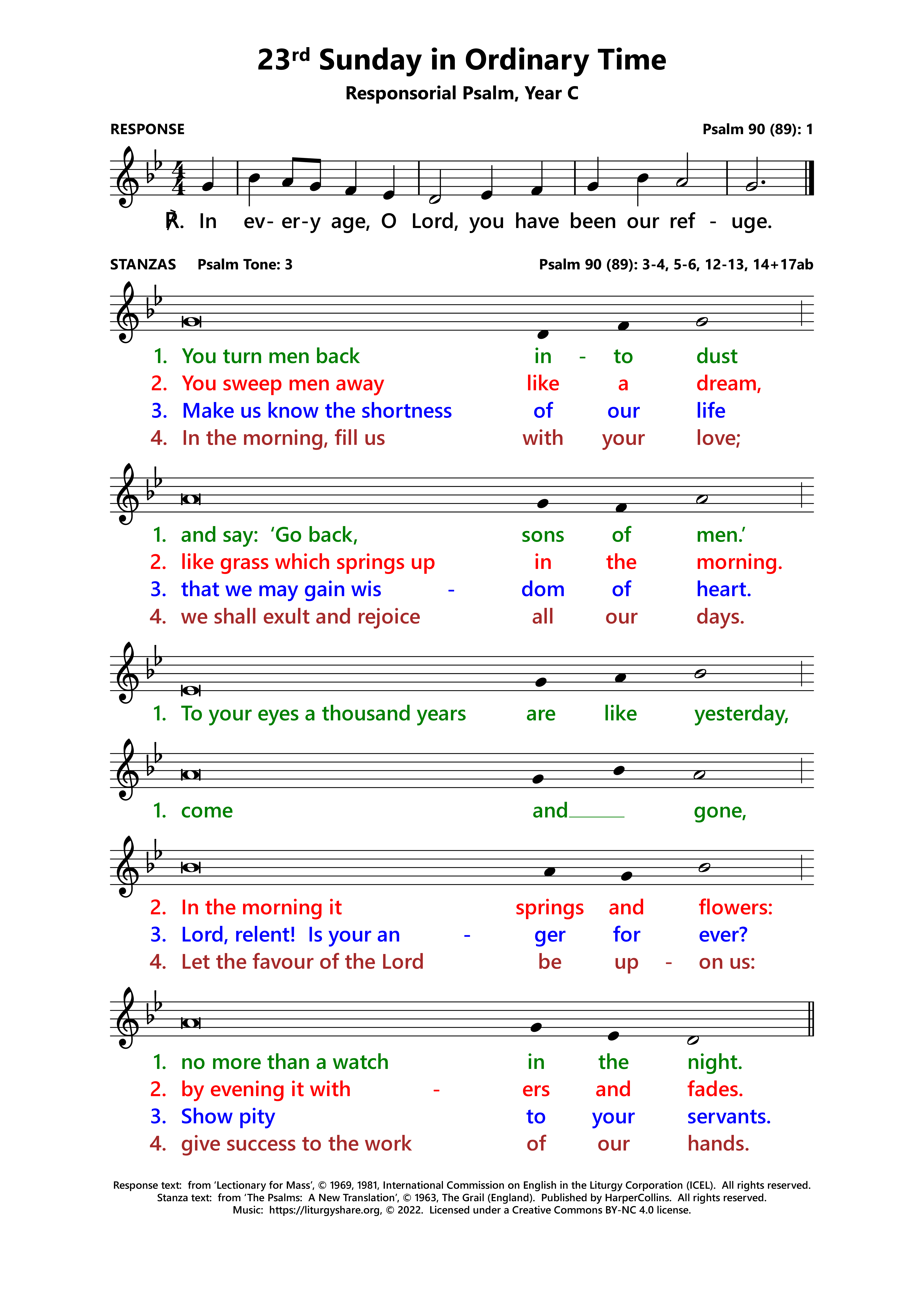 | ℣: | Psalm 90 (89): 3-4, 5-6, 12-13, 14+17 Psalm 90 (89): 3-4, 5-6, 12-13, 14+17ab (Oz) |