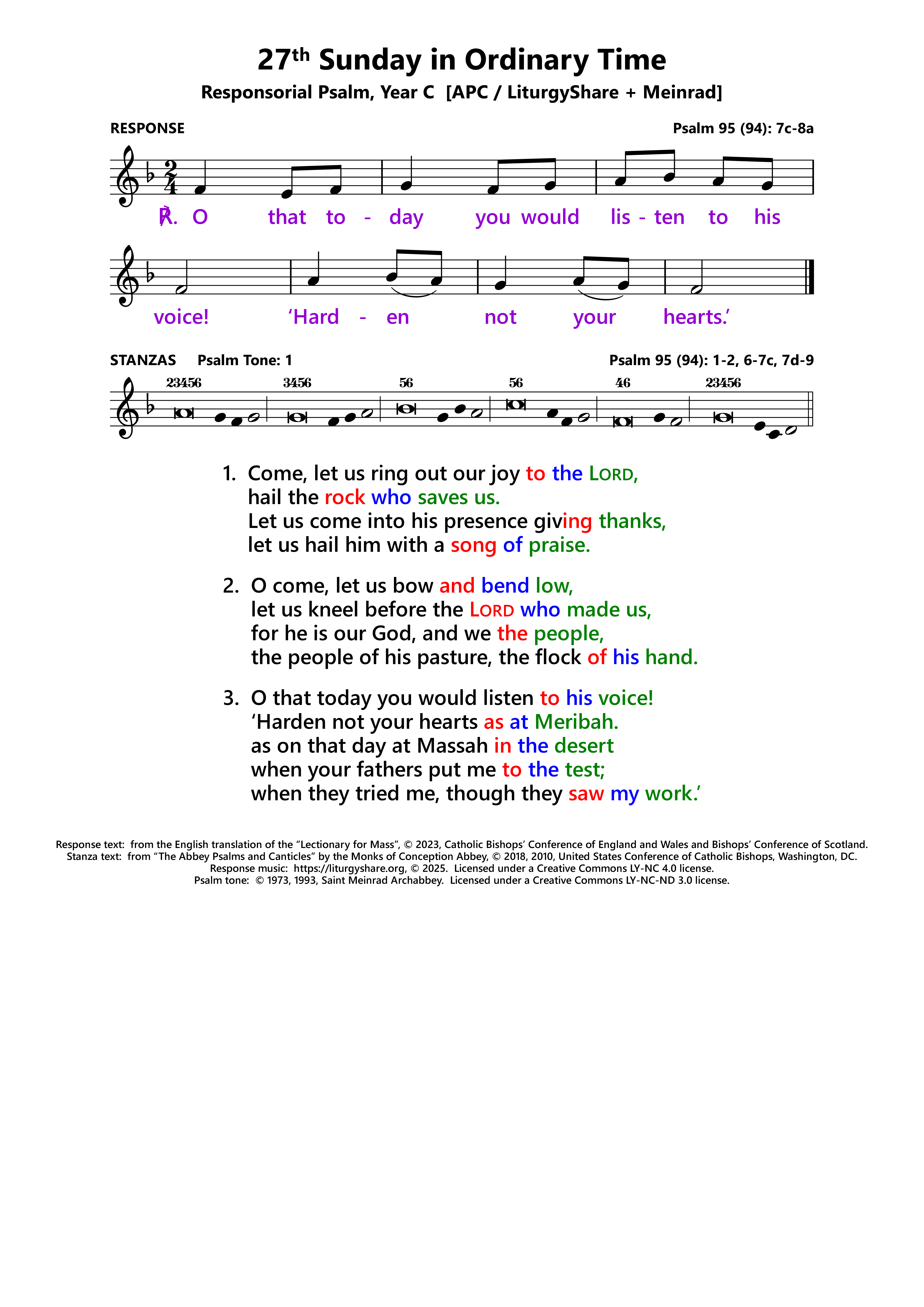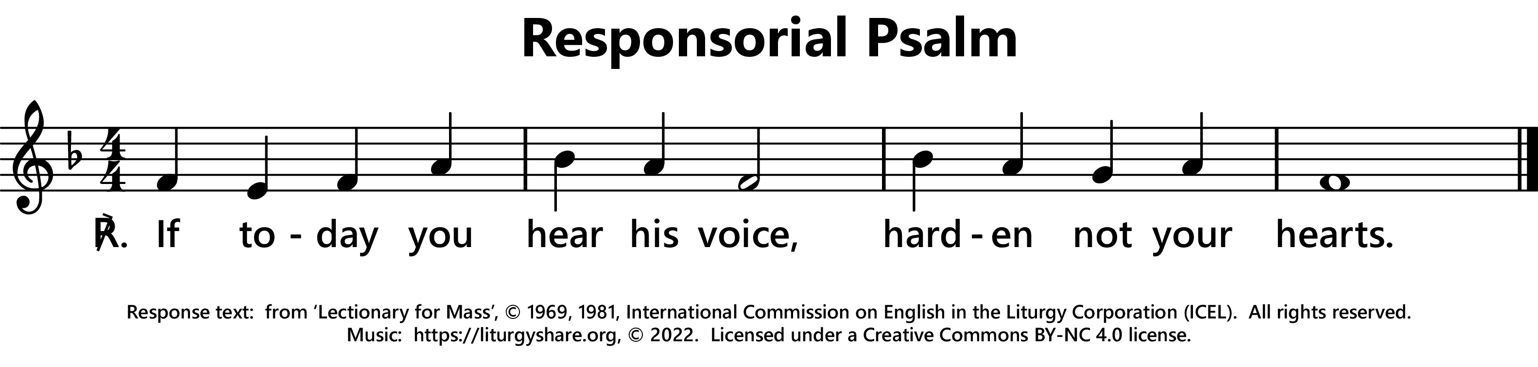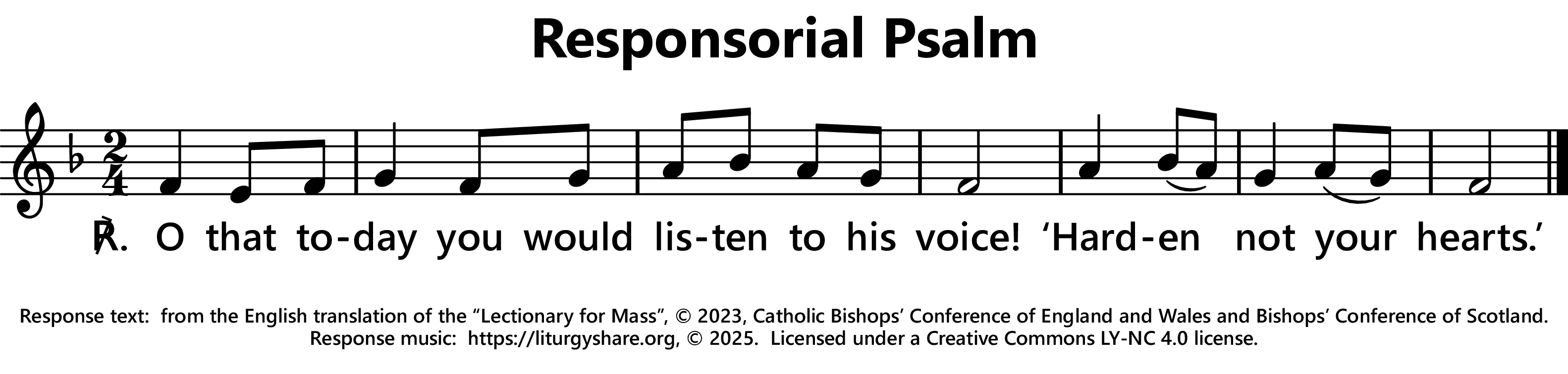 | ℟: | cf. Psalm 95 (94): 7c-8a. Utinam hodie vocem Domini audiatis: ‘Nolite obdurare corda vestra’. If today you hear his voice, harden not your hearts. (Oz, US) O that today you would listen to his voice! ‘Harden not your hearts.’ |