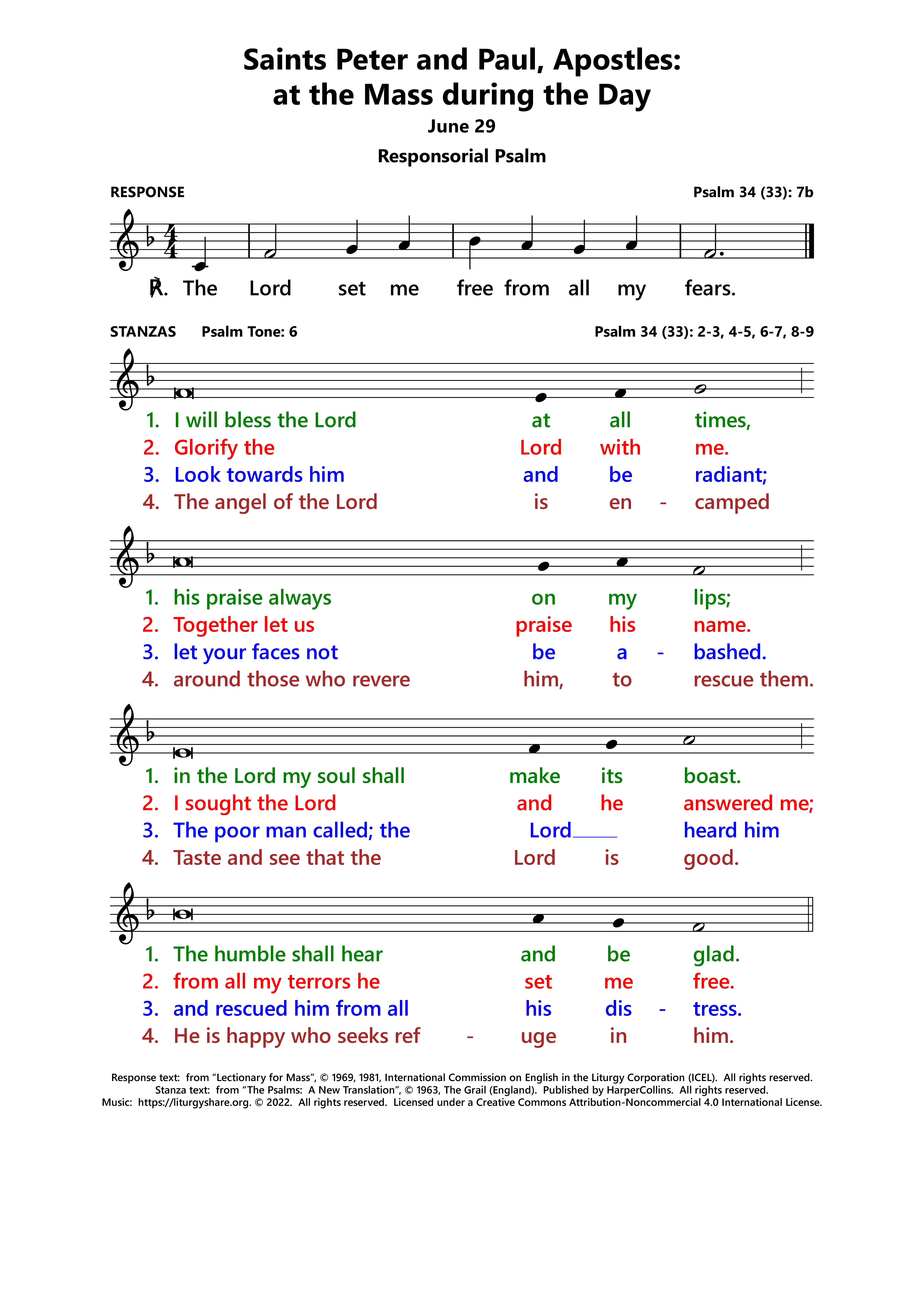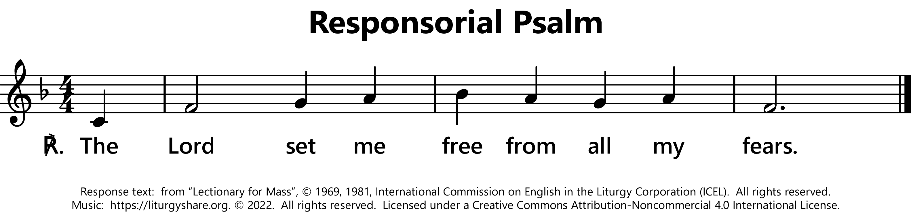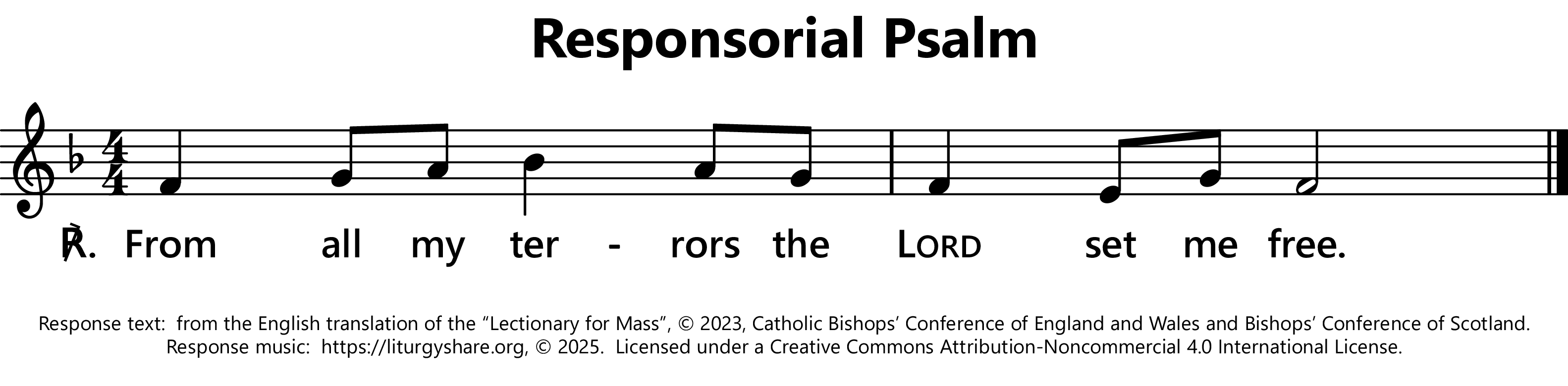 | ℟: | Psalm 34 (33): 7b Ex omnibus terroribus meis eripuit me Dominus. The Lord set me free from all my fears. (Oz) The angel of the Lord will rescue those who fear him. (US) From all my terrors the Lord set me free. (UK) |