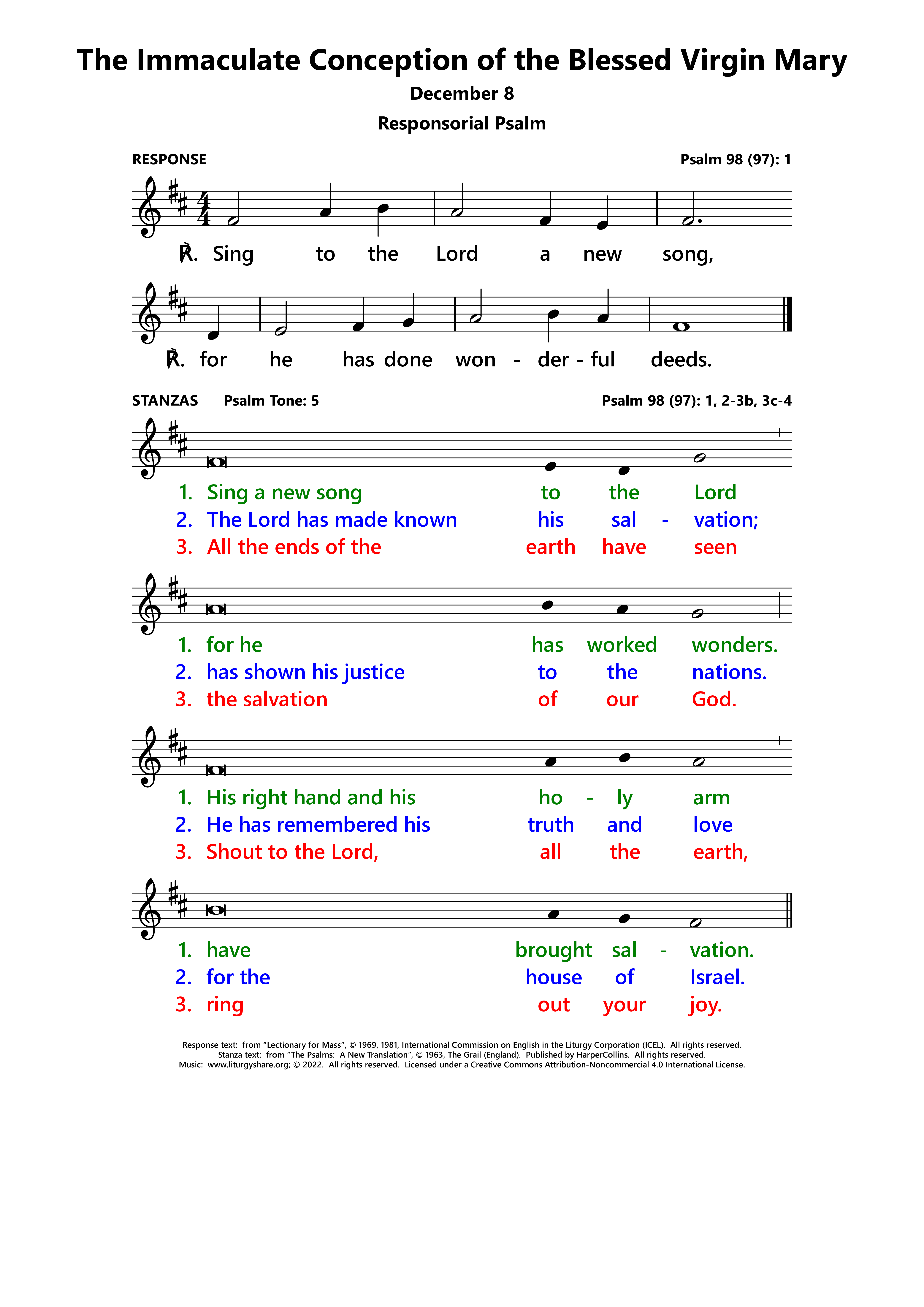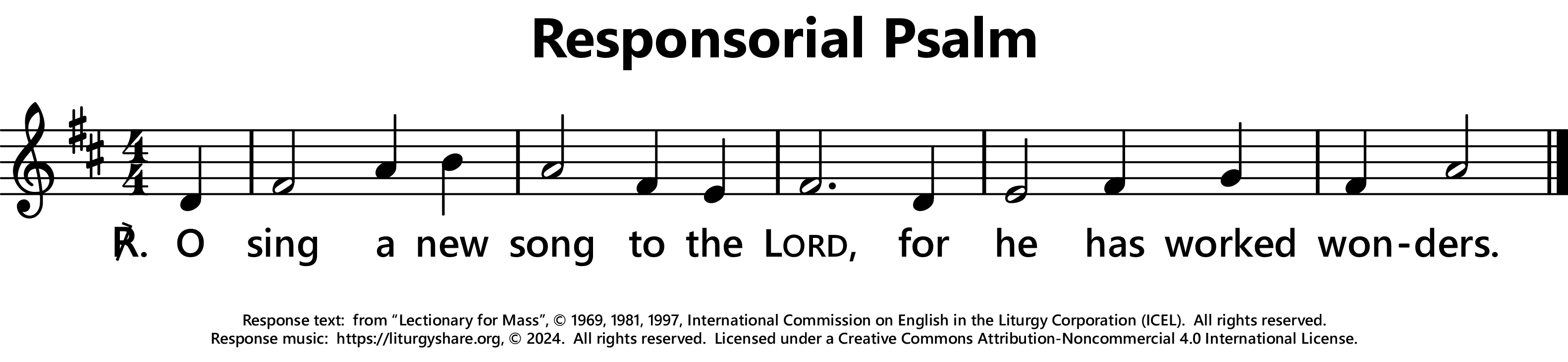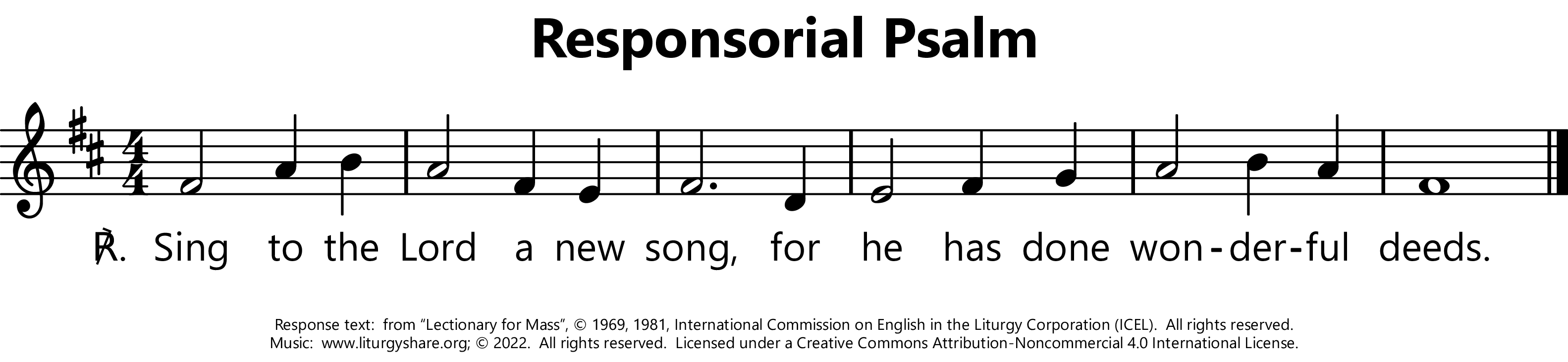 | ℟: | Psalm 98 (97): 1ab Cantate Domino canticum novum, quia mirabilia fecit. Sing to the Lord a new song, for he has done wonderful deeds. (Oz) Sing to the Lord a new song, for he has done marvellous deeds. (US) O sing a new song to the Lord, for he has worked wonders. (UK) |